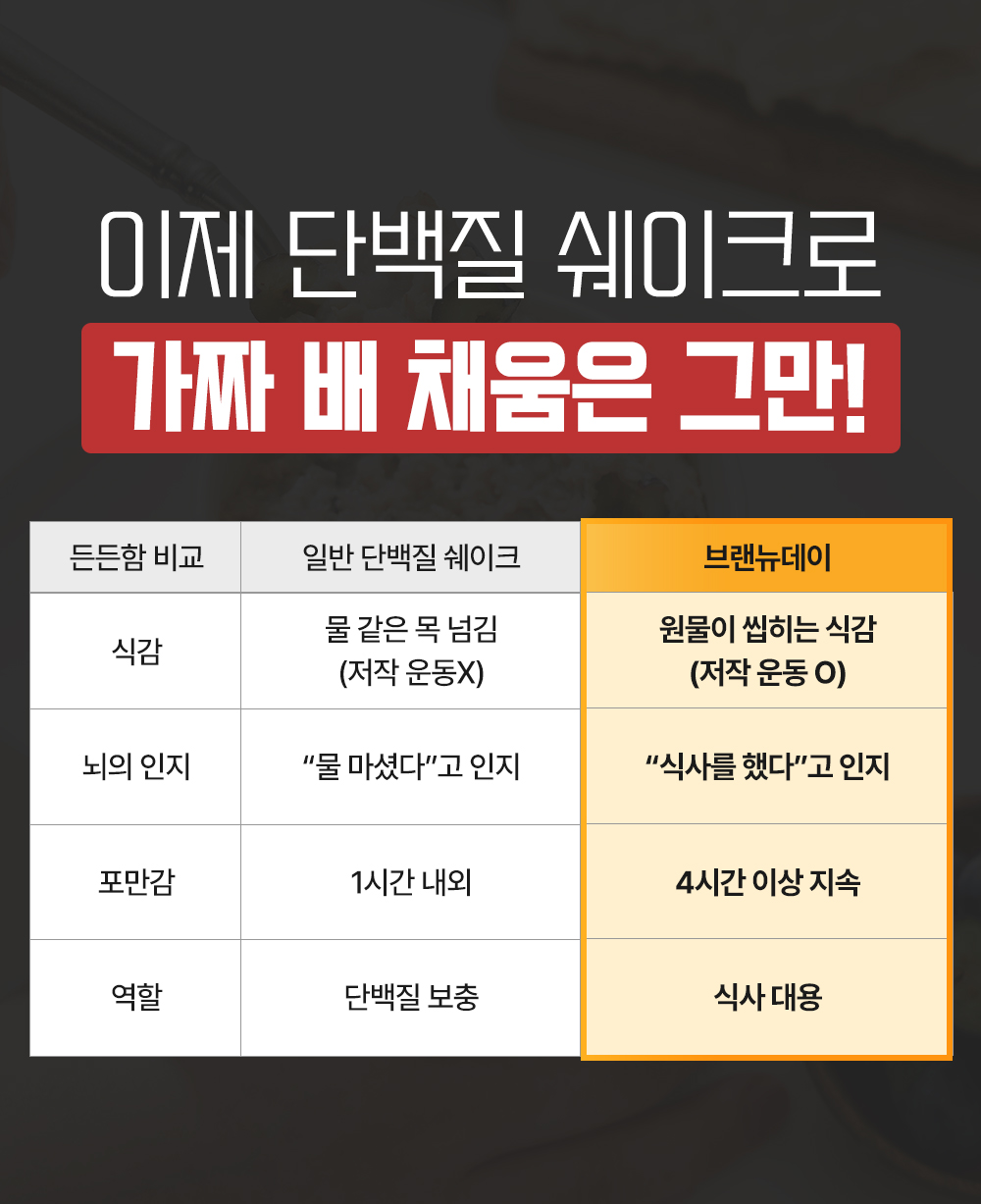 액체로 된 단백질 쉐이크는 소화 속도가 빨라 위장을 스쳐 지나갑니다. '물배'는 금방 꺼지고 결국 점심 전에 다른 간식을 찾게 되죠. 제대로 된 '식사'라면 씹는 맛이 있어야 하고, 배가 불러야 합니다.