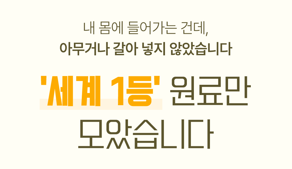 저렴한 중국산 원료나 출처를 알 수 없는 재료를 섞어 단가를 낮추는 일, 우리는 하지 않습니다.내 입에, 내 가족 입에 들어가는 것이기에 전 세계에서 가장 인정받는 프리미엄 산지의 원료만을 고집스럽게 공수했습니다.