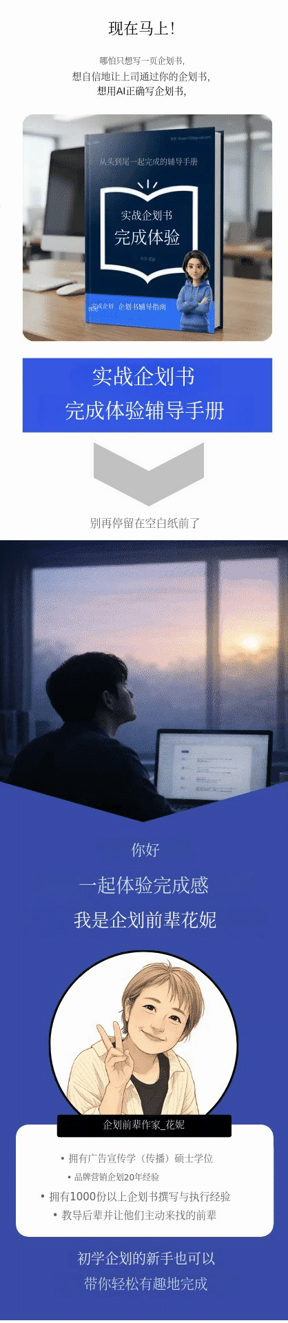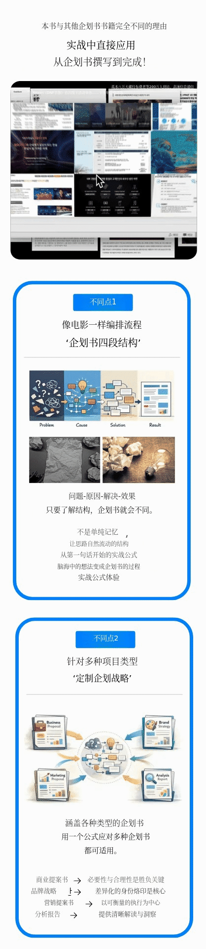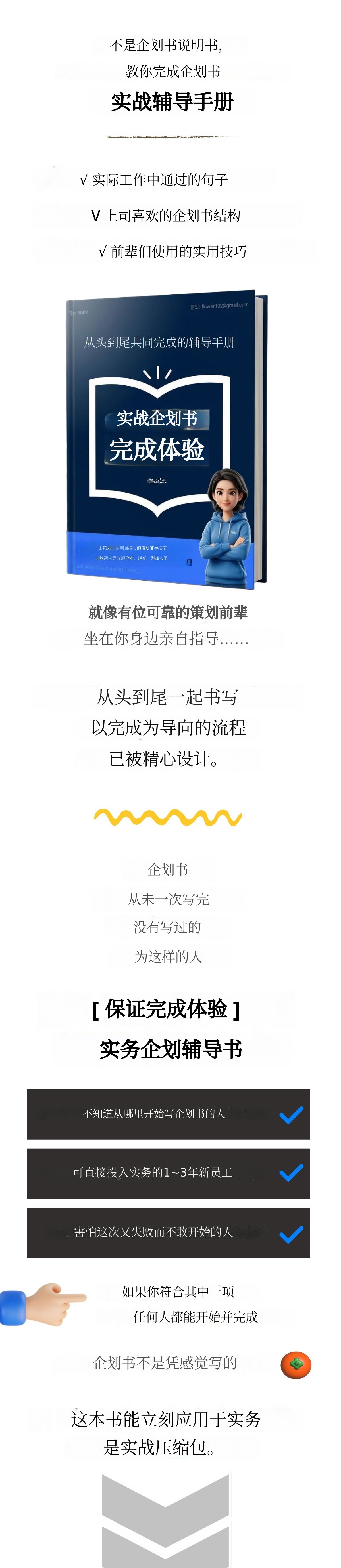 1. 📘 实战企划书完成辅导书 - 从开始到完成分阶段辅导企划书写作 2. 🧩 逻辑四步结构方法 - 问题-原因-解决-效果流程提升完成度 3. 🎁 限量套装福利 - 包含电子书、模板和检查表