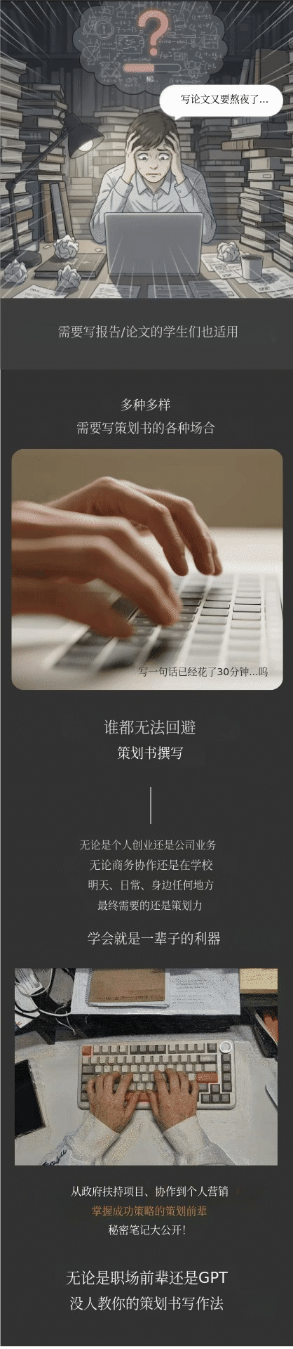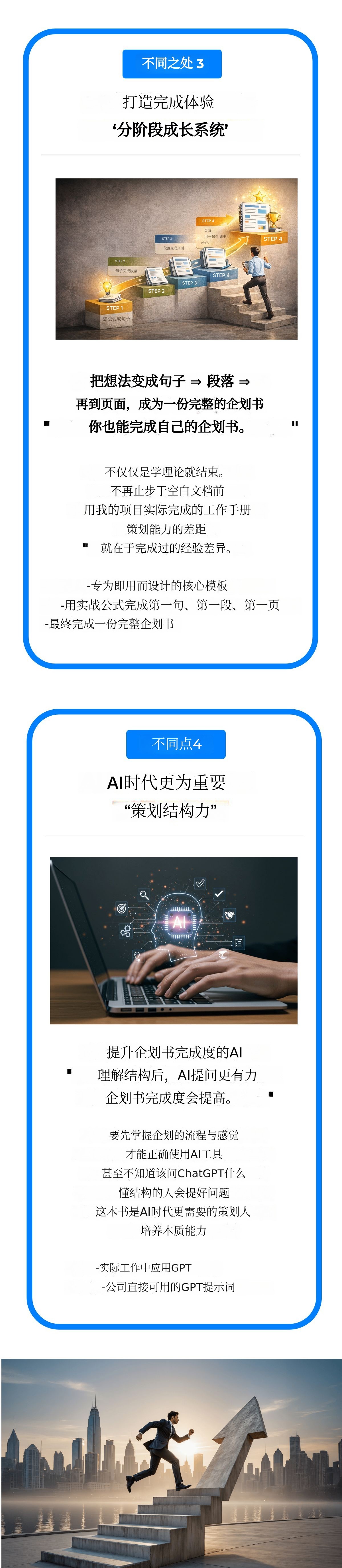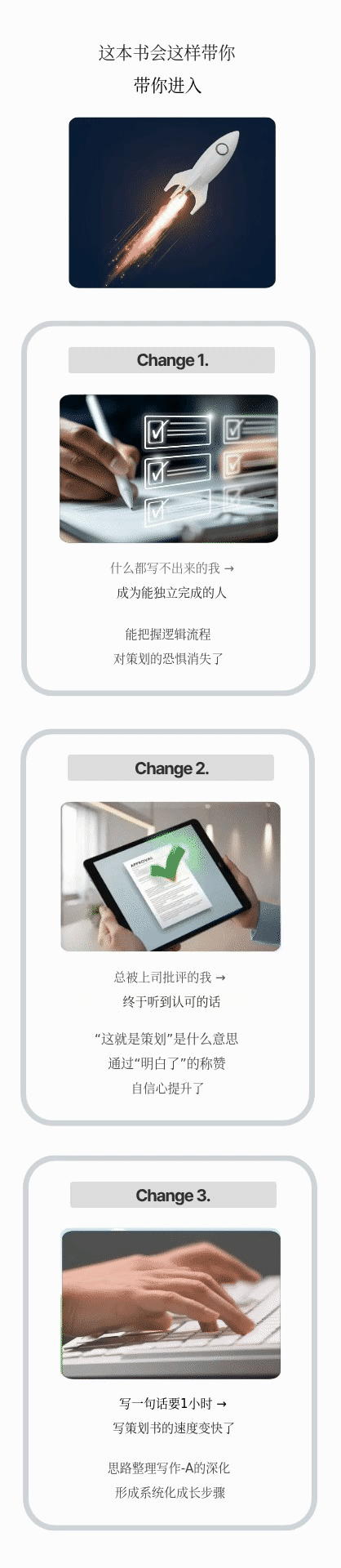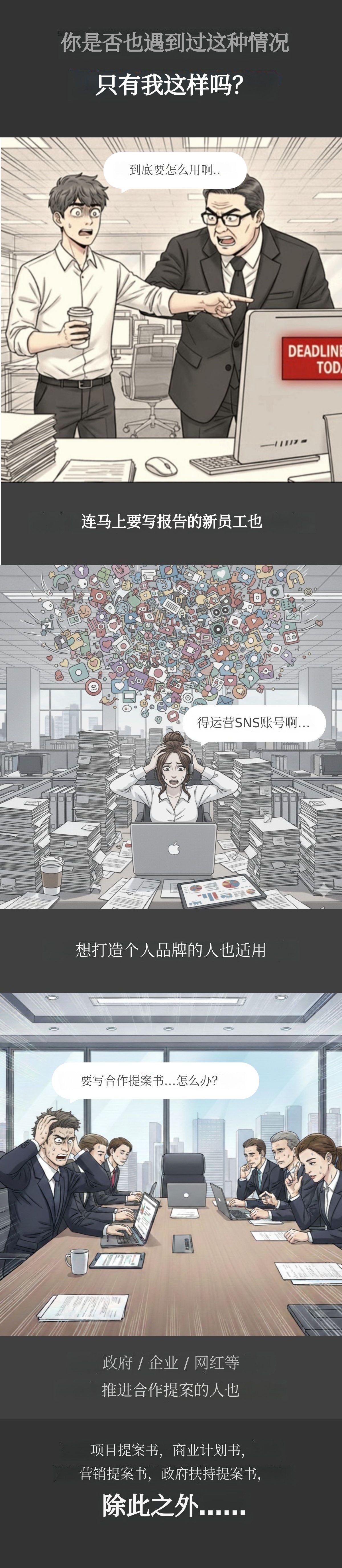 1. 📘 实战企划书完成辅导书 - 从开始到完成分阶段辅导企划书写作 2. 🧩 逻辑四步结构方法 - 问题-原因-解决-效果流程提升完成度 3. 🎁 限量套装福利 - 包含电子书、模板和检查表