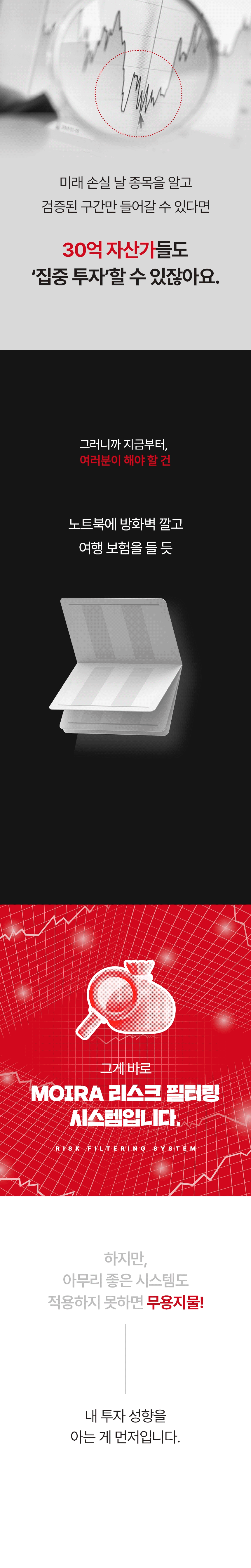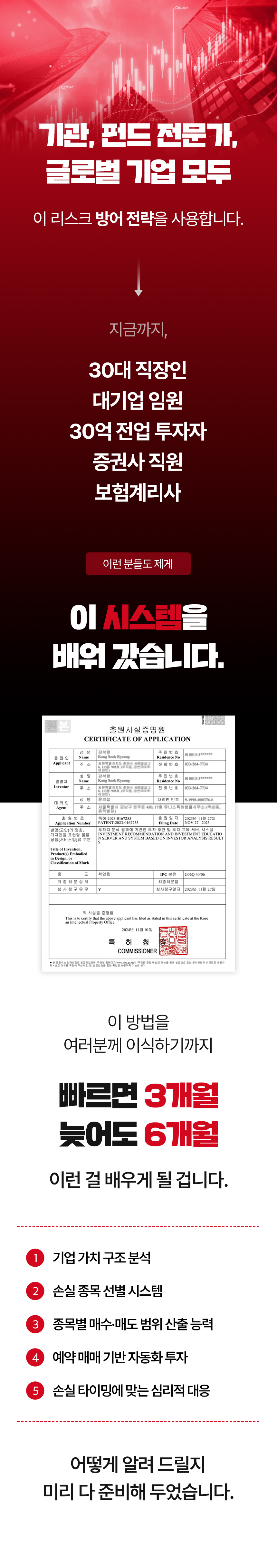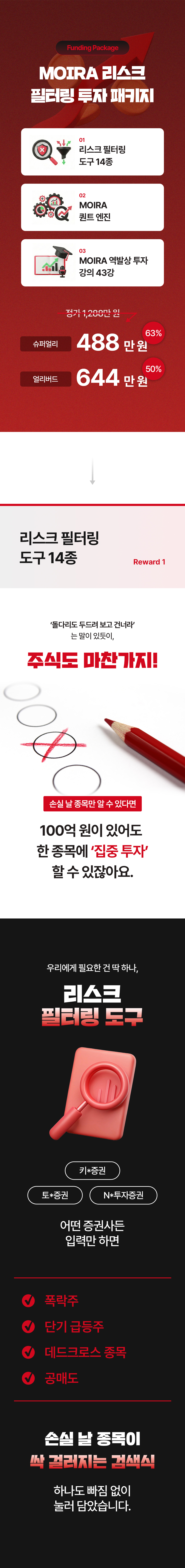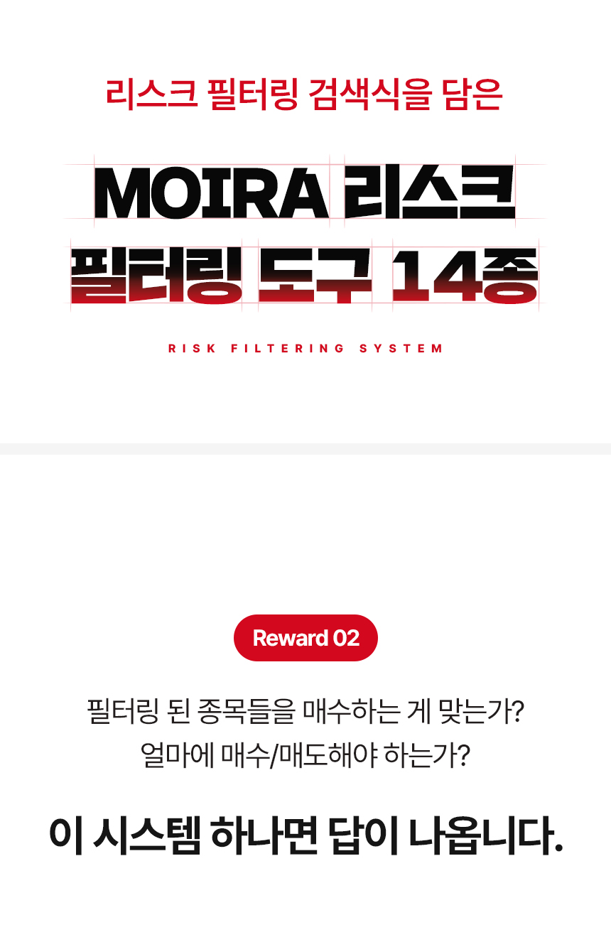 하지만 보통 ‘수익’ 내게 해 준다는 이야기를 하고 있고, 리스크 방어 전략을 다루는 강의는 없었습니다. 이 점을 안타깝게 생각하며 이번 프로젝트를 준비했습니다. 이 펀딩은 손실, 물림으로 인한 기회비용을 줄이는 데 초점을 맞추고 있습니다. 손실을 회피하고 투자자 수익의 안전성을 높여 주는 리스크 필터링 시스템, 공식적으로는 와디즈에서 처음 선보입니다.