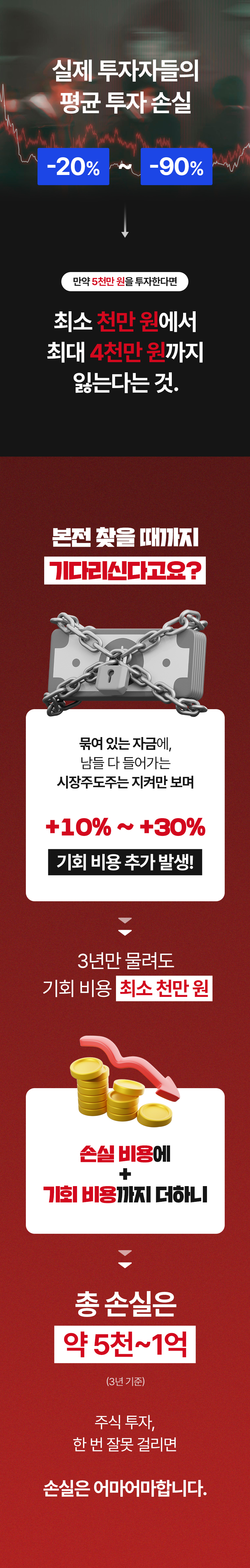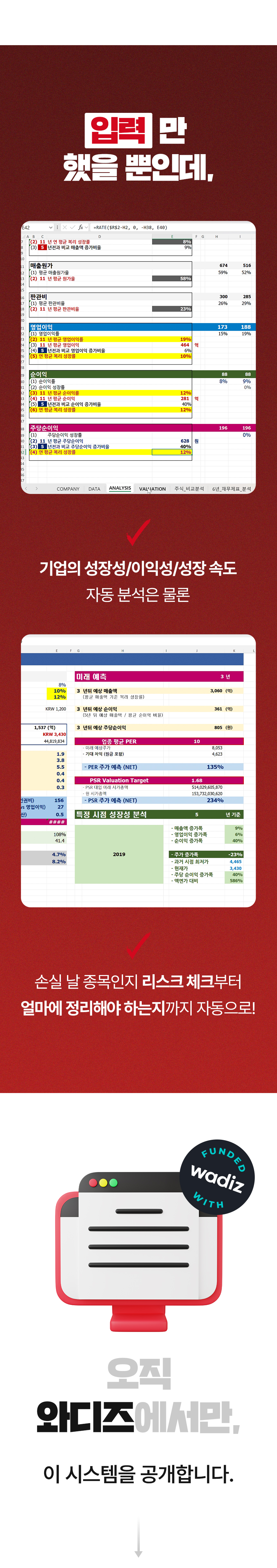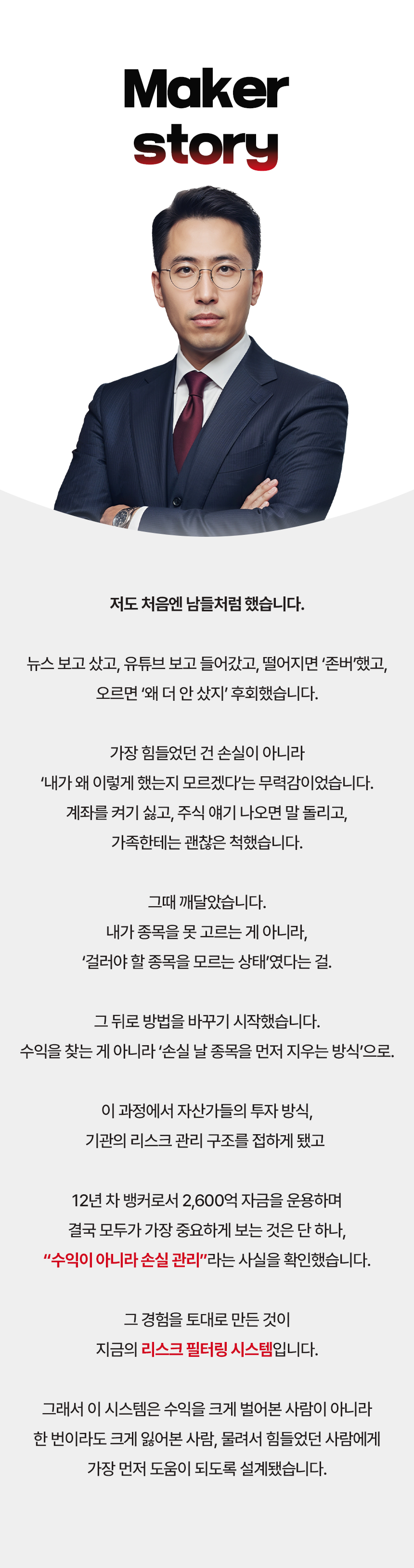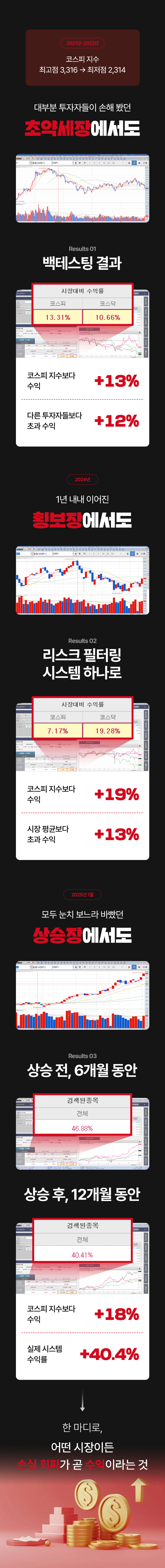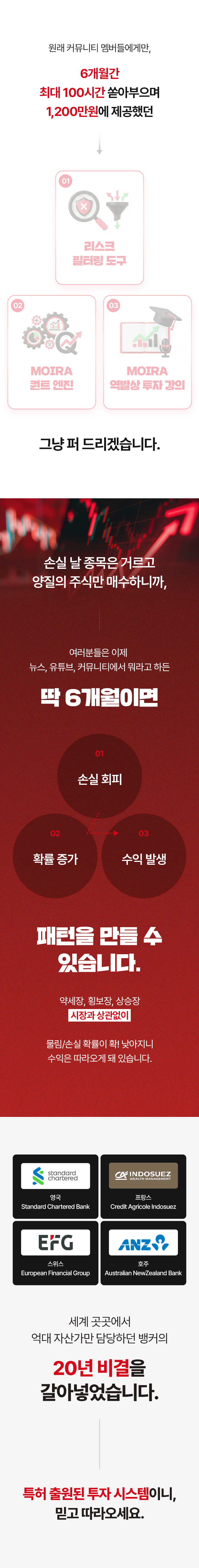 하지만 보통 ‘수익’ 내게 해 준다는 이야기를 하고 있고, 리스크 방어 전략을 다루는 강의는 없었습니다. 이 점을 안타깝게 생각하며 이번 프로젝트를 준비했습니다. 이 펀딩은 손실, 물림으로 인한 기회비용을 줄이는 데 초점을 맞추고 있습니다. 손실을 회피하고 투자자 수익의 안전성을 높여 주는 리스크 필터링 시스템, 공식적으로는 와디즈에서 처음 선보입니다.