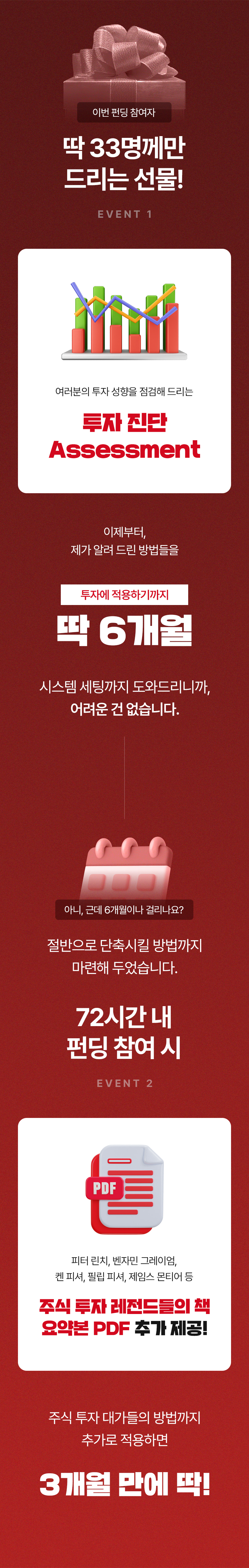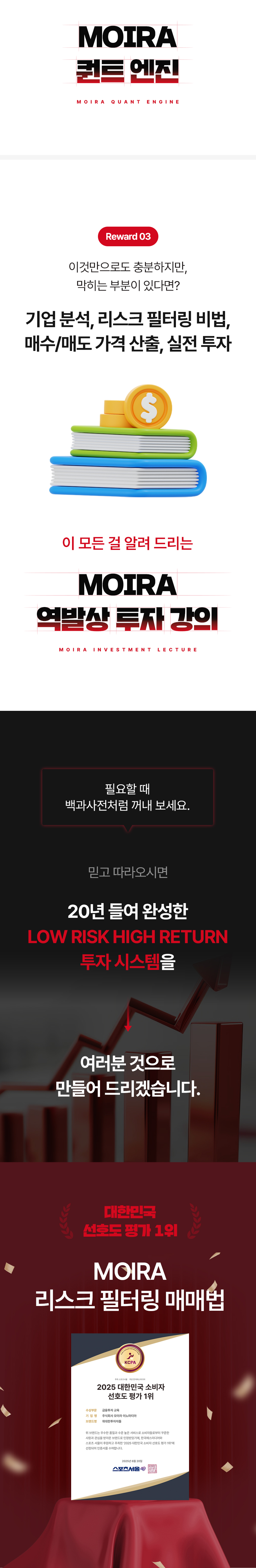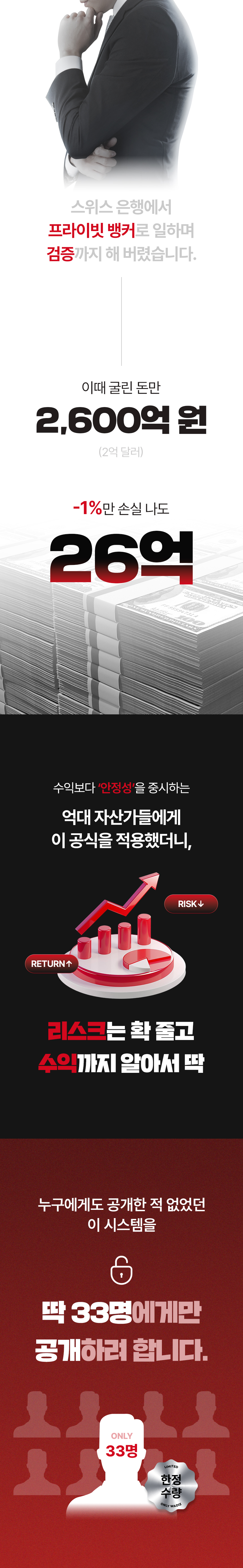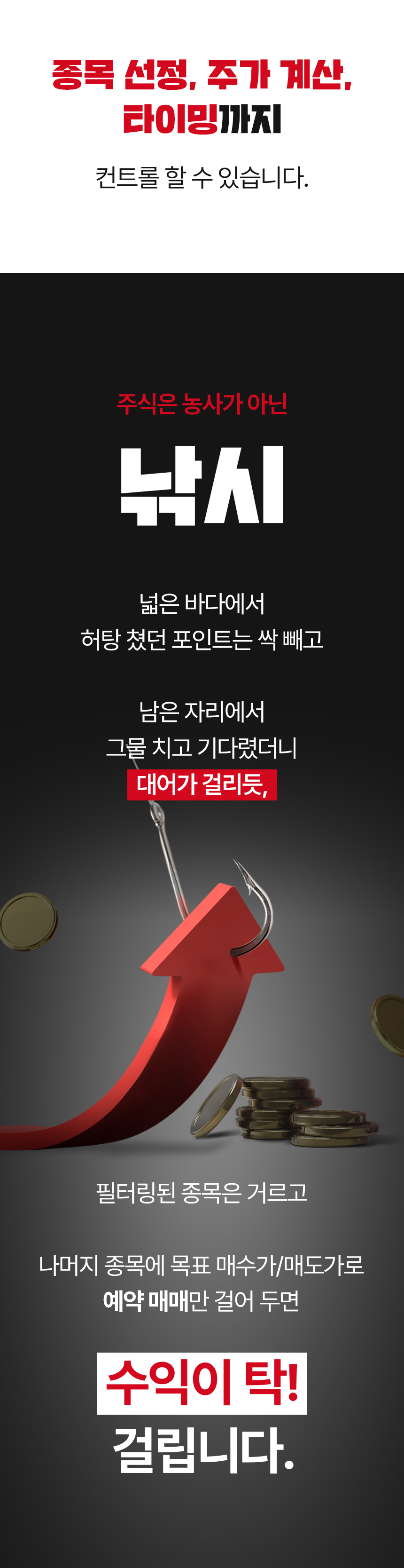 하지만 보통 ‘수익’ 내게 해 준다는 이야기를 하고 있고, 리스크 방어 전략을 다루는 강의는 없었습니다. 이 점을 안타깝게 생각하며 이번 프로젝트를 준비했습니다. 이 펀딩은 손실, 물림으로 인한 기회비용을 줄이는 데 초점을 맞추고 있습니다. 손실을 회피하고 투자자 수익의 안전성을 높여 주는 리스크 필터링 시스템, 공식적으로는 와디즈에서 처음 선보입니다.