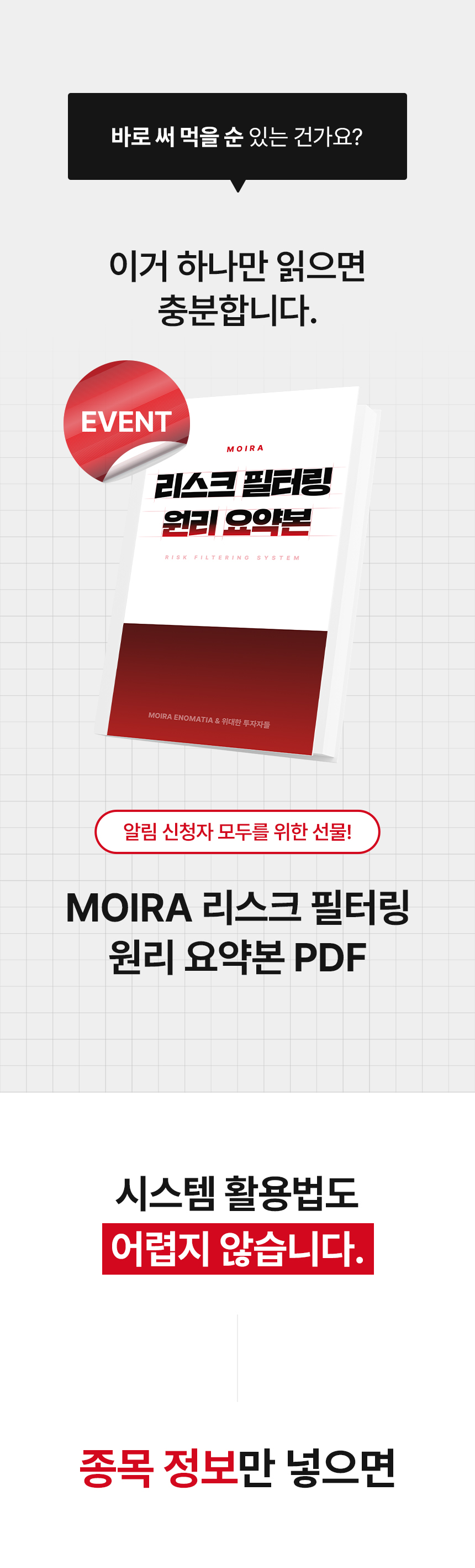 A. 대부분은 ‘무엇을 사라’에 집중합니다. 이 시스템은 먼저 ‘무엇을 사지 말아야 하는가’부터 정리합니다. 종목 추천이 아니라 스스로 걸러내는 기준을 만드는 방식입니다.