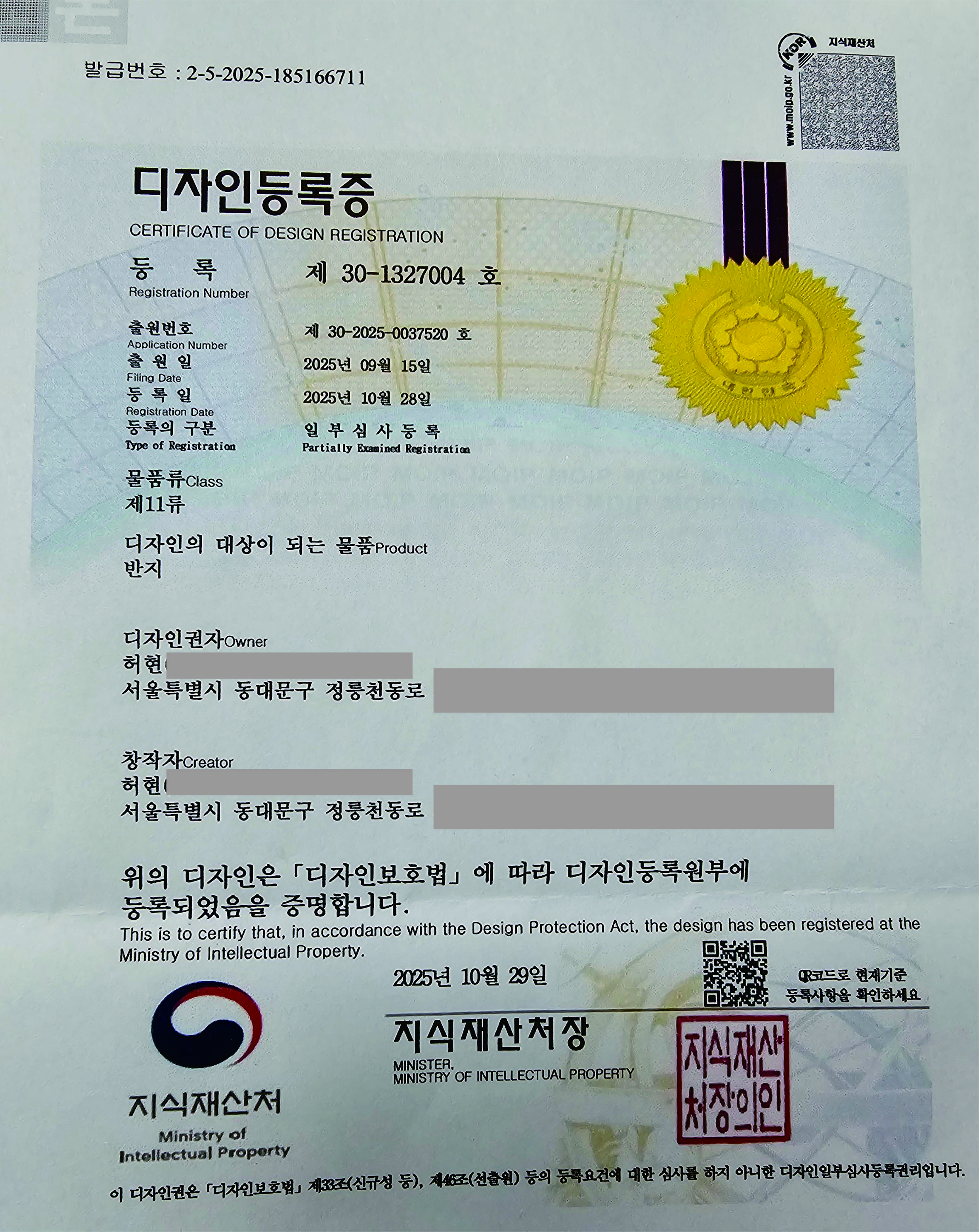 이 반지는 지식재산처(특허청 제 30-1327004호) 디자인 등록된 제품으로