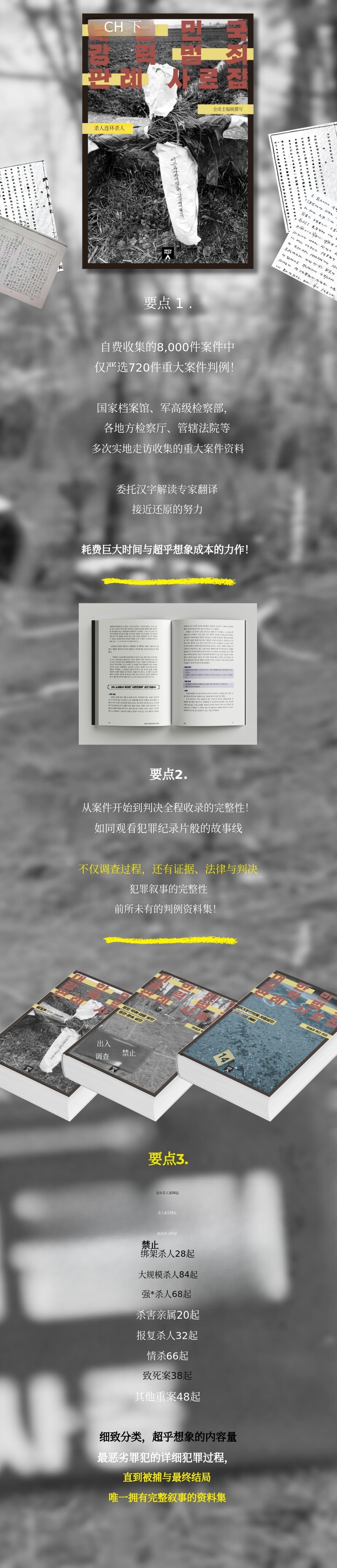 《大韩民国犯罪资料集》以及《世界连环杀人年代表》《主要事件时间线》等等。我全心投入的这个项目,如果在出版社时策划,可能连会议都上不了。我自信这是我做过的最好的策划。比起策划和编辑畅销书,进行这个项目并完成稿件时我最幸福。我也想把这个项目展示给各位支持者,并获得大家的支持。