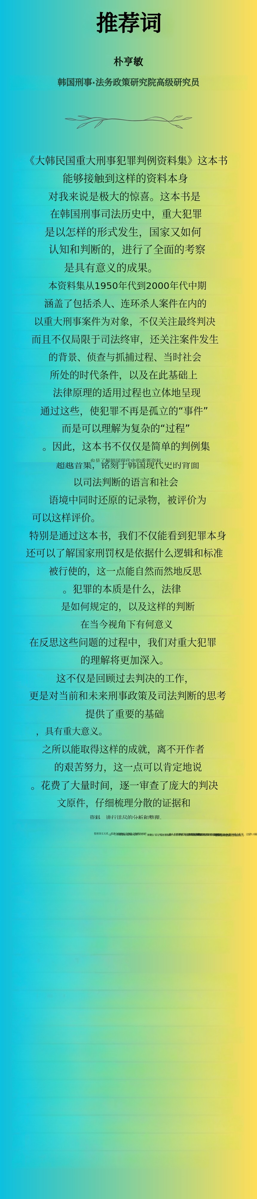 《大韩民国重大刑事犯罪判例资料集》的作者全成奎理事,即使在此刻也在为研究自费投入大量时间收集资料。本书收录的判决书并不是普通人,甚至相关专业人士都能轻易获取的资料。