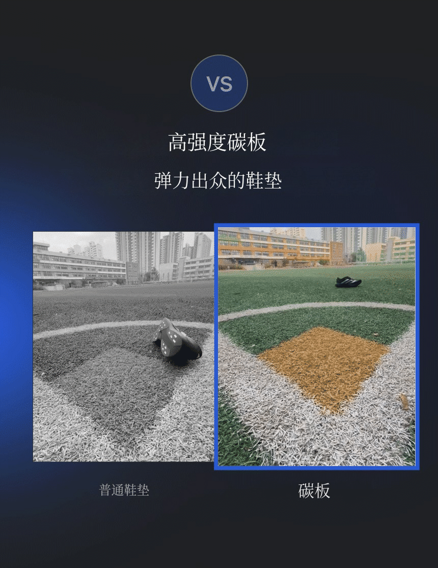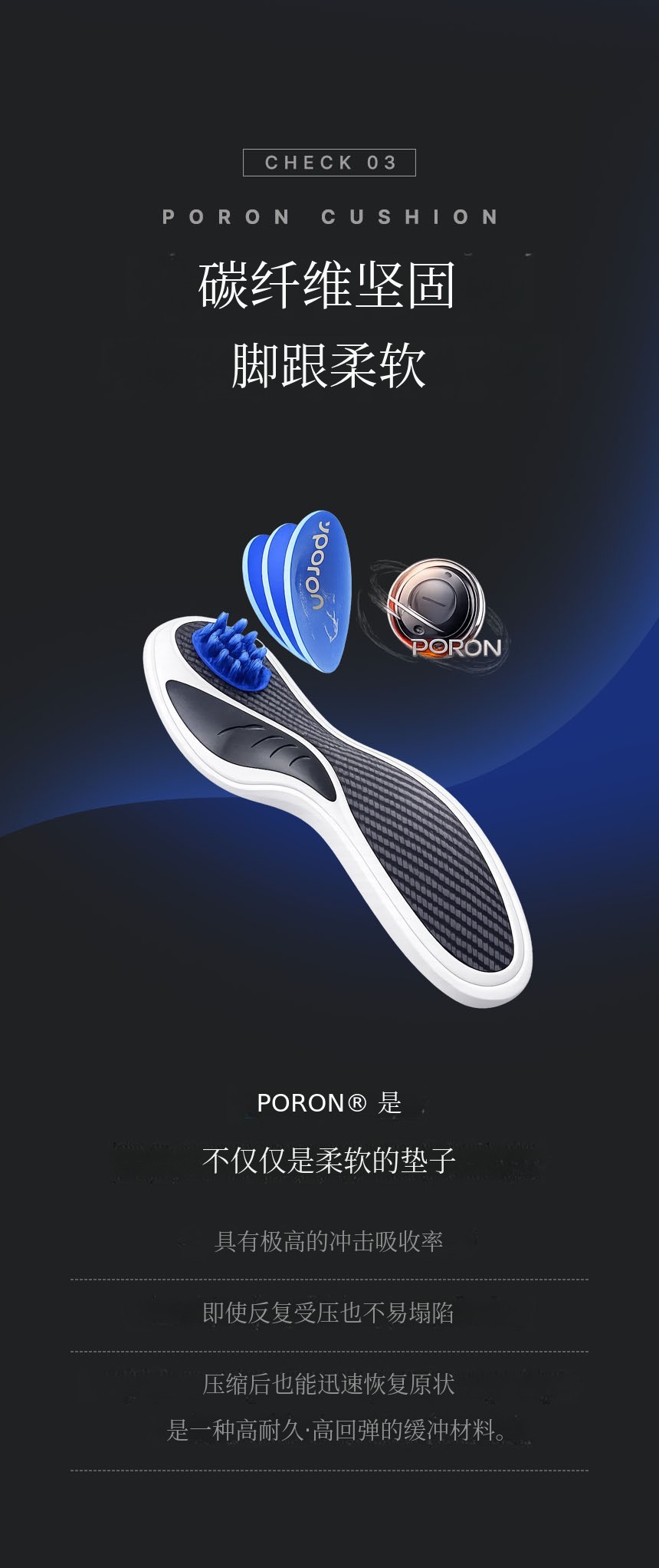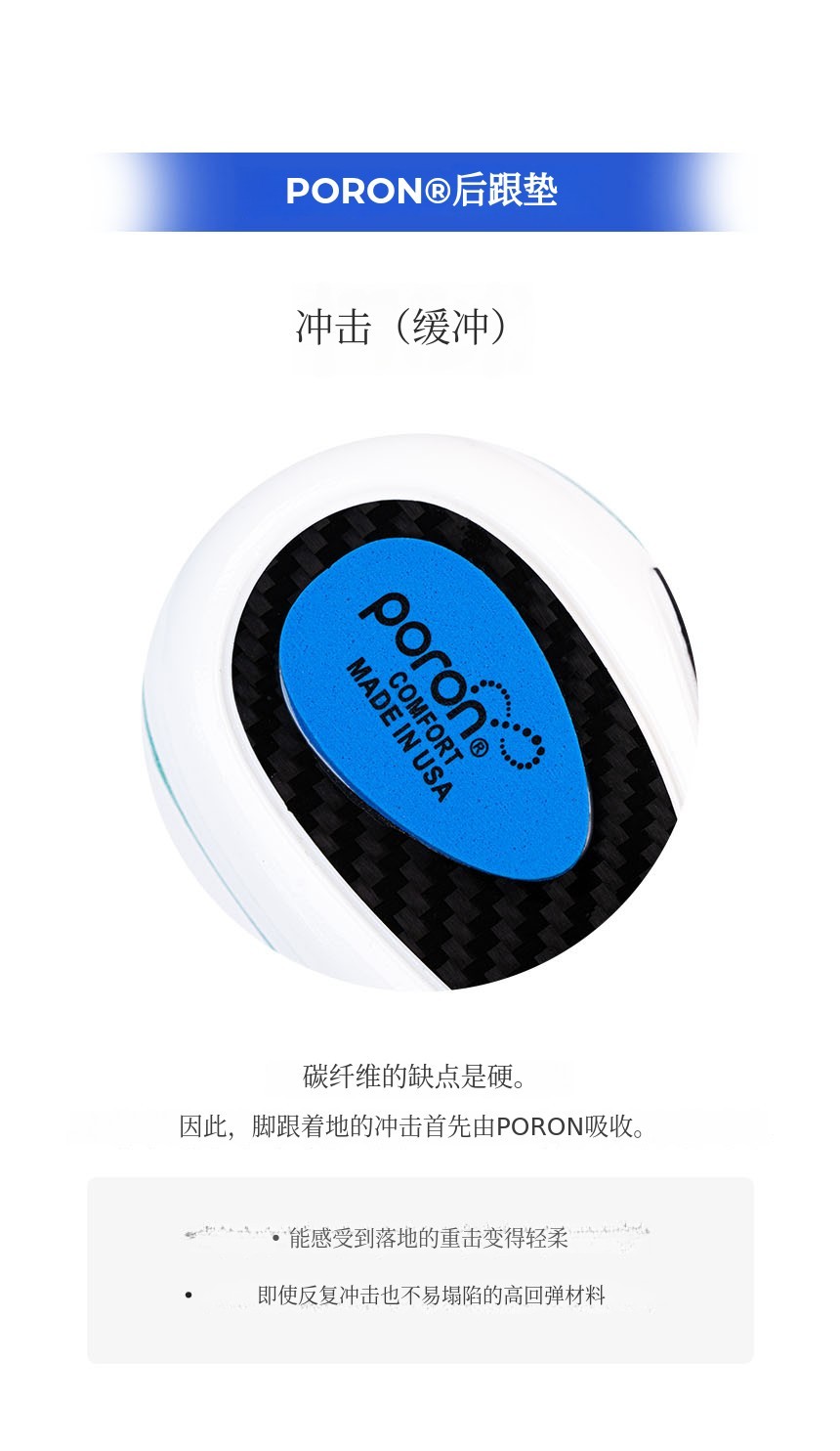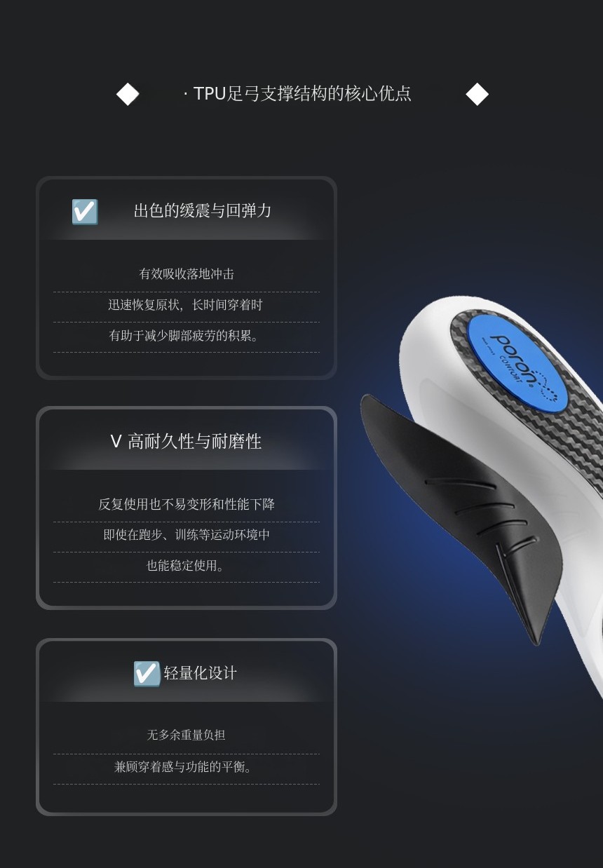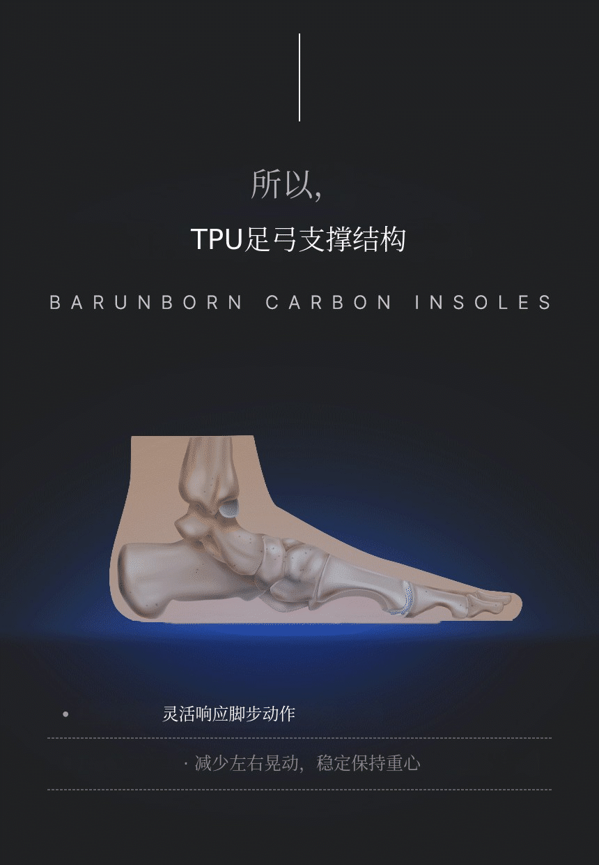 结合了碳纤维板 + TPU足弓支撑 + PORON后跟缓冲