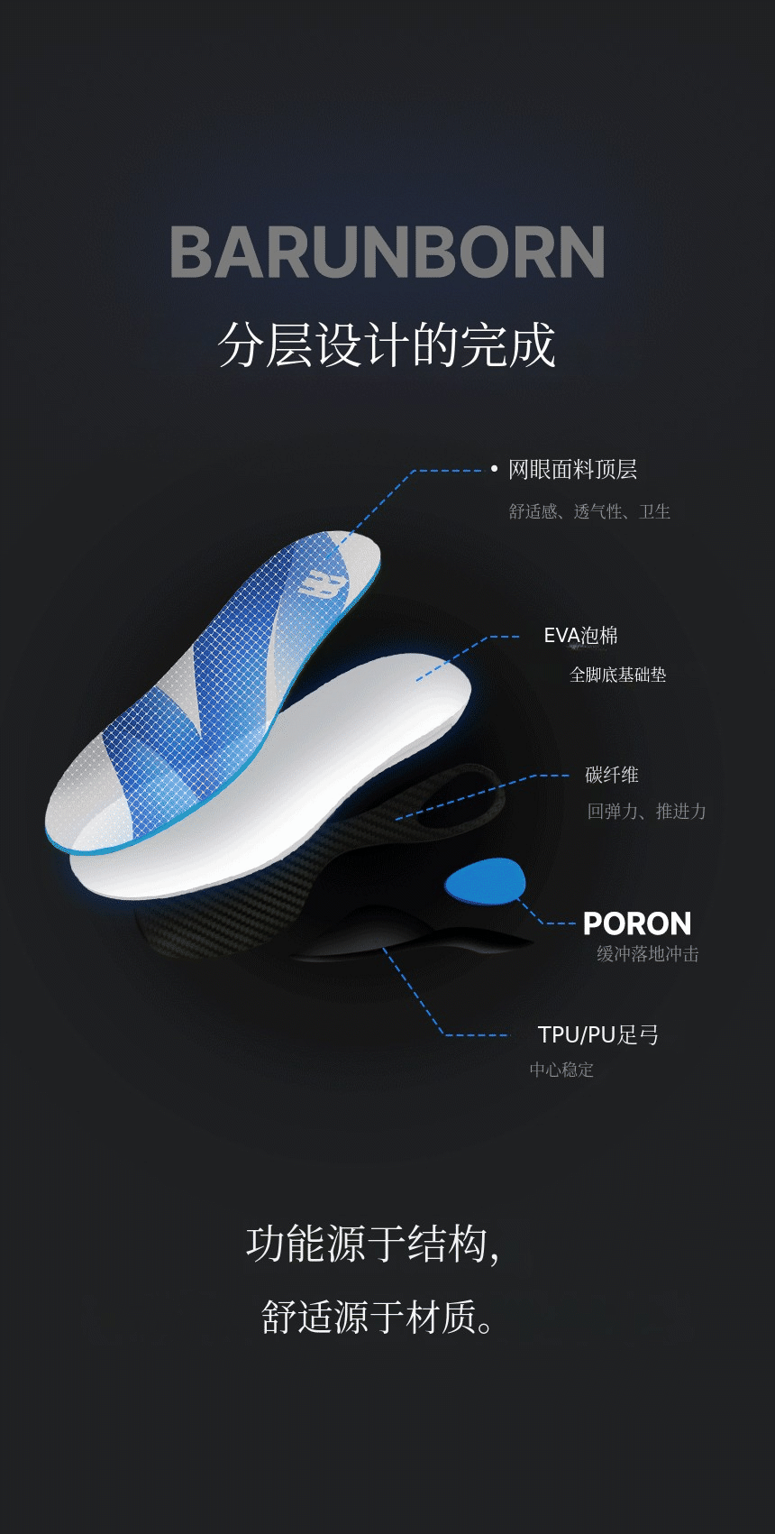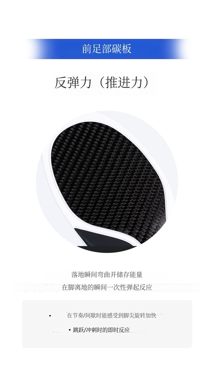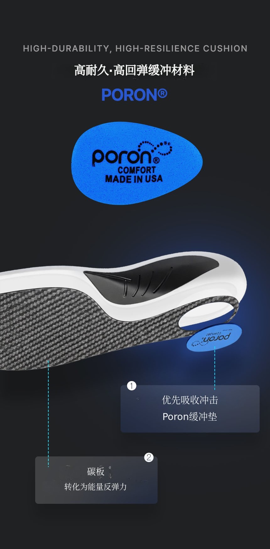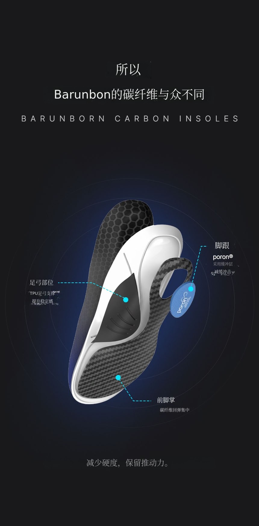 结合了碳纤维板 + TPU足弓支撑 + PORON后跟缓冲