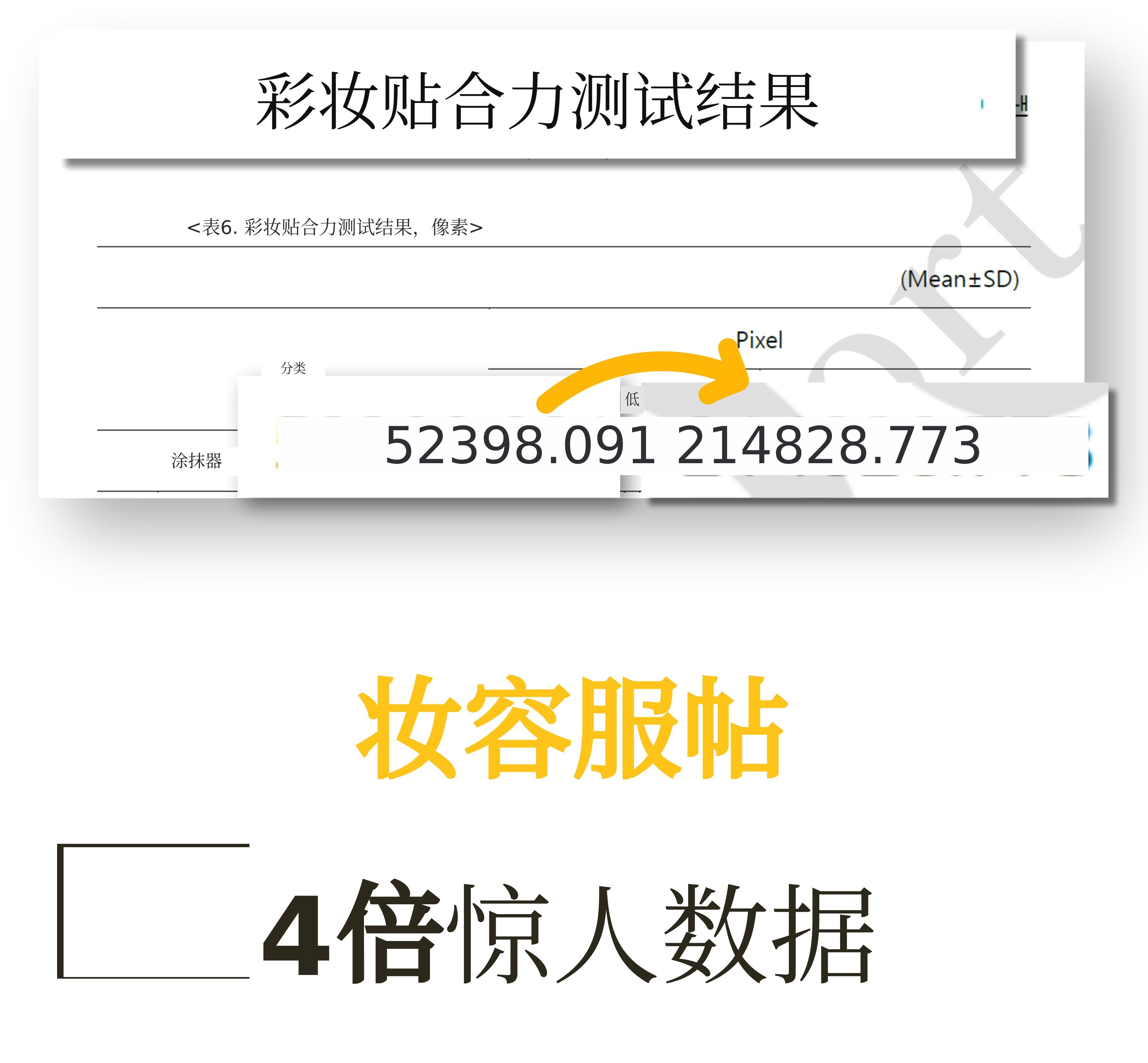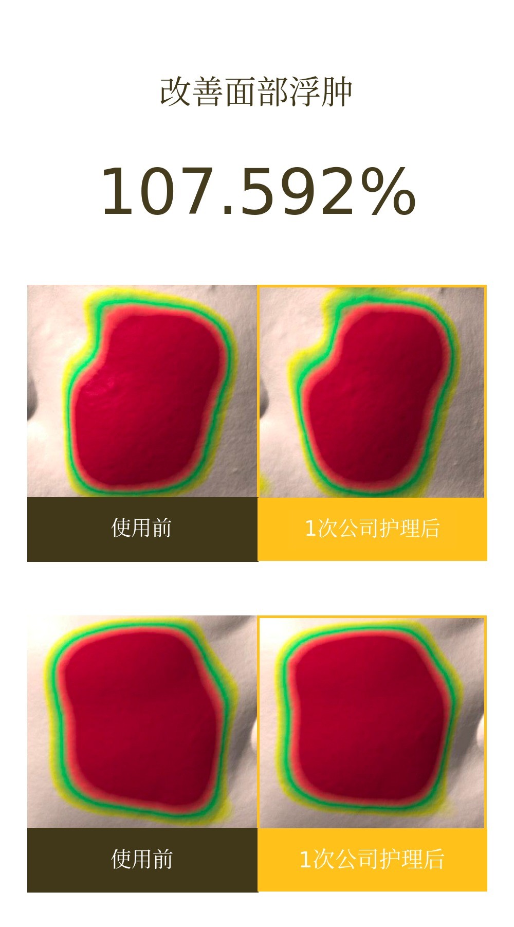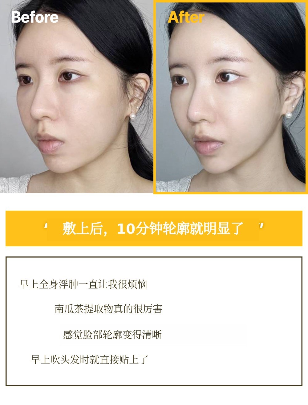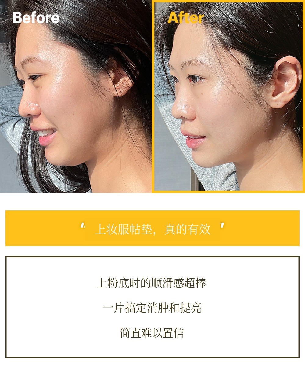 这是展示消肿和妆容贴合力提升4倍效果的前后对比照片。