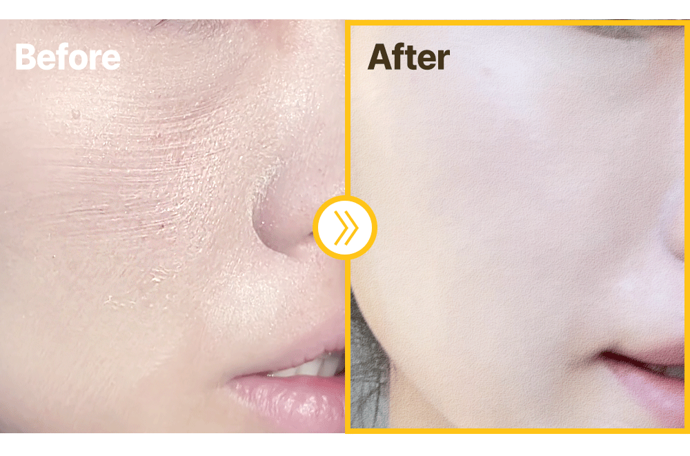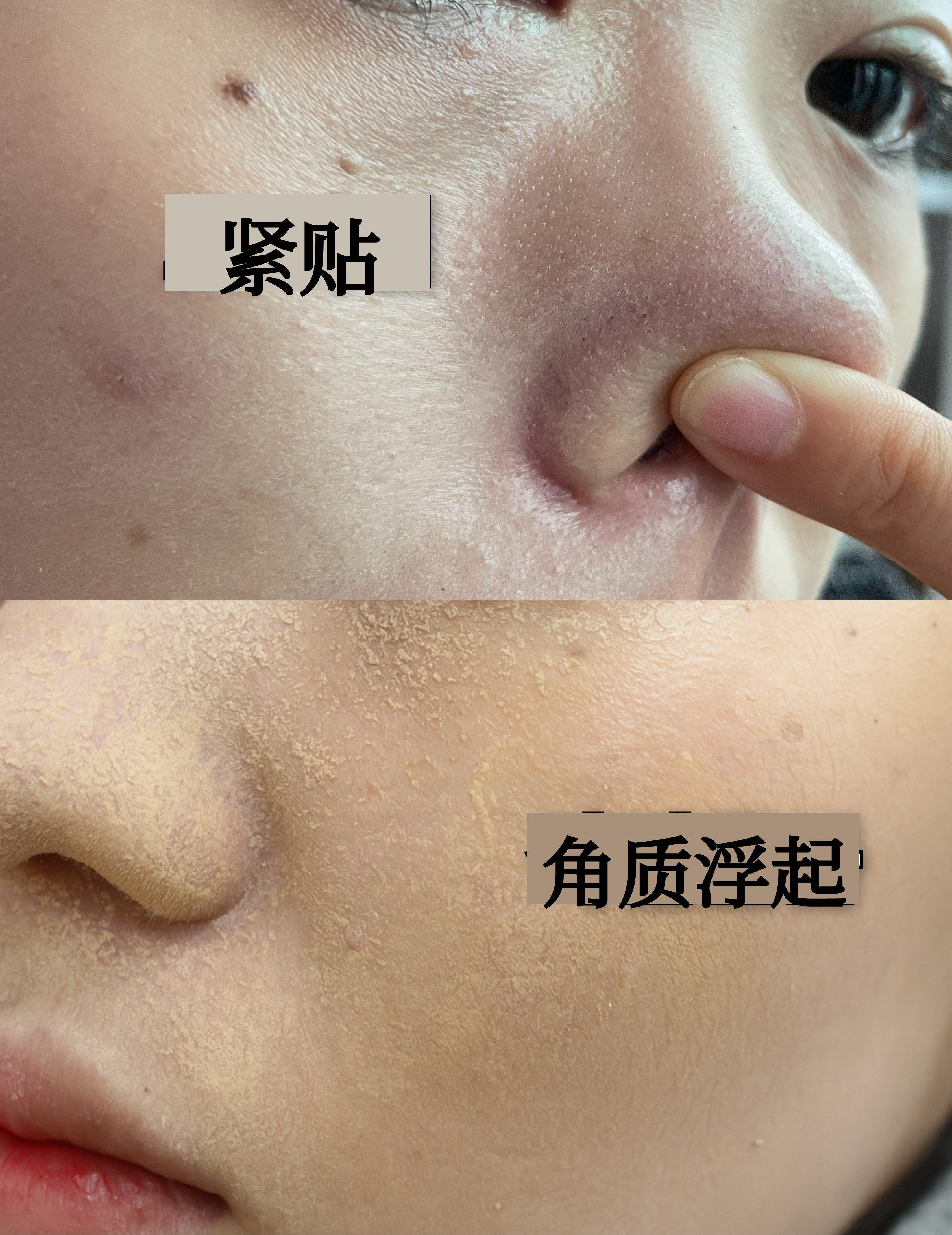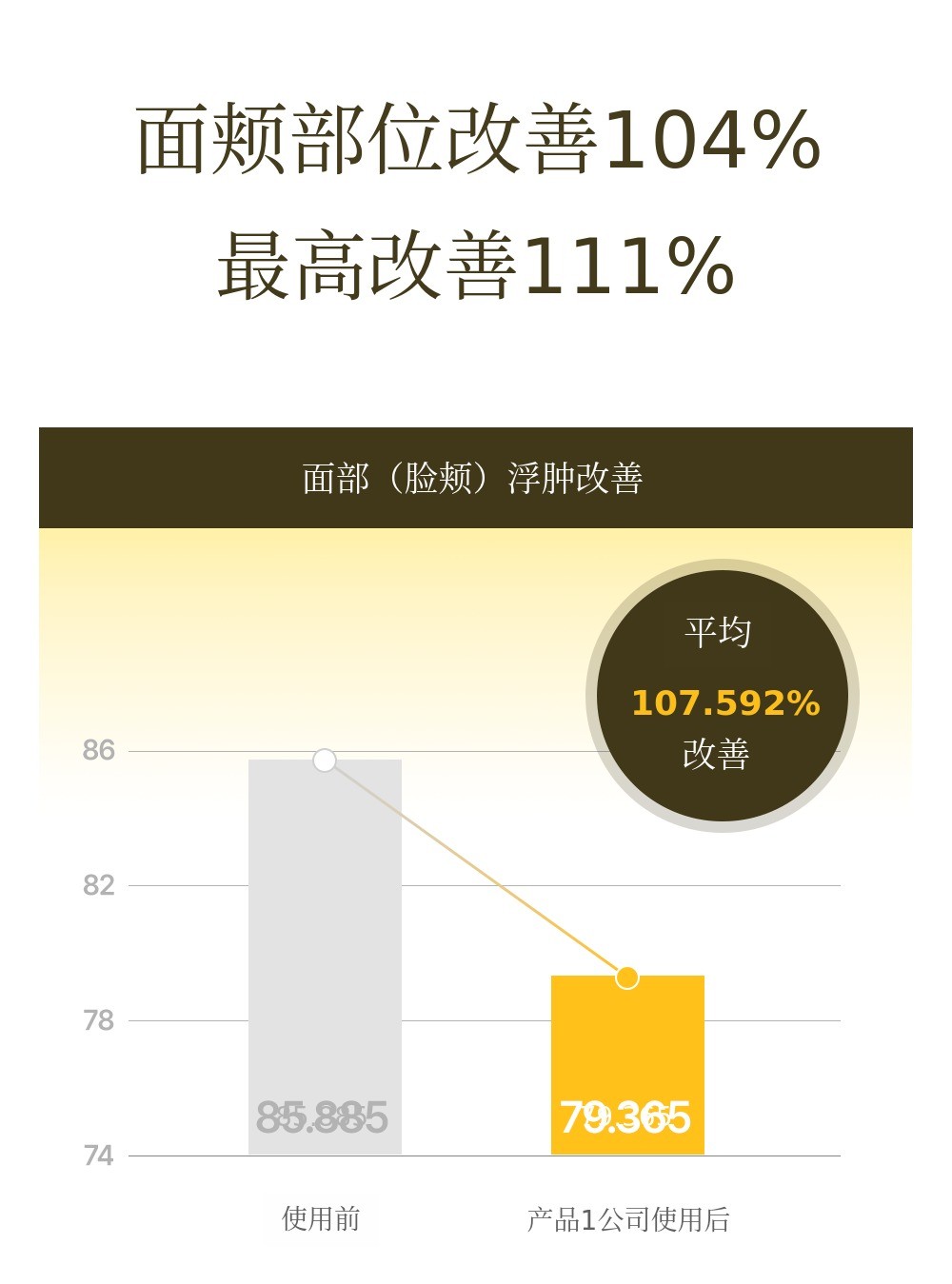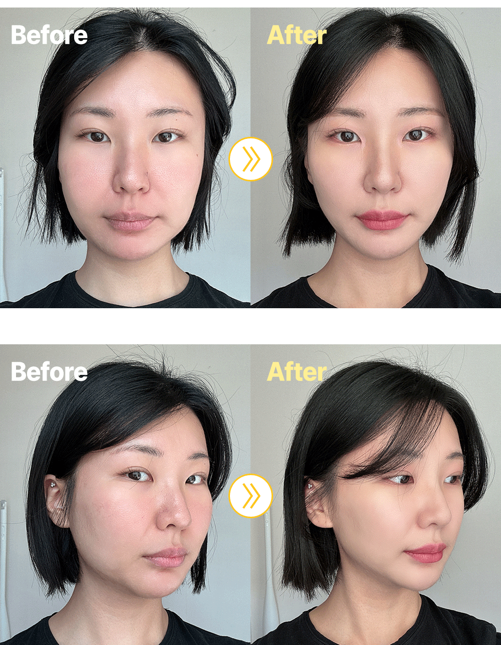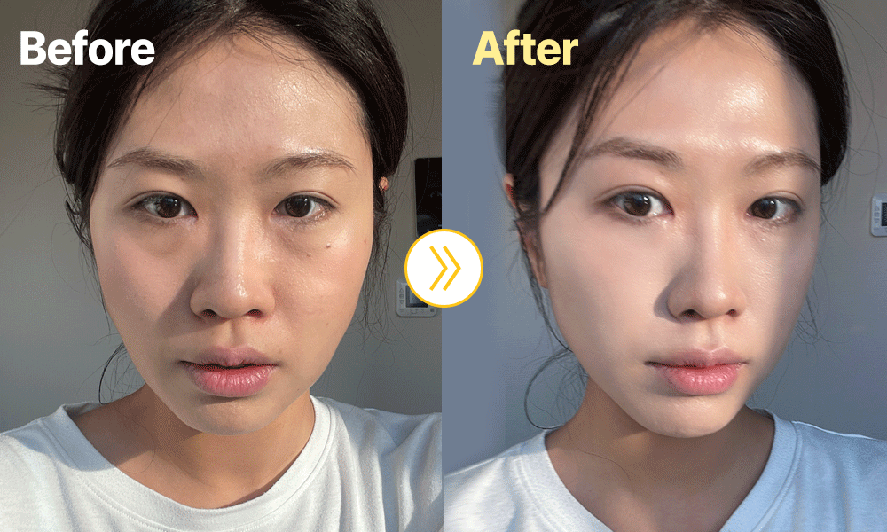 这是展示消肿和妆容贴合力提升4倍效果的前后对比照片。