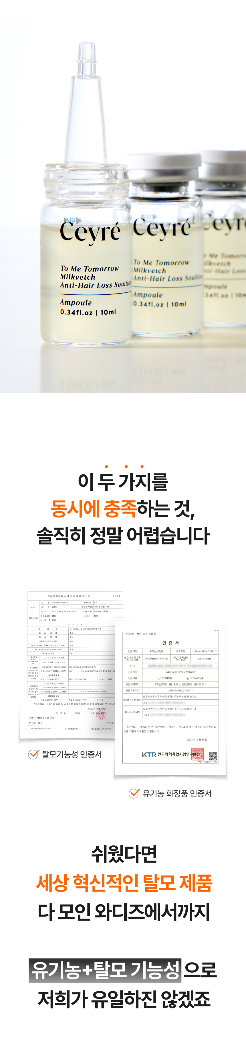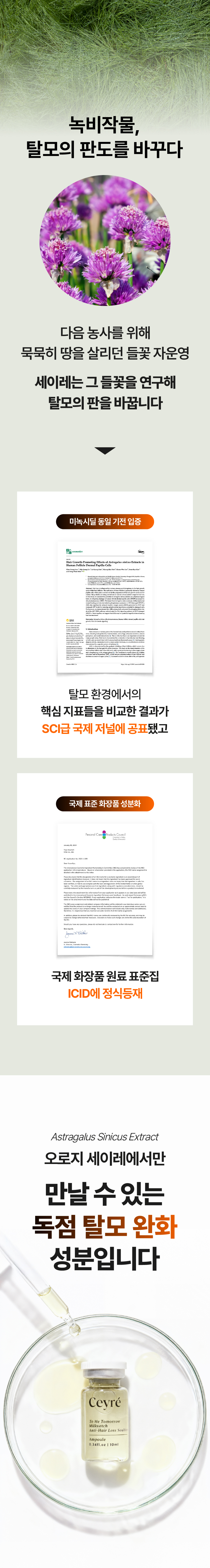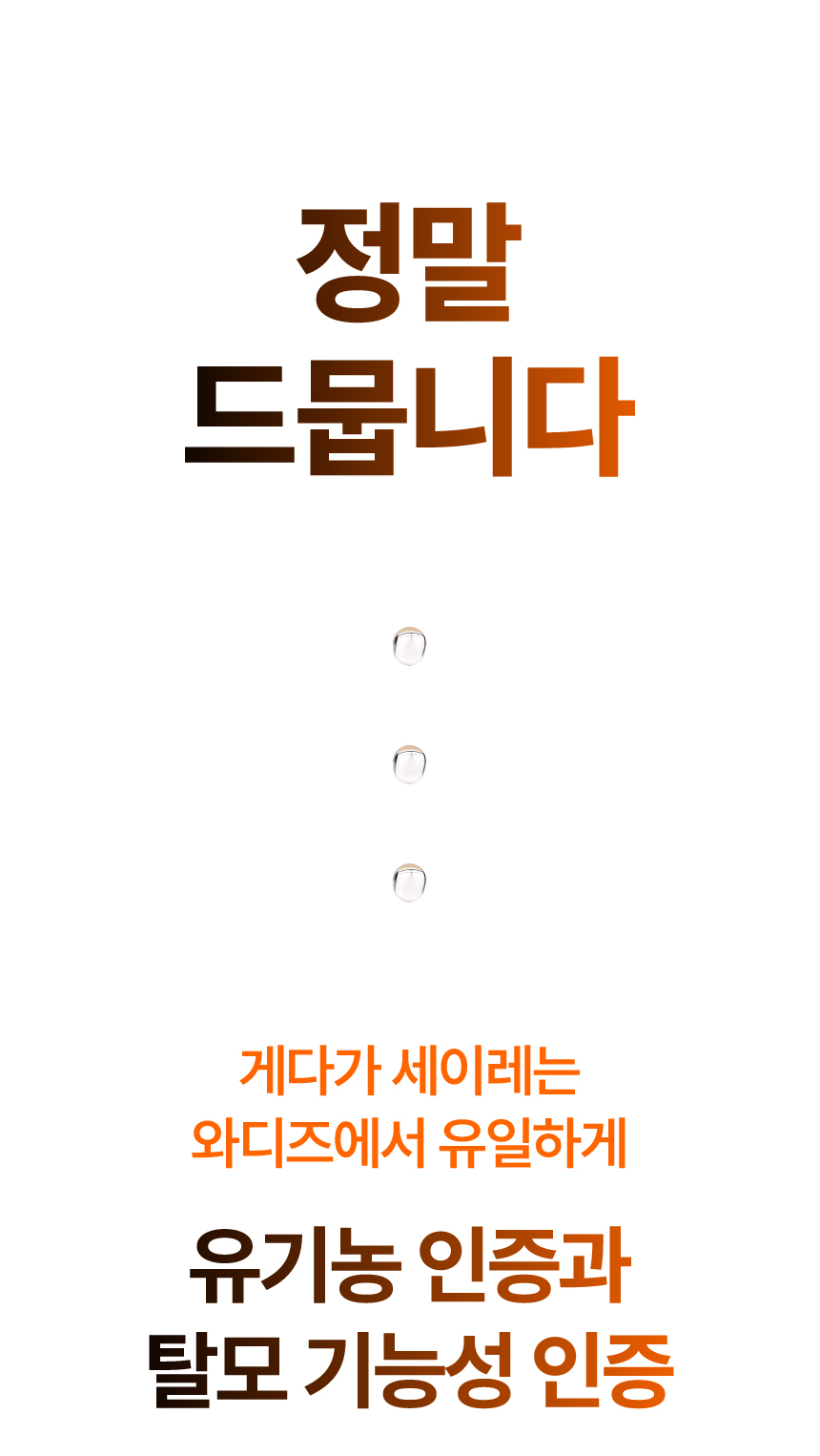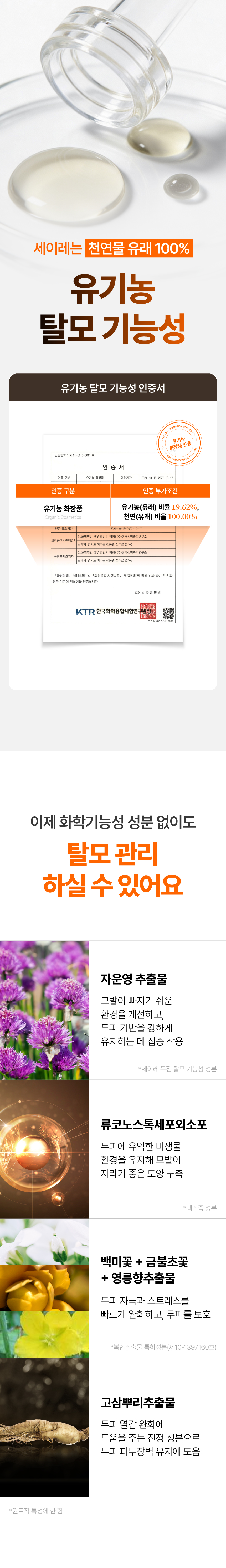 이번에 선보이게 된 세이레 탈모 기능성 앰플은 탈모 증상 완화에 도움을 주는 식약처 인증 비고시 개별인정형 기능성 성분인 자운영추출물을 핵심 원료로 만들었고요 유기농인증과 동시에 비건인증을 받은 앰플입니다.