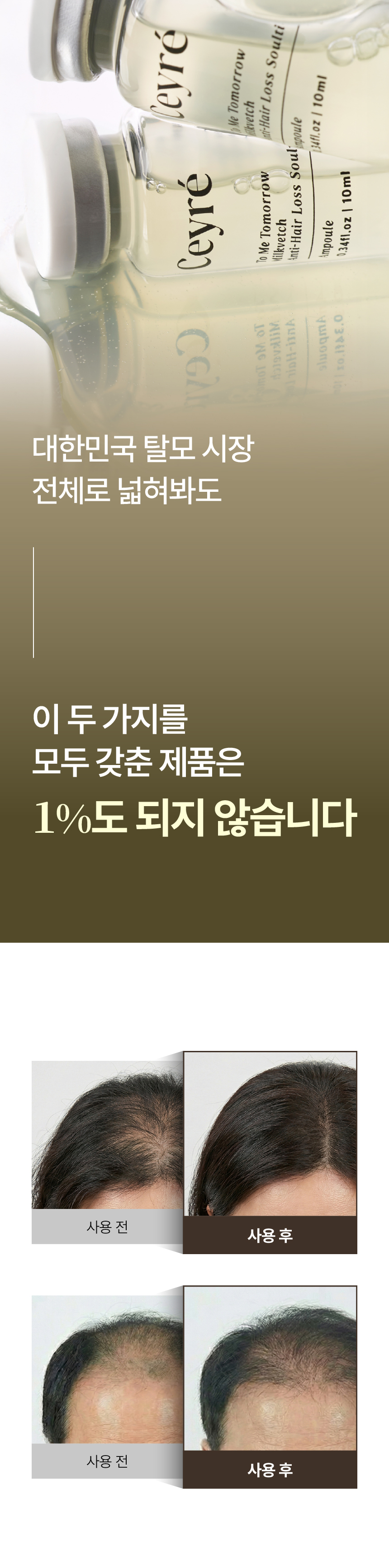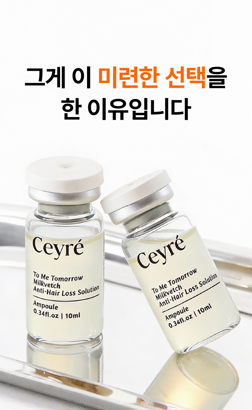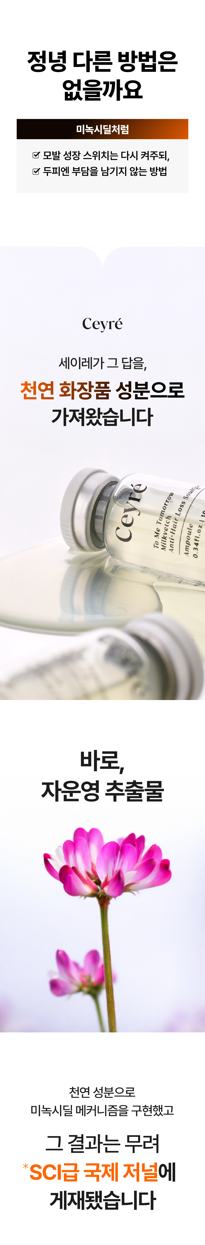 이번에 선보이게 된 세이레 탈모 기능성 앰플은 탈모 증상 완화에 도움을 주는 식약처 인증 비고시 개별인정형 기능성 성분인 자운영추출물을 핵심 원료로 만들었고요 유기농인증과 동시에 비건인증을 받은 앰플입니다.