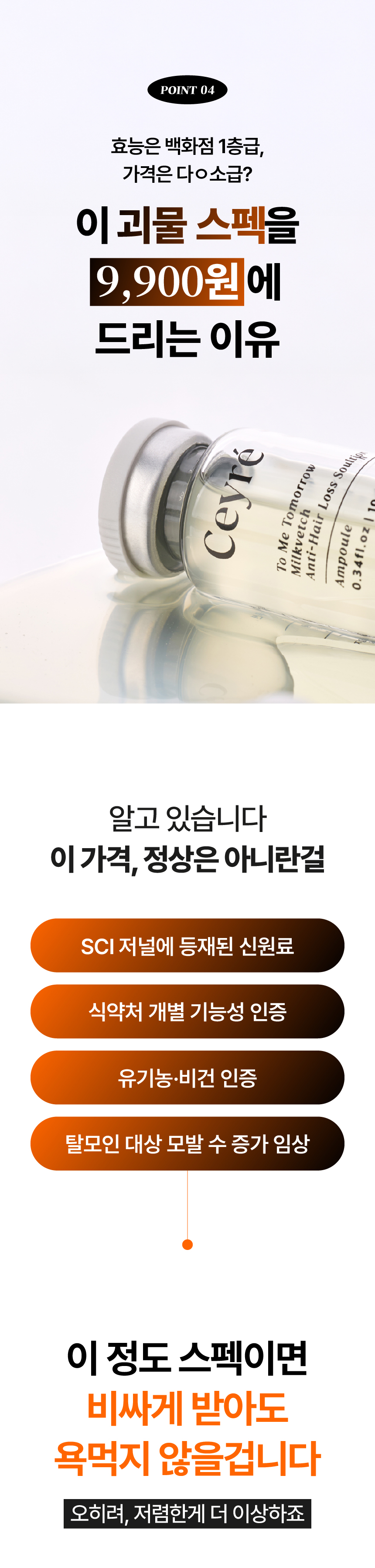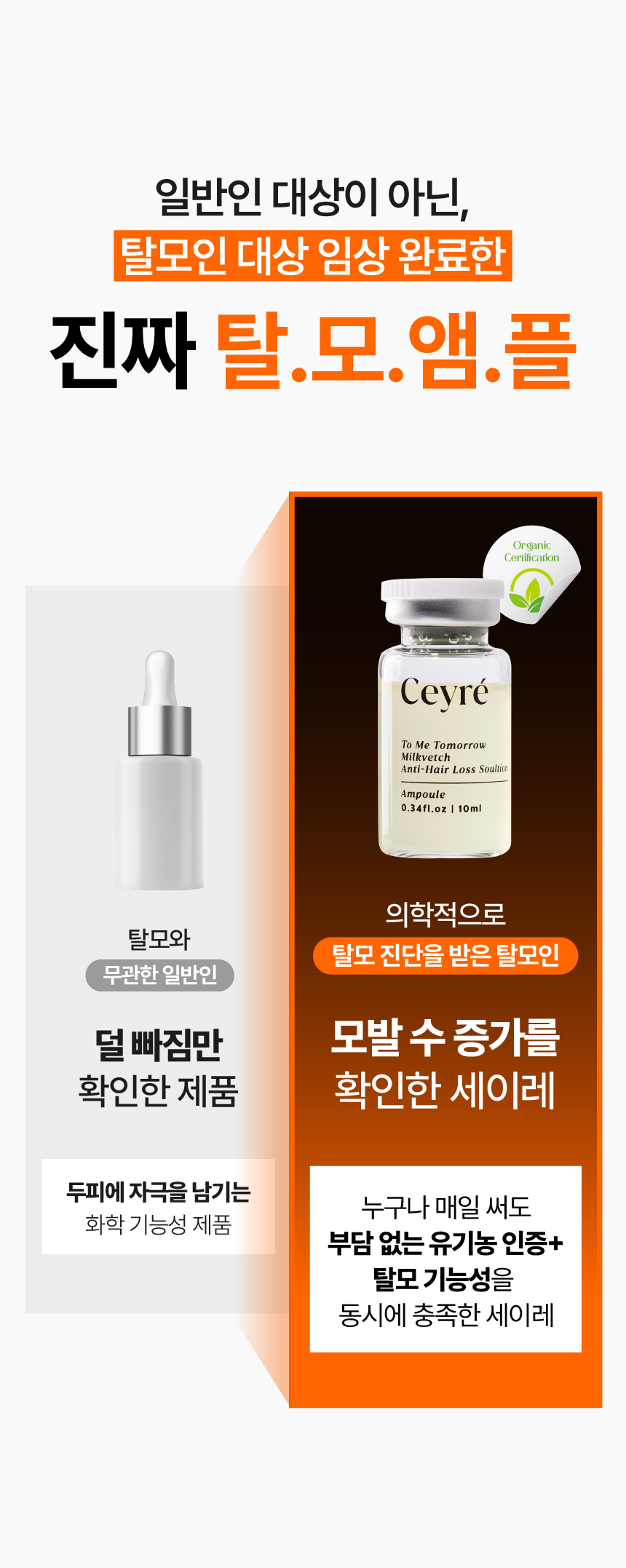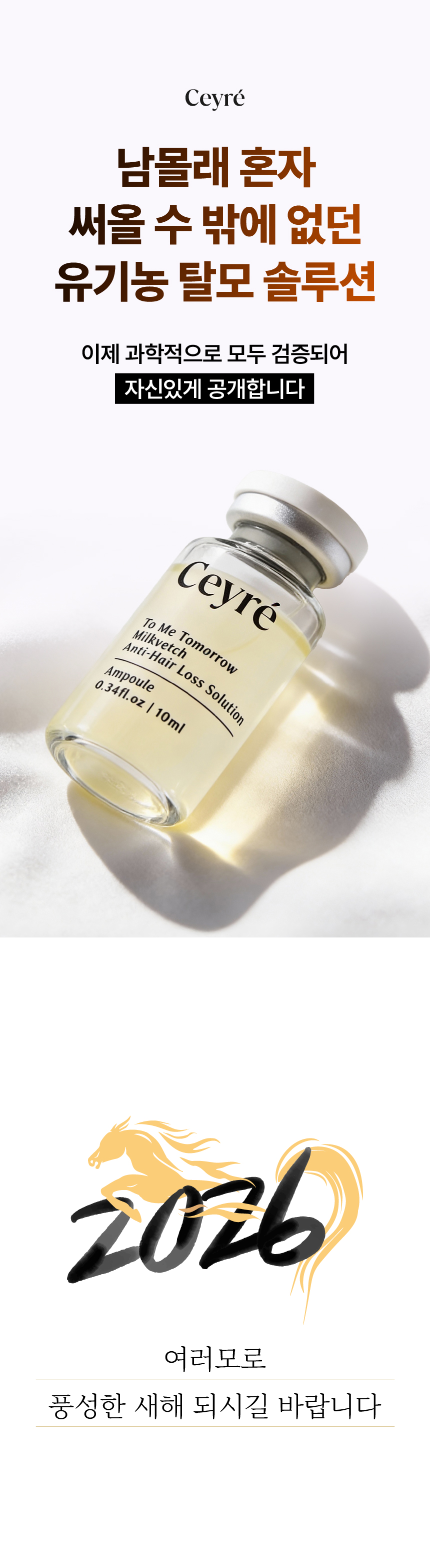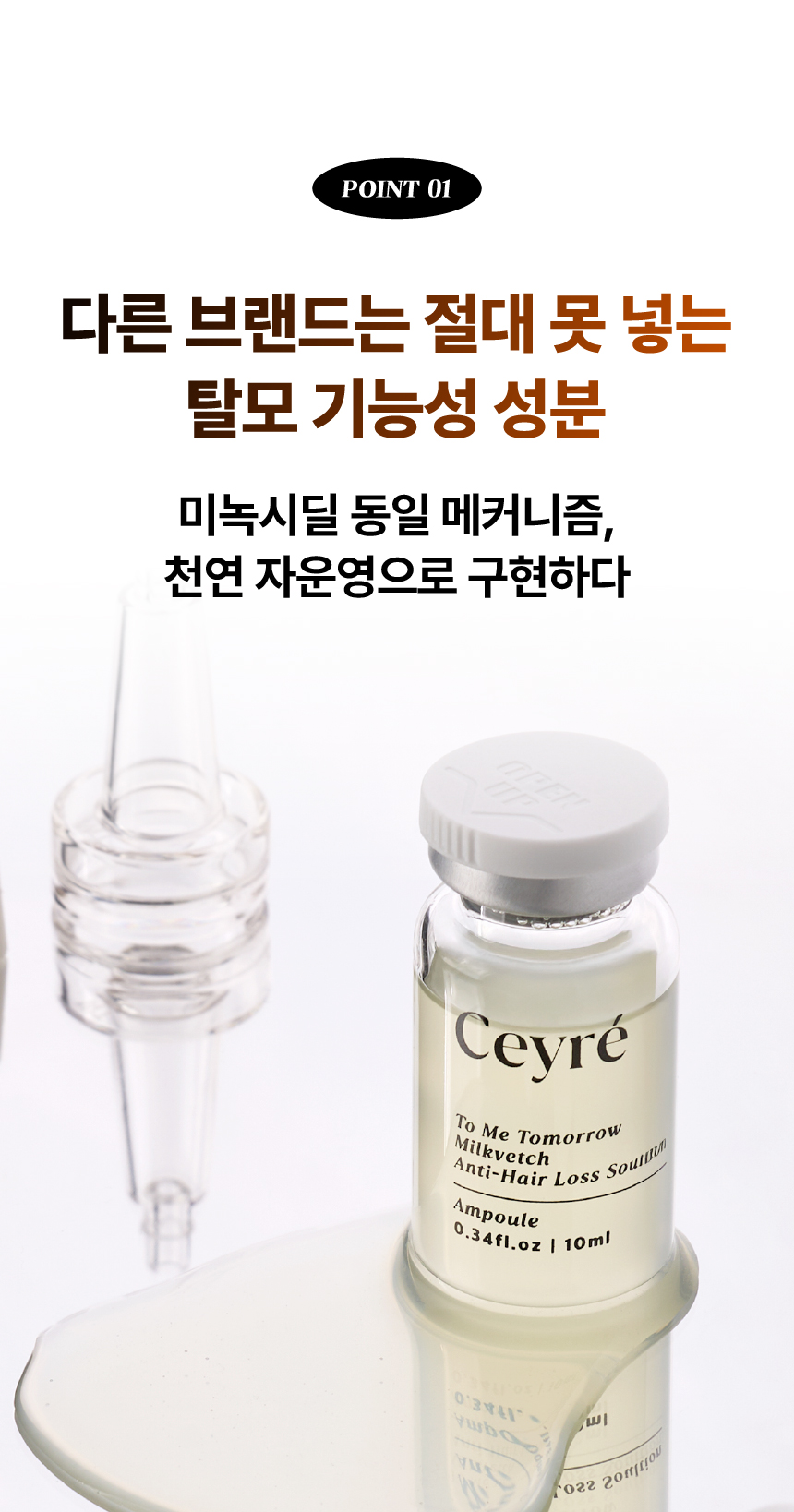 이번에 선보이게 된 세이레 탈모 기능성 앰플은 탈모 증상 완화에 도움을 주는 식약처 인증 비고시 개별인정형 기능성 성분인 자운영추출물을 핵심 원료로 만들었고요 유기농인증과 동시에 비건인증을 받은 앰플입니다.