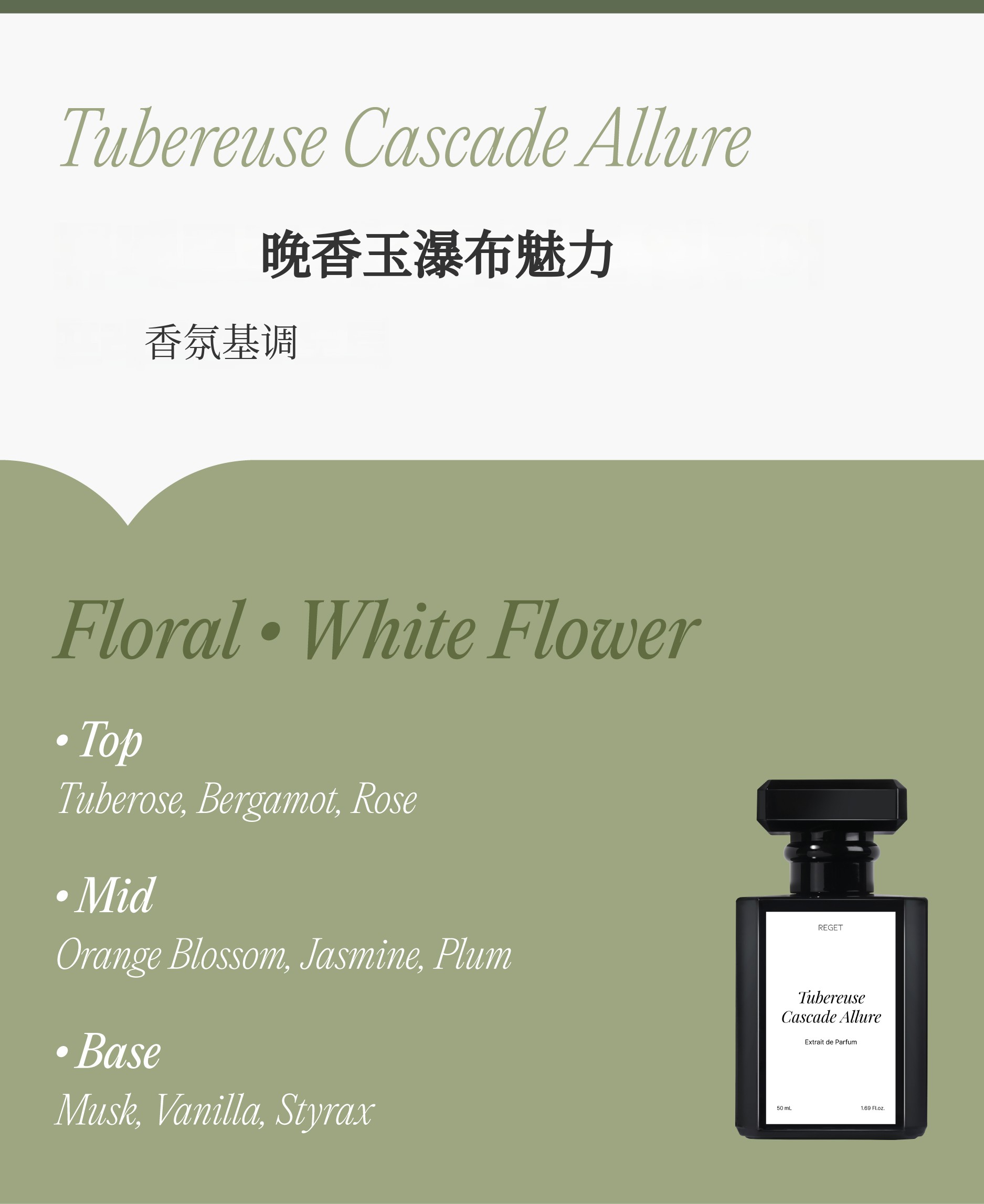 晚香玉纯净而强烈的第一印象中,融合了佛手柑的柑橘清爽与玫瑰的优雅,自然交织,带来如同一天开始般清澈的氛围。