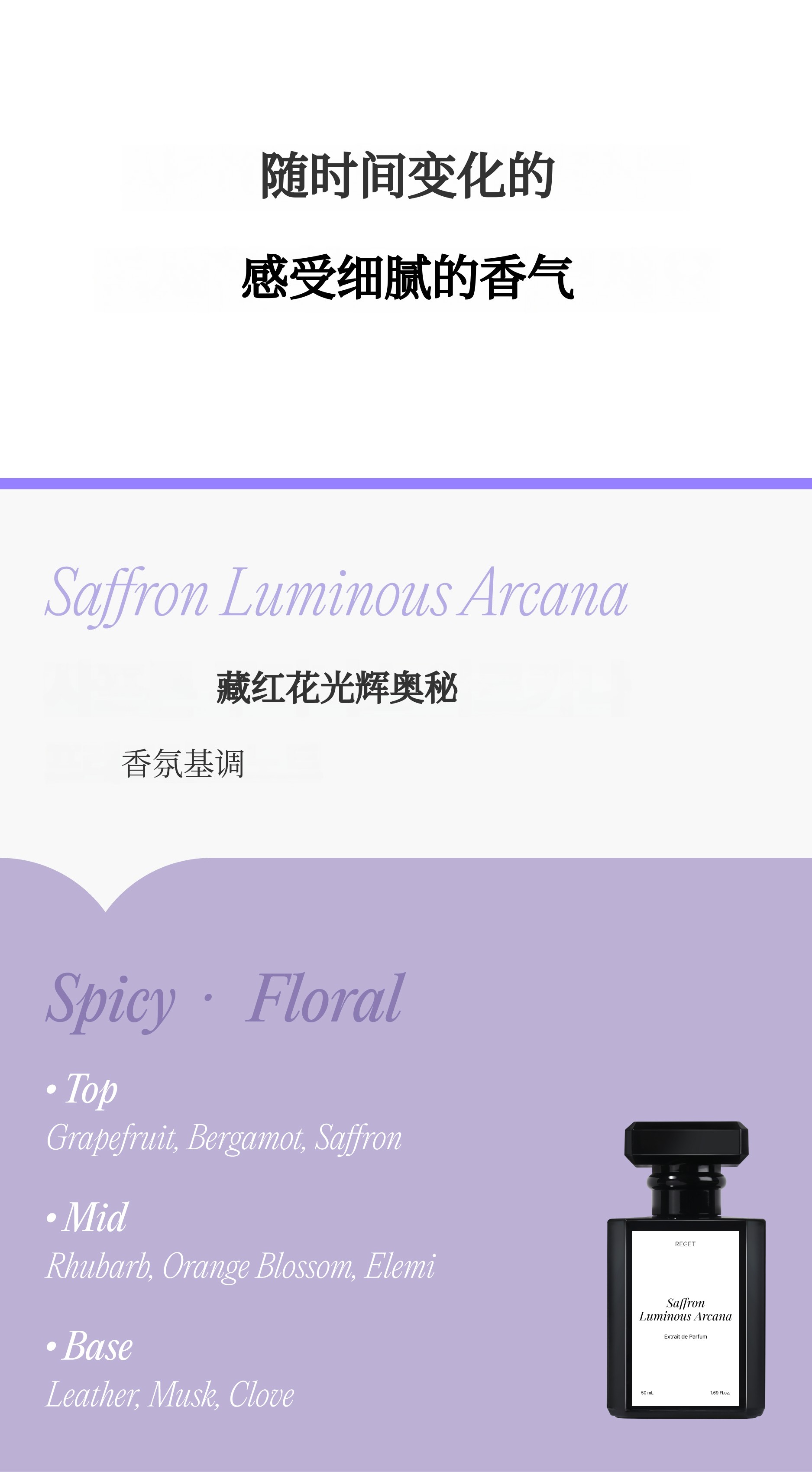 以铃兰、茉莉、小苍兰、玫瑰等“花香”为主,温暖柔和且淡雅的花香丰富展开。香气持久停留,逐渐变得深邃。