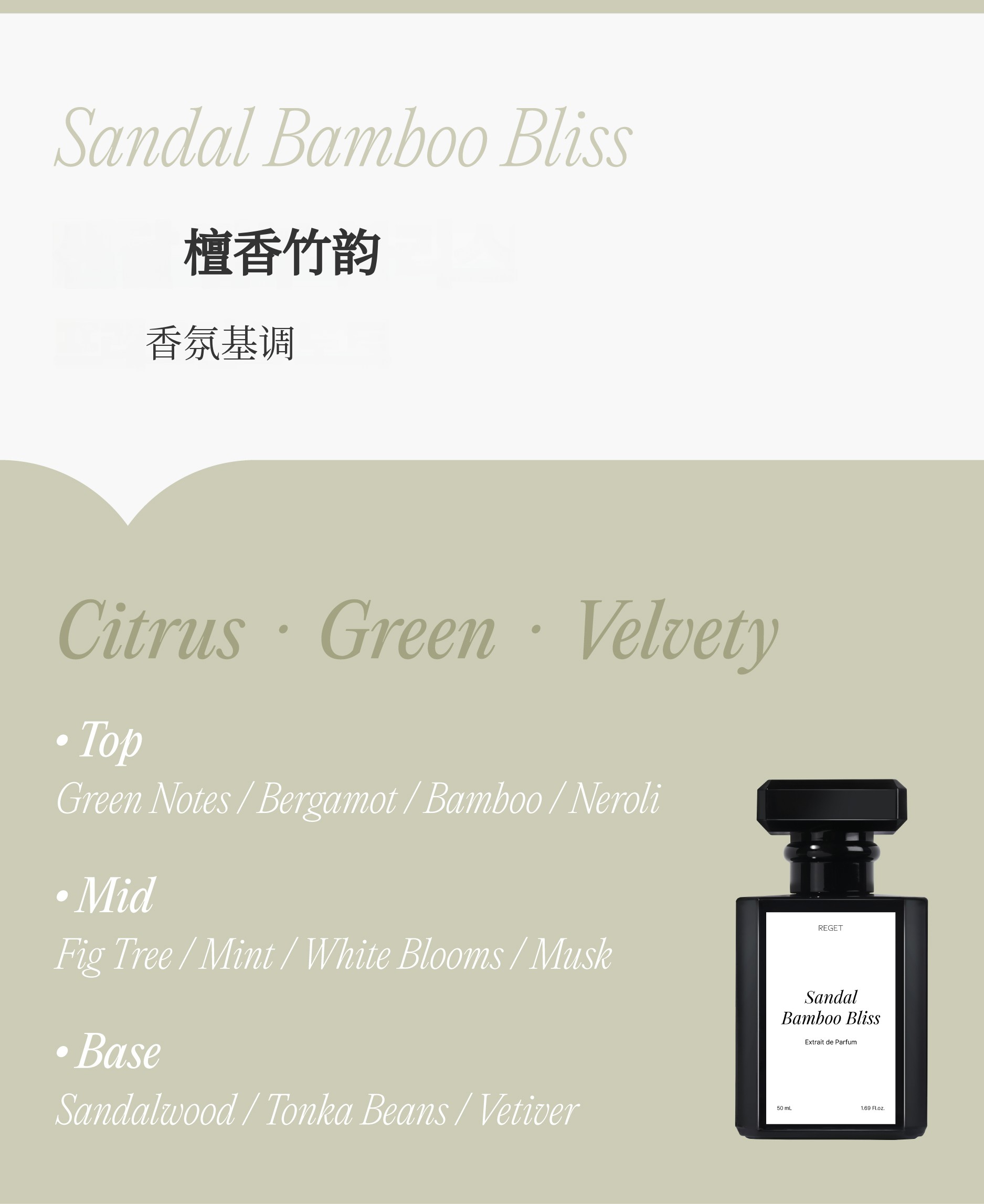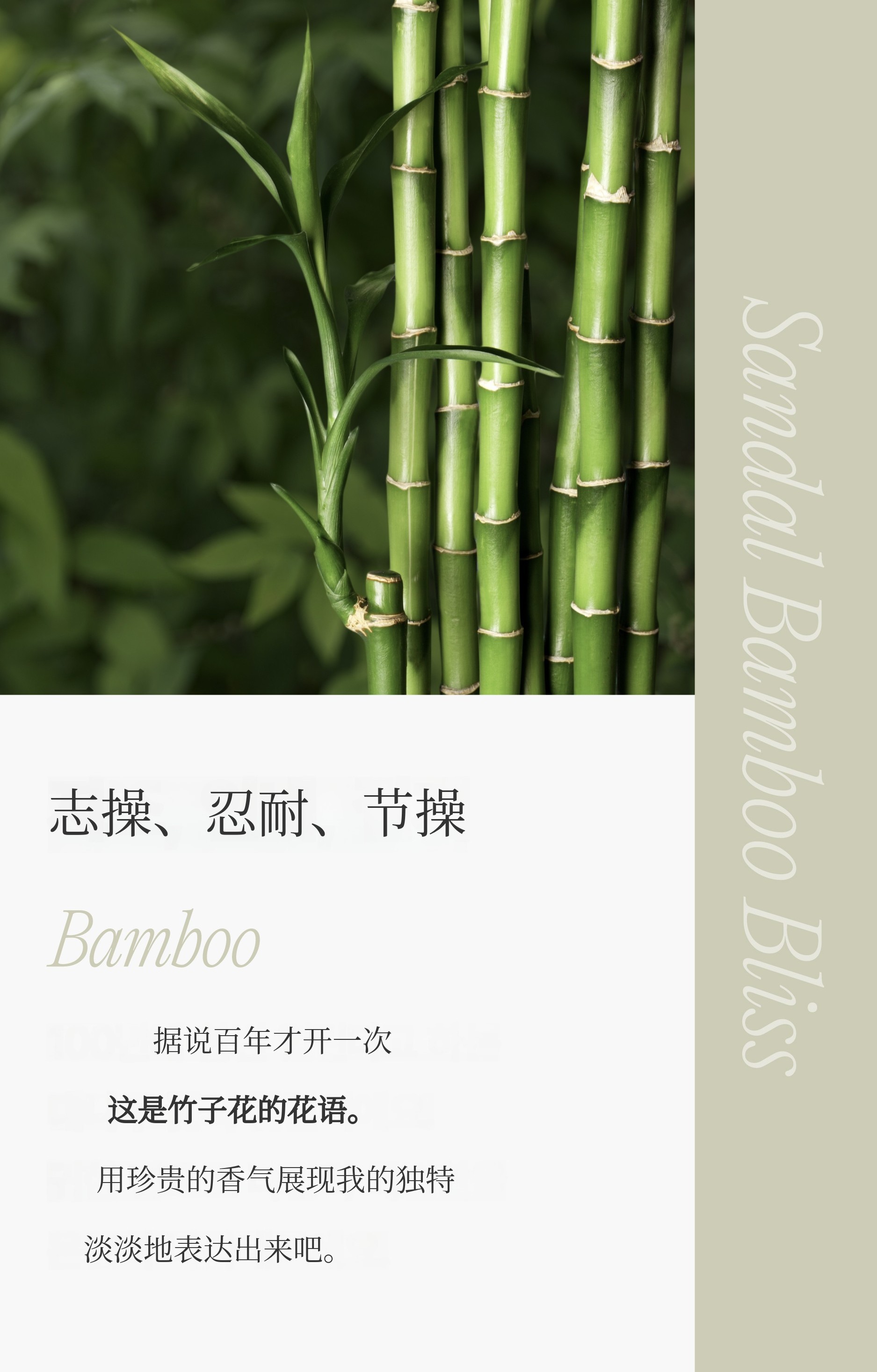 竹子展现坚韧与优雅,温暖柔和的檀香木香气相融合,让您感受到清新与温暖之间的和谐平衡。