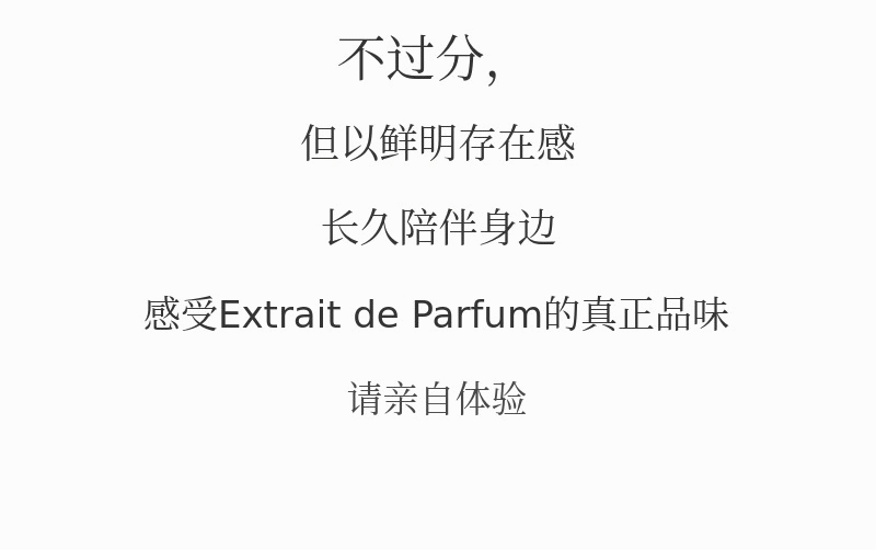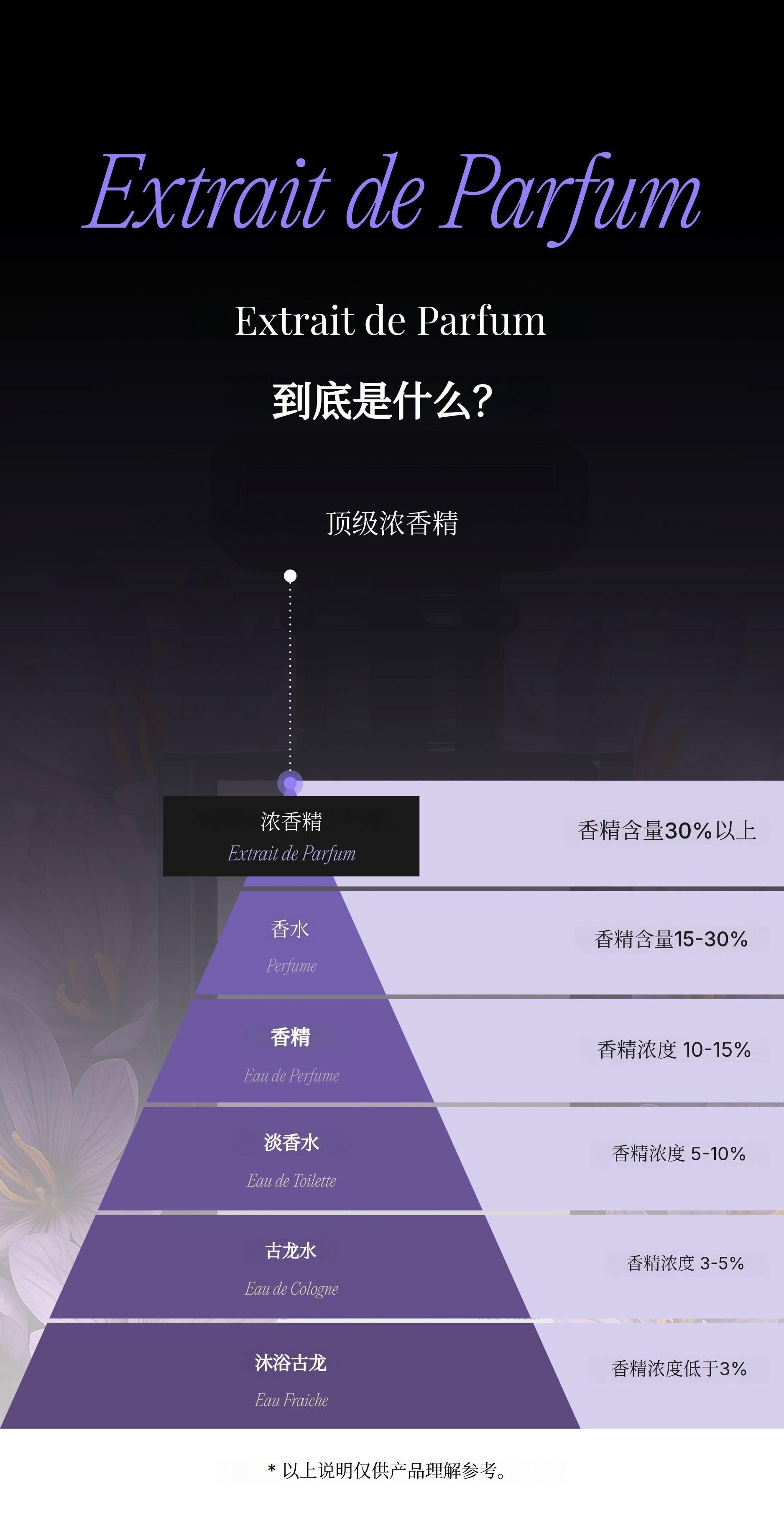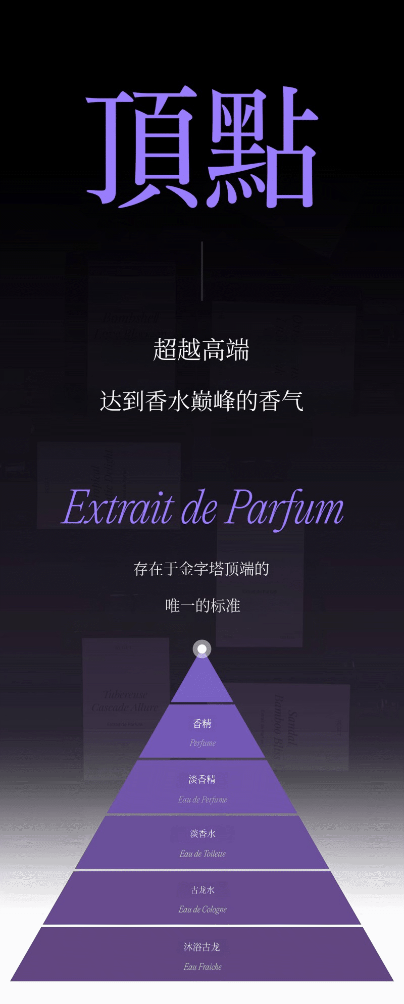 采用高级原料,拥有普通香水2-3倍香精浓度的Extrait de Parfum,在国内品牌中尚无此类产品,只能在海外购买,是稀有的香水。