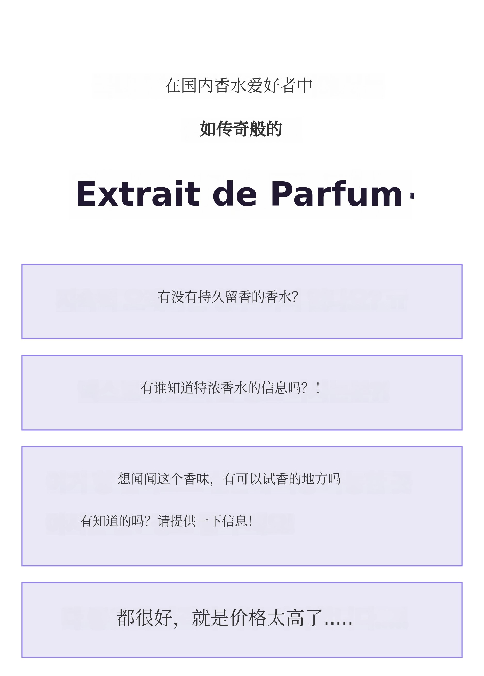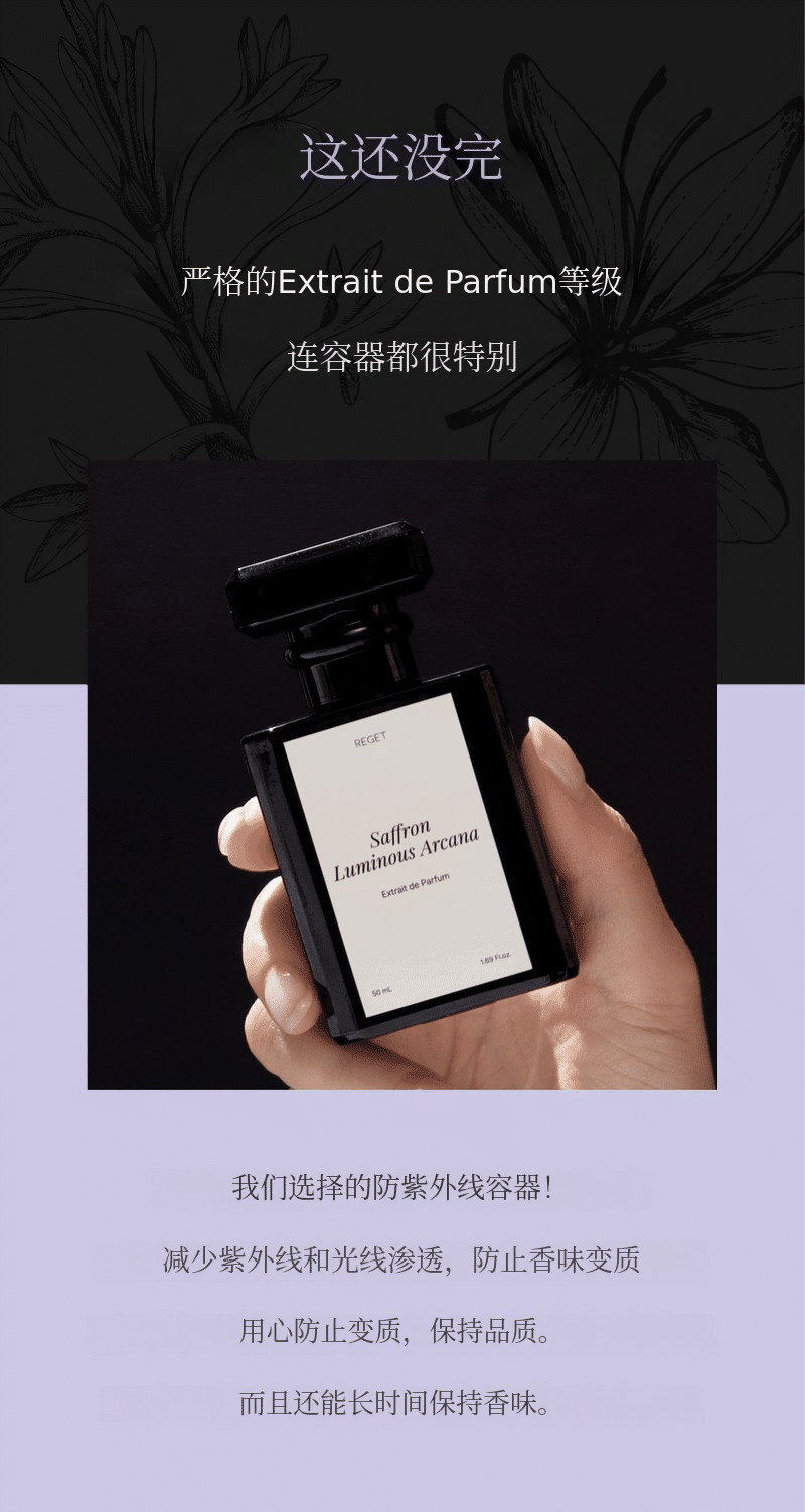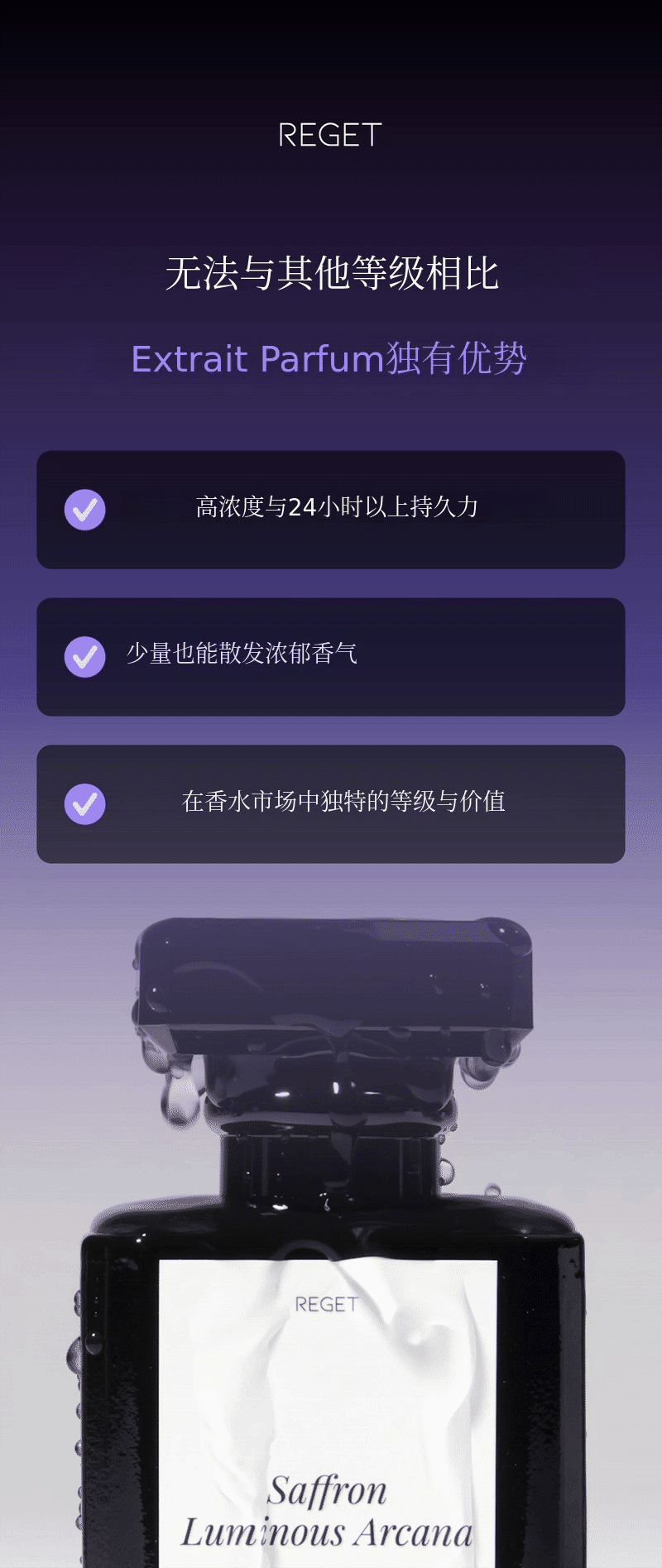 采用高级原料,拥有普通香水2-3倍香精浓度的Extrait de Parfum,在国内品牌中尚无此类产品,只能在海外购买,是稀有的香水。