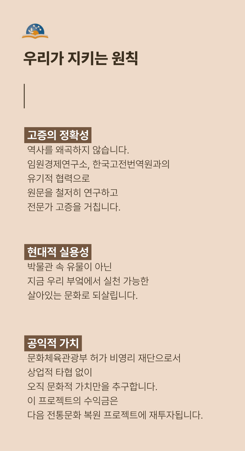 그리고 2015년, 번역을 넘어 문화를 ‘살아 숨 쉬는 유산’으로 되살리기 위해 문화체육관광부 허가 비영리 재단 ‘풍석문화재단‘이 설립되었습니다.