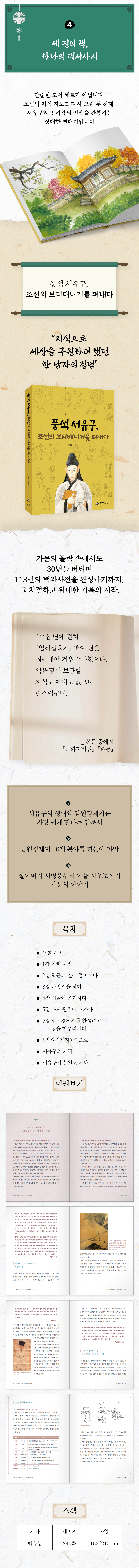 풍석 서유구 선생이 남긴 저술의 번역과 출판, 선양 사업을 진행하고 있습니다. 2016년부터 2028년까지 임원경제지 완역 프로젝트를 진행 중이며, 서유구 선생의 업적을 현대에 되살리는 유일한 전문 출판사입니다.
