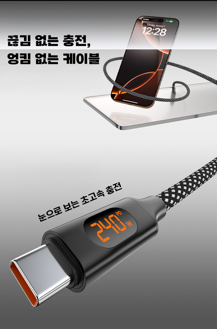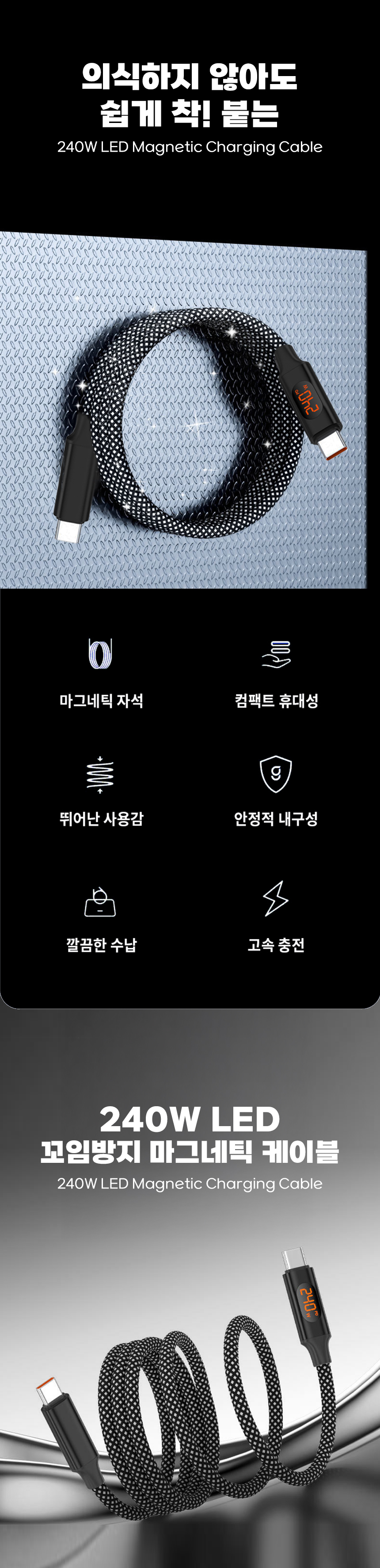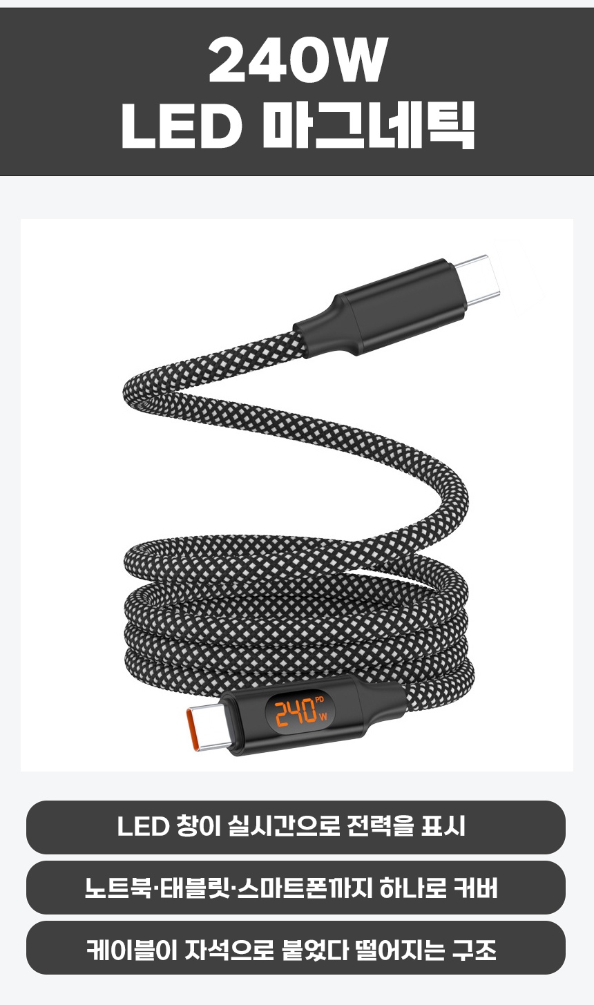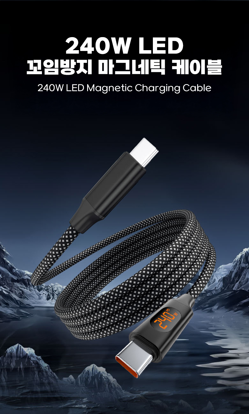 일상에서 케이블이 꼬이고 엉키는 문제는 누구나 경험하는 불편입니다. 특히 고속충전을 지원하는 케이블일수록 제대로 연결되지 않으면 충전 속도가 떨어지거나 안전 문제까지 발생할 수 있습니다. 이를 해결하기 위해, 마그네틱 기능으로 줄꼬임을 방지하고 LED 표시창으로 충전 상태를 눈으로 직접 확인할 수 있는 240W 고속충전 케이블을 선보이게 되었습니다. 스마트폰부터 노트북까지 다양한 기기와 호환되며, 깔끔하고 안전하게 충전할 수 있는 환경을 제공하고자 합니다. 매일 사용하는 케이블의 불편함을 한 번에 해결하고, 사용자에게 직관적이고 편리한 경험을 제공하기 위해 이번 프로젝트를 기획했습니다.