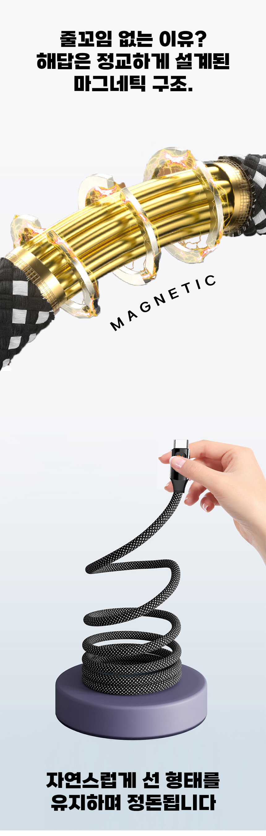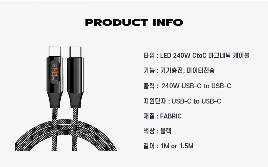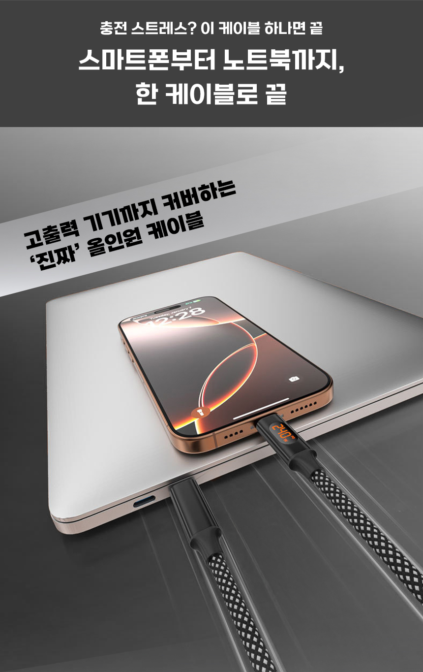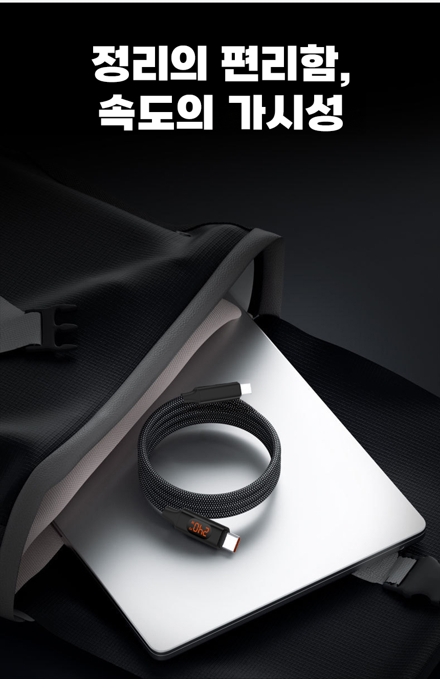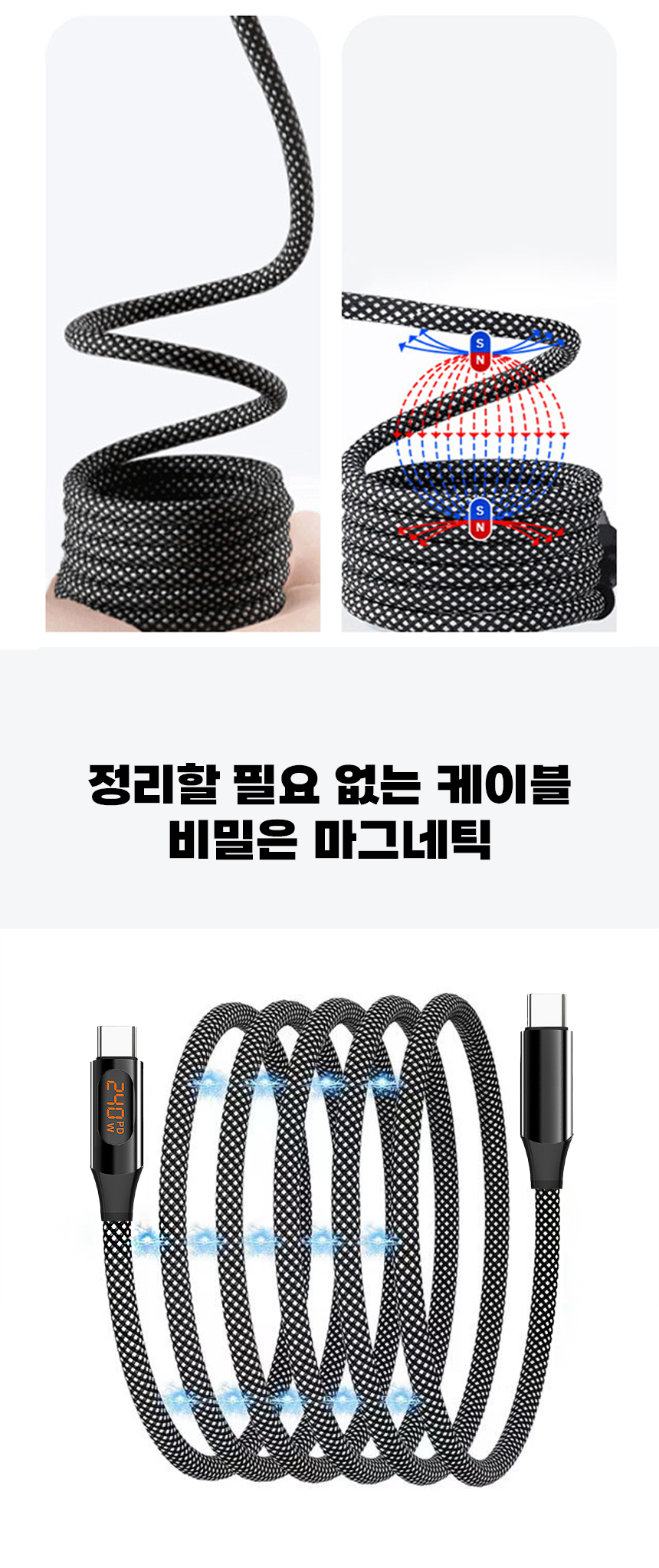 일상에서 케이블이 꼬이고 엉키는 문제는 누구나 경험하는 불편입니다. 특히 고속충전을 지원하는 케이블일수록 제대로 연결되지 않으면 충전 속도가 떨어지거나 안전 문제까지 발생할 수 있습니다. 이를 해결하기 위해, 마그네틱 기능으로 줄꼬임을 방지하고 LED 표시창으로 충전 상태를 눈으로 직접 확인할 수 있는 240W 고속충전 케이블을 선보이게 되었습니다. 스마트폰부터 노트북까지 다양한 기기와 호환되며, 깔끔하고 안전하게 충전할 수 있는 환경을 제공하고자 합니다. 매일 사용하는 케이블의 불편함을 한 번에 해결하고, 사용자에게 직관적이고 편리한 경험을 제공하기 위해 이번 프로젝트를 기획했습니다.