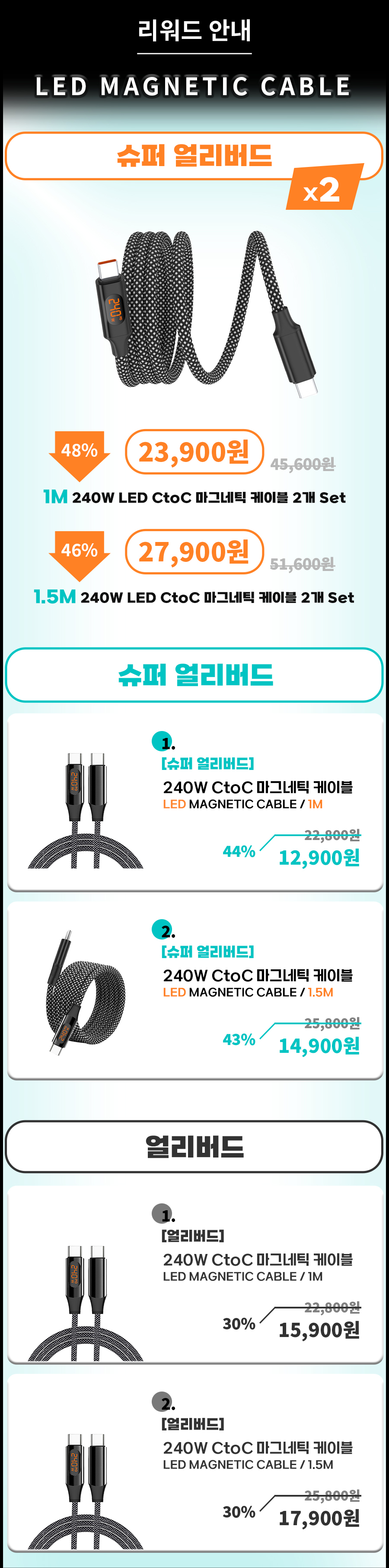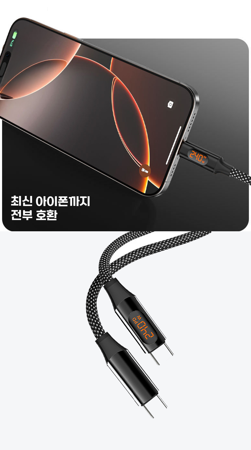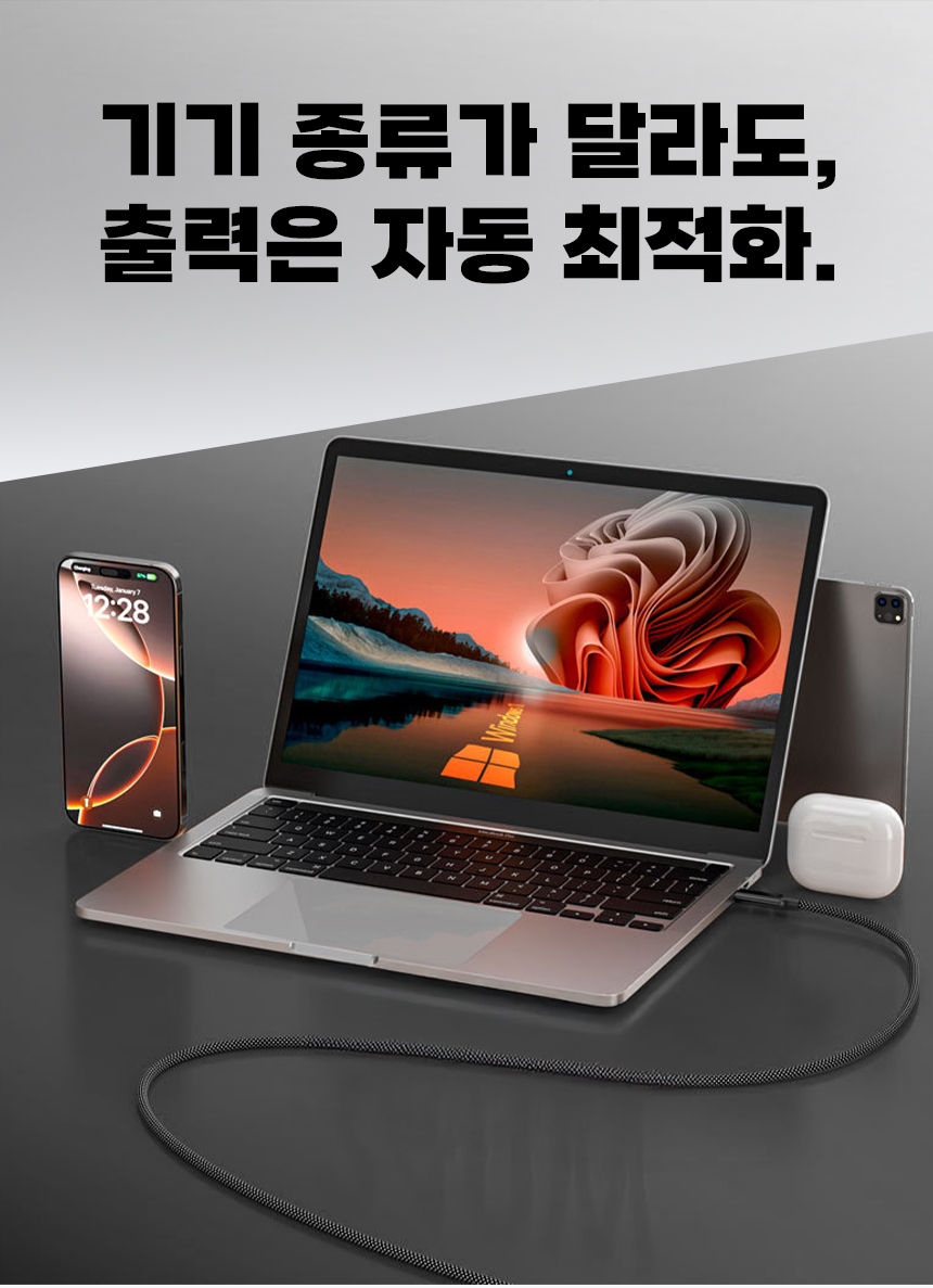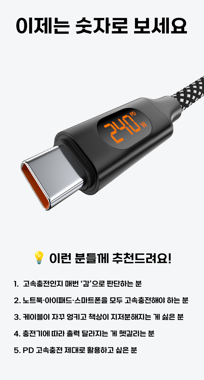 일상에서 케이블이 꼬이고 엉키는 문제는 누구나 경험하는 불편입니다. 특히 고속충전을 지원하는 케이블일수록 제대로 연결되지 않으면 충전 속도가 떨어지거나 안전 문제까지 발생할 수 있습니다. 이를 해결하기 위해, 마그네틱 기능으로 줄꼬임을 방지하고 LED 표시창으로 충전 상태를 눈으로 직접 확인할 수 있는 240W 고속충전 케이블을 선보이게 되었습니다. 스마트폰부터 노트북까지 다양한 기기와 호환되며, 깔끔하고 안전하게 충전할 수 있는 환경을 제공하고자 합니다. 매일 사용하는 케이블의 불편함을 한 번에 해결하고, 사용자에게 직관적이고 편리한 경험을 제공하기 위해 이번 프로젝트를 기획했습니다.