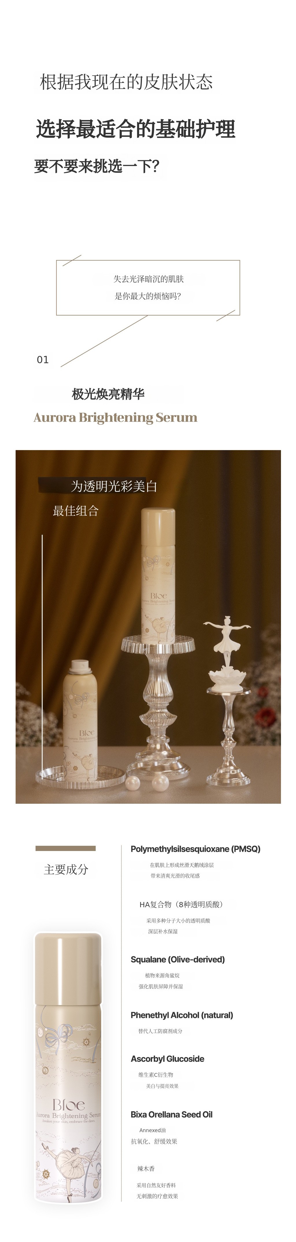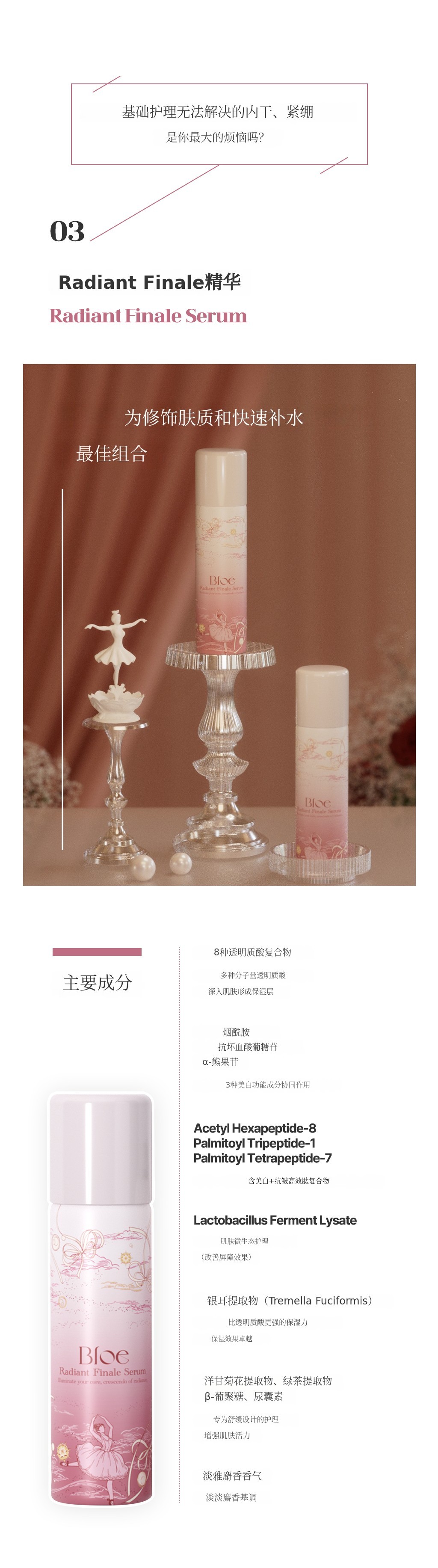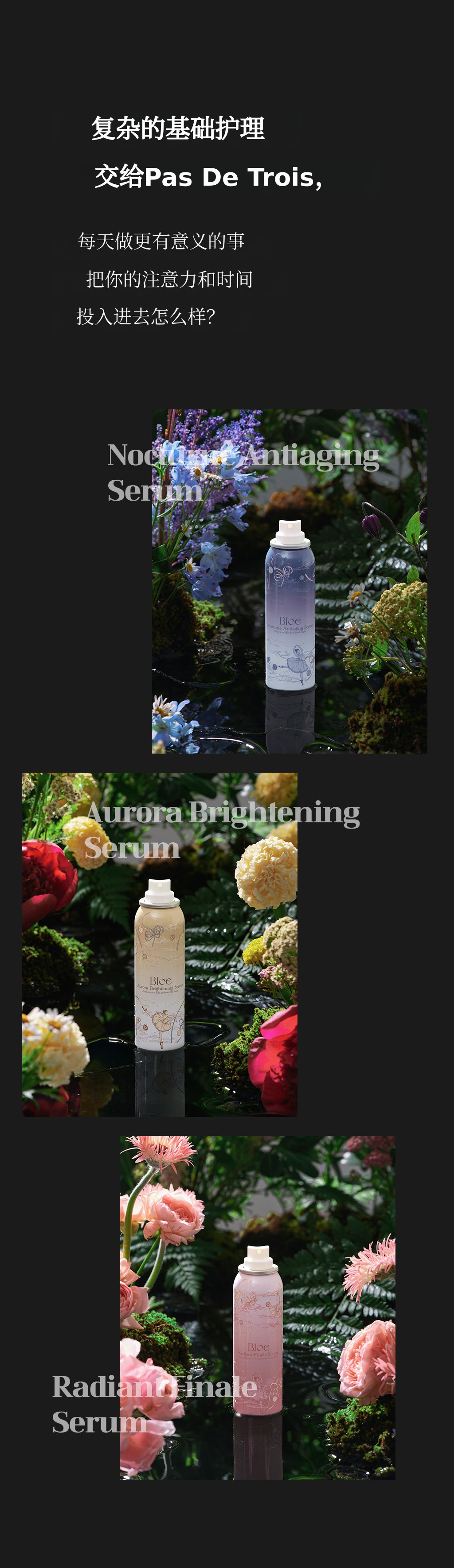 Bloe是一个融合感性与艺术的高端美妆品牌,致力于开发最大化肌肤本真之美的创新护肤产品。本次“Pas De Trois”系列意为“三位舞者和谐共舞”,以芭蕾的优雅与和谐为灵感,将美白、补水舒缓、胶原蛋白护理三大功效相结合,打造出协同增效的三步定制全能解决方案。