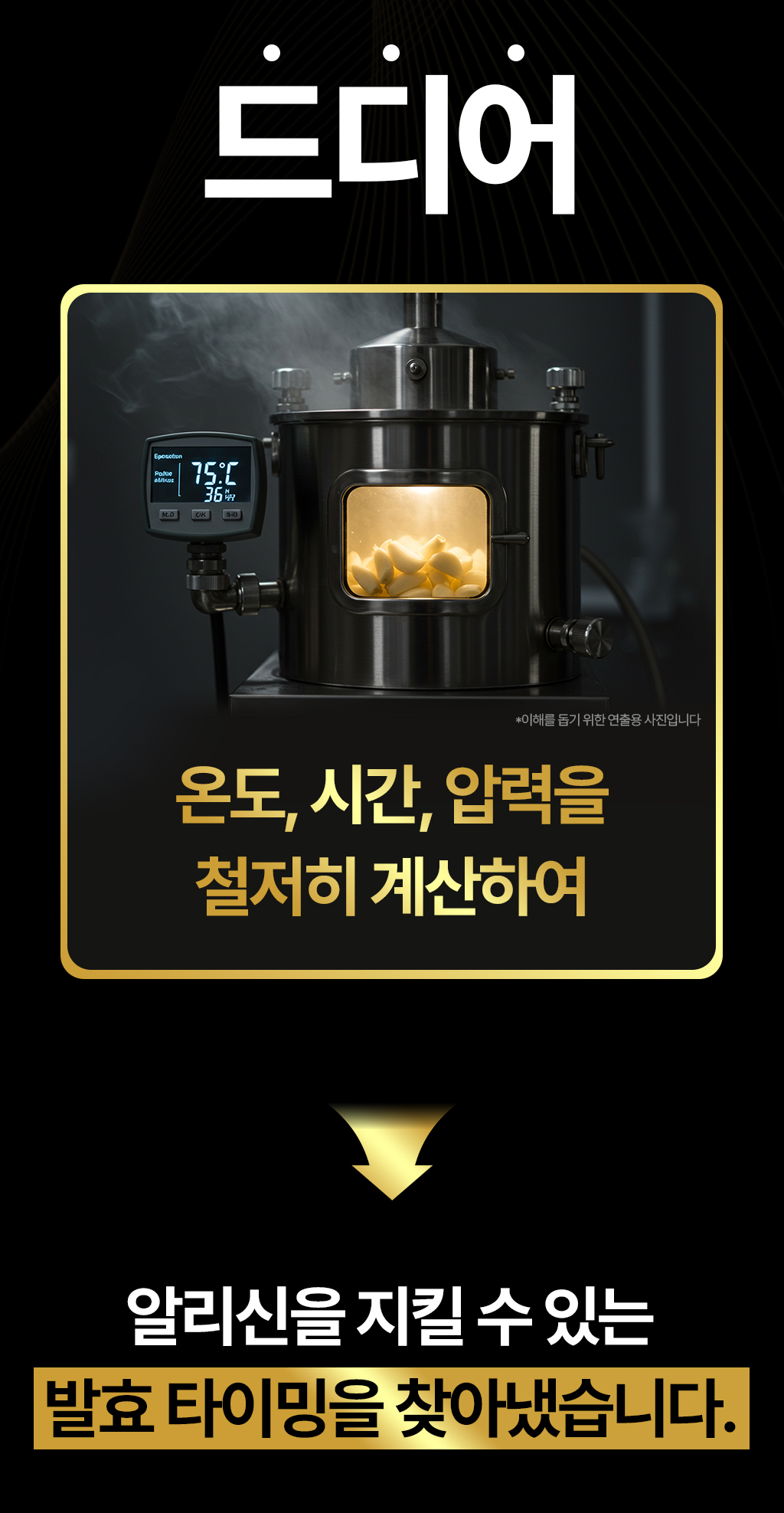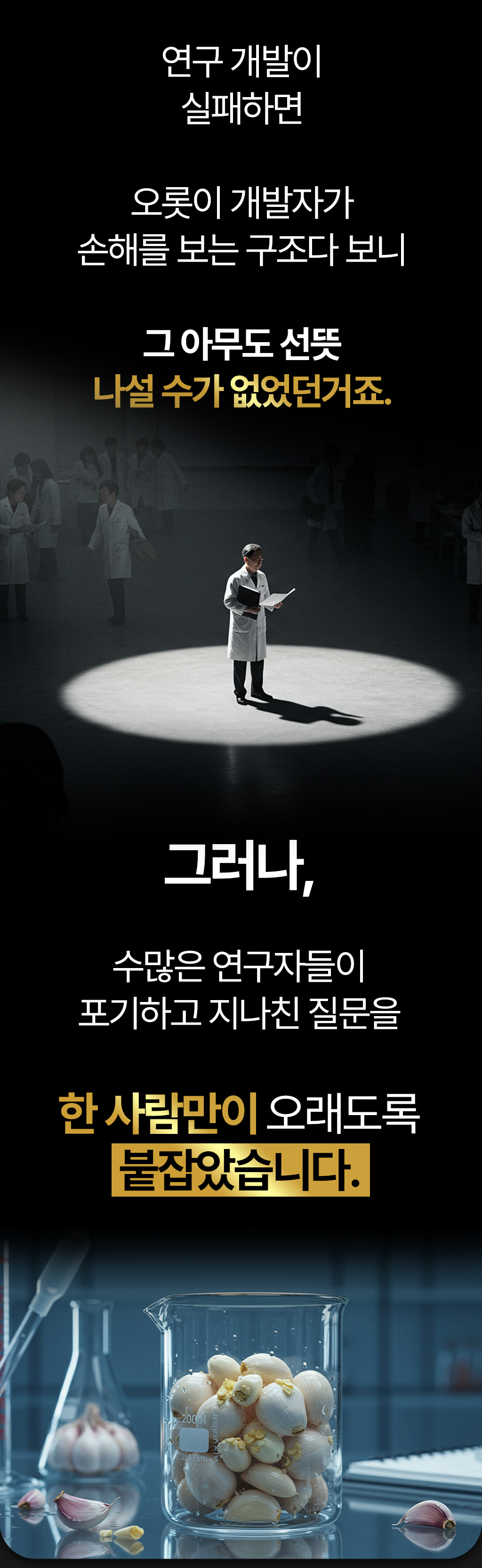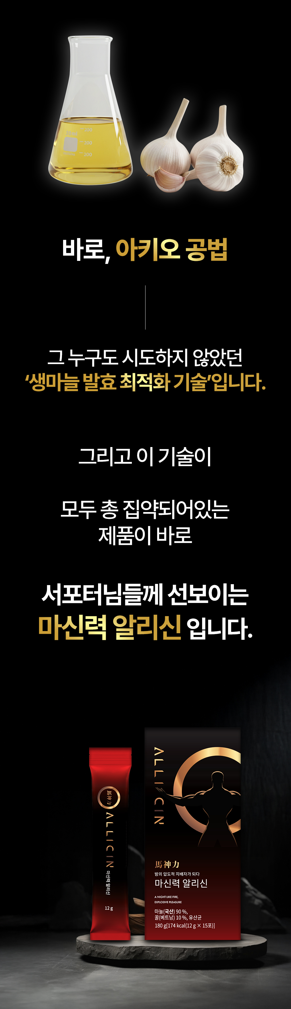 그 결과, 우리는 마늘 속 알리신을 안정화하는 '아키오 공법'을 개발하게 되었고, 이를 적용한 원료로 실제 임 시험까지 완료했습니다.