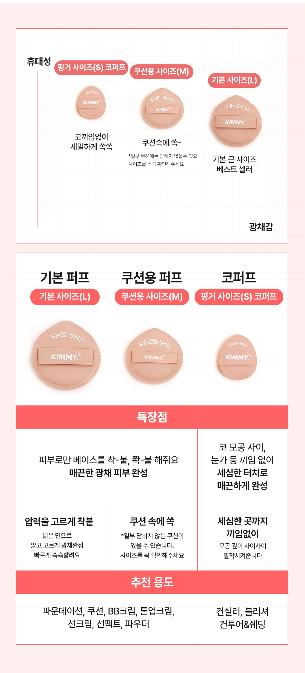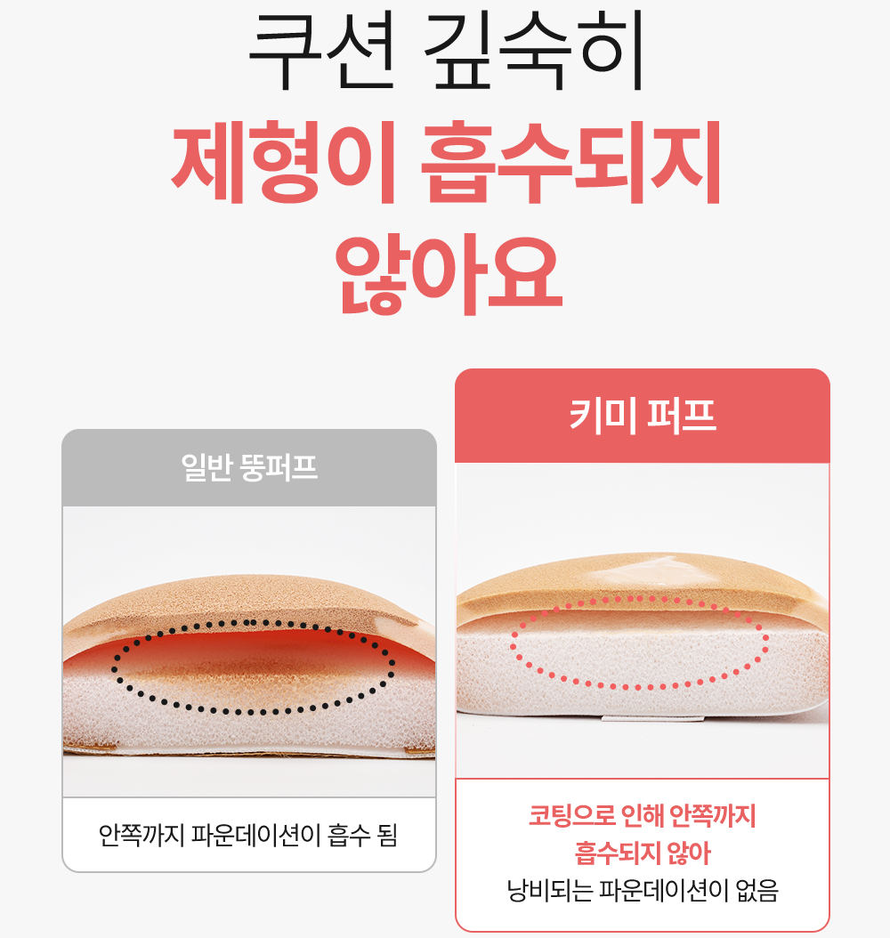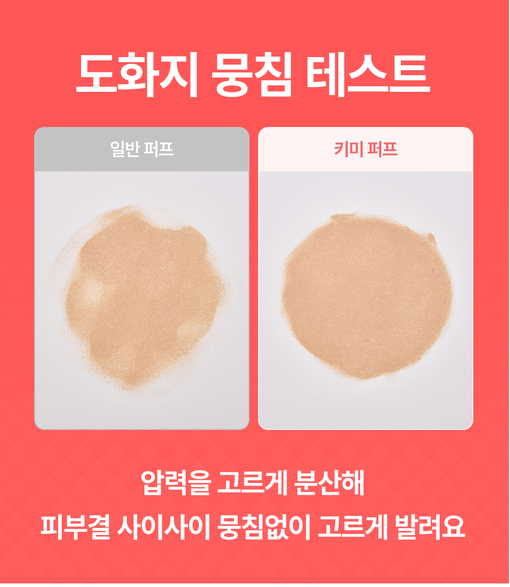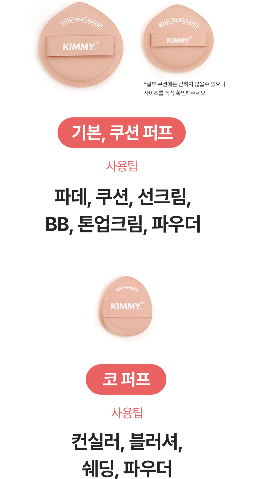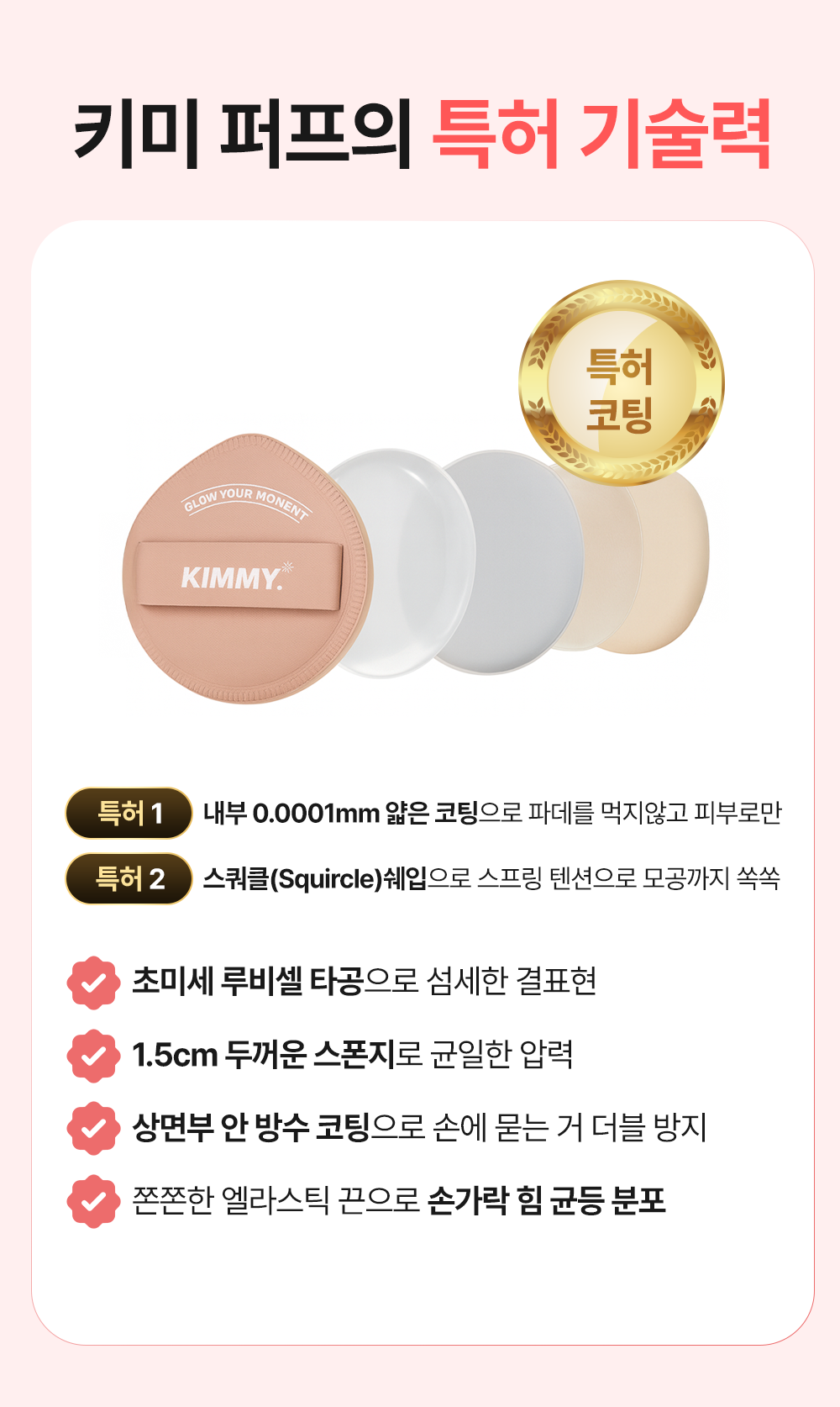 촉촉하기로 유명한 쿠션과 파데를 발랐는데도, 우와- 할만함의 광채는 저에게 나오지 않더라고요 문제가 뭘까? 찾아보다가 바로 “퍼프”에서 찾았어요. 아무리 촉촉한 쿠션으로 발라도, 퍼프가 수분감을 다 흡수해 버리는 것을 알게 되었지요! 수백개가 넘는 퍼프를 잘라보면서 피부로 수분감을 확실히 전달할 퍼프를 1년 넘게 연구했어요! 제조사를 찾는 것도 너무 힘들었지만, 저와 똑같은 고민을 하실 서포터님을 생각하면서 포기하지 않았습니다! 키미의 아기궁둥이 퍼프와 함께 피부의 생기와 촉촉한 광채 모두 뽐내 보세요^^ 키미가 돕겠습니다!