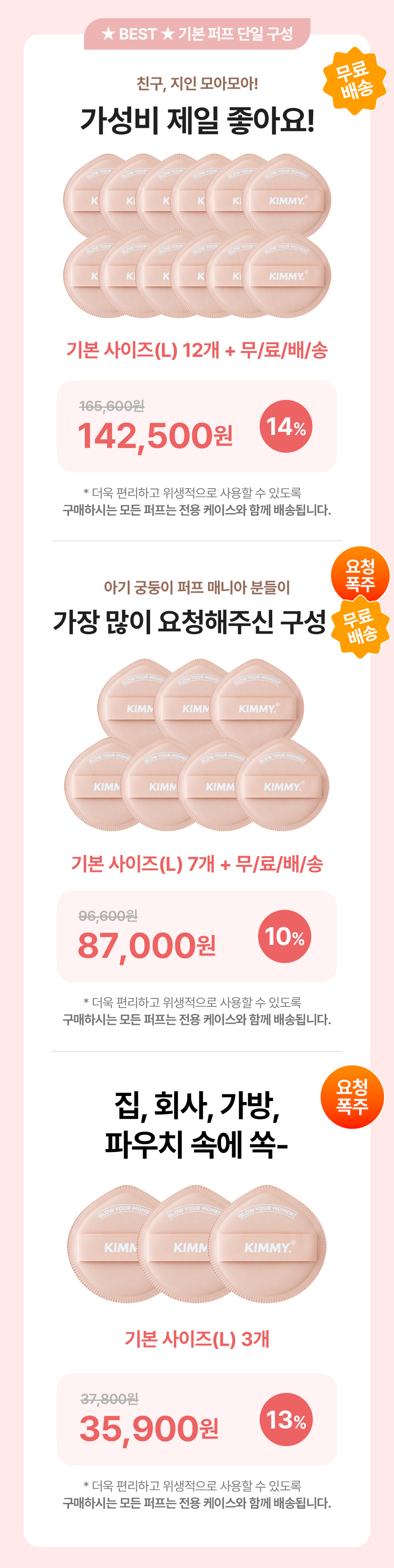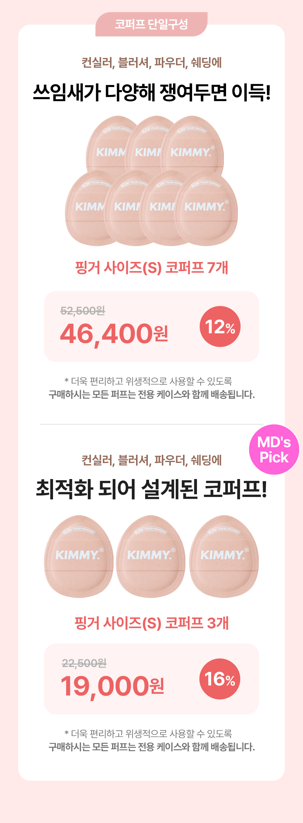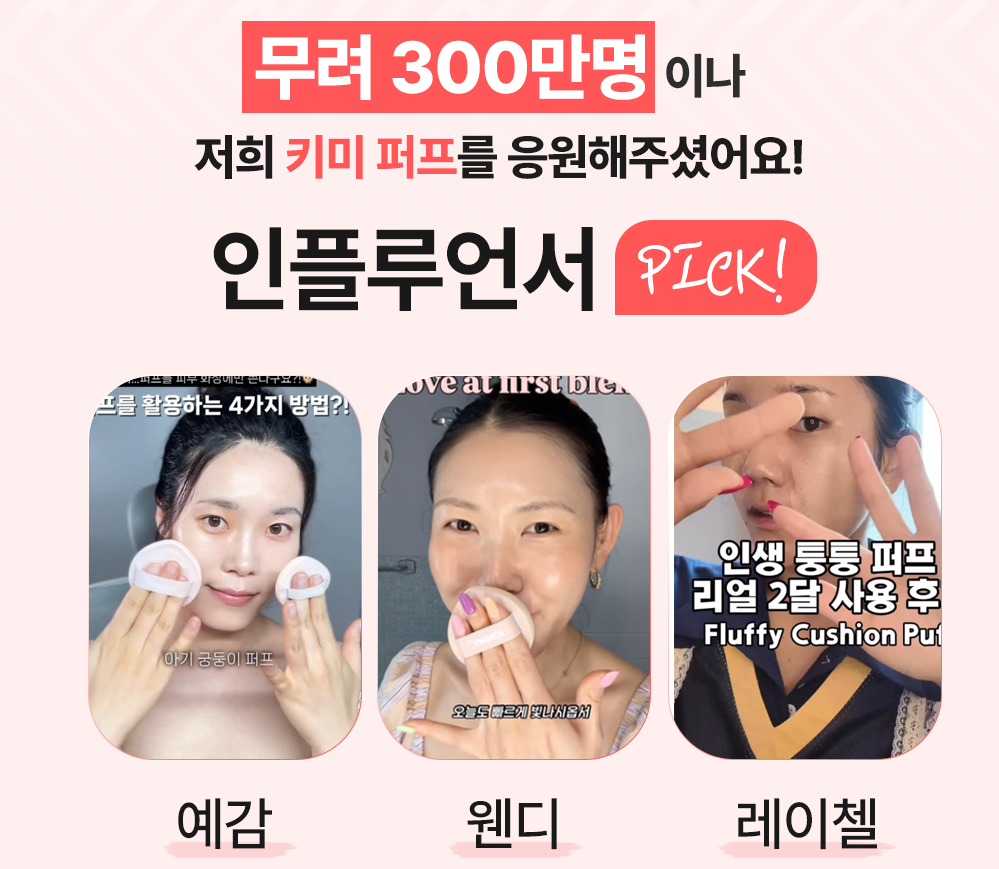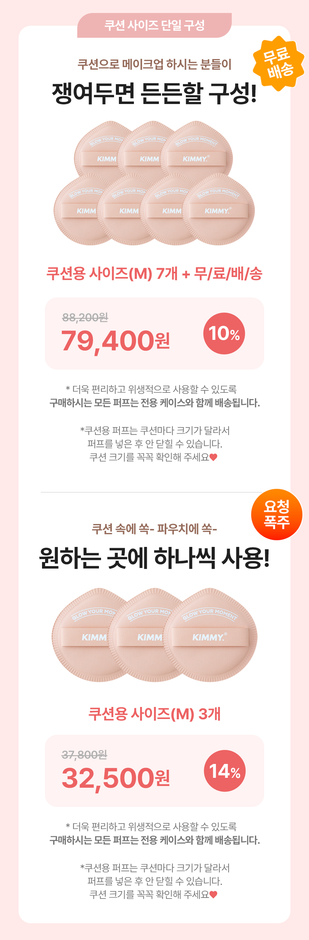 촉촉하기로 유명한 쿠션과 파데를 발랐는데도, 우와- 할만함의 광채는 저에게 나오지 않더라고요 문제가 뭘까? 찾아보다가 바로 “퍼프”에서 찾았어요. 아무리 촉촉한 쿠션으로 발라도, 퍼프가 수분감을 다 흡수해 버리는 것을 알게 되었지요! 수백개가 넘는 퍼프를 잘라보면서 피부로 수분감을 확실히 전달할 퍼프를 1년 넘게 연구했어요! 제조사를 찾는 것도 너무 힘들었지만, 저와 똑같은 고민을 하실 서포터님을 생각하면서 포기하지 않았습니다! 키미의 아기궁둥이 퍼프와 함께 피부의 생기와 촉촉한 광채 모두 뽐내 보세요^^ 키미가 돕겠습니다!