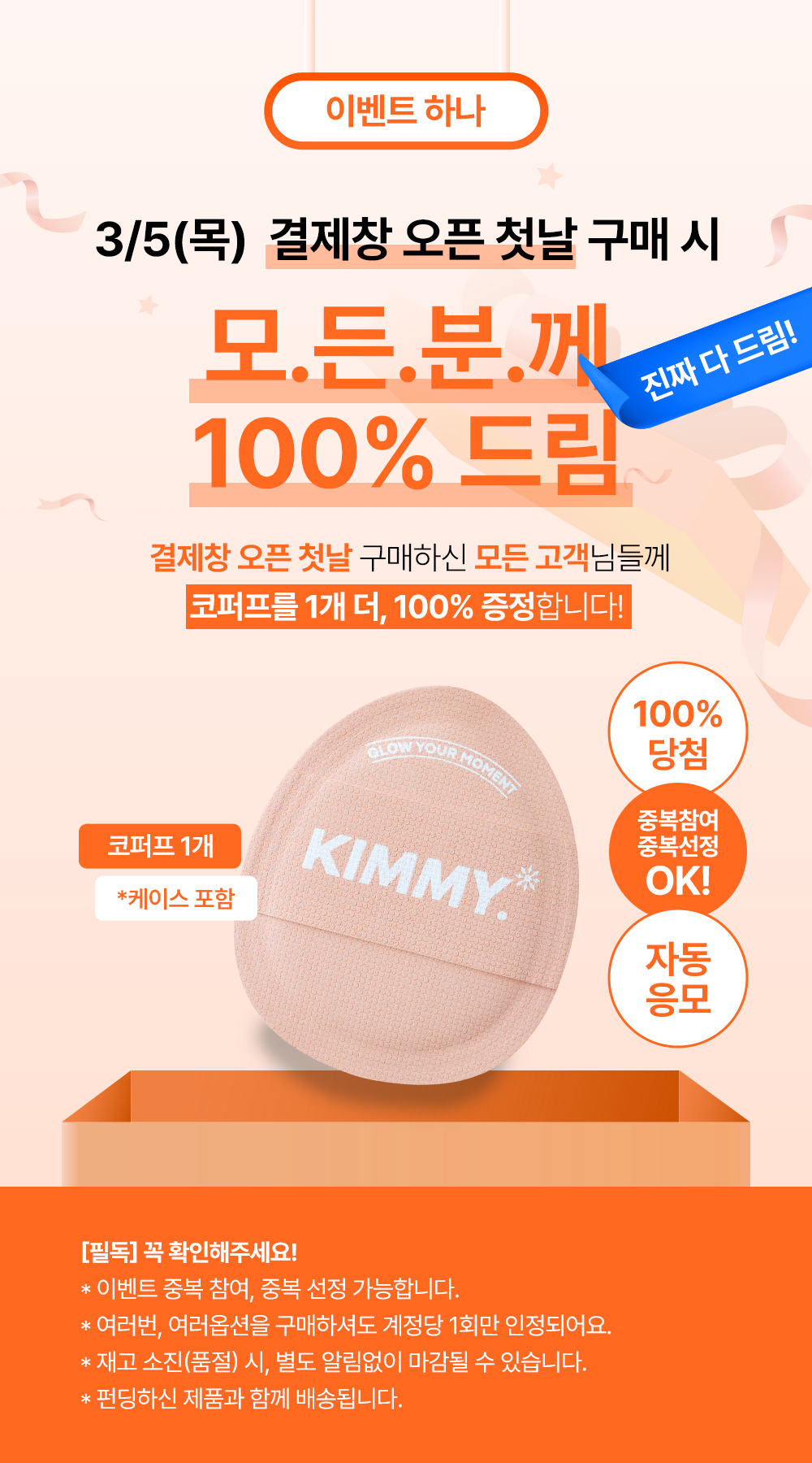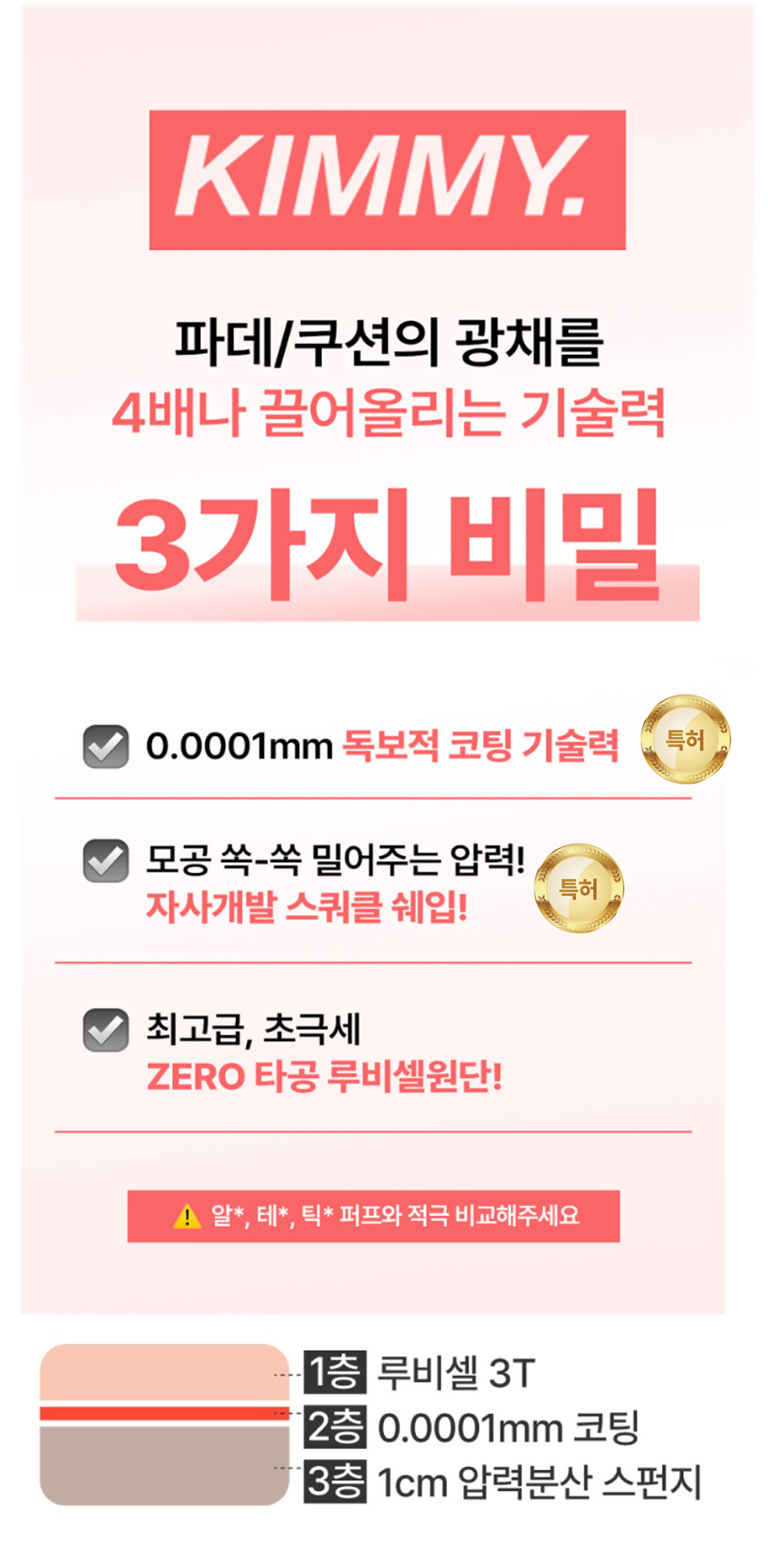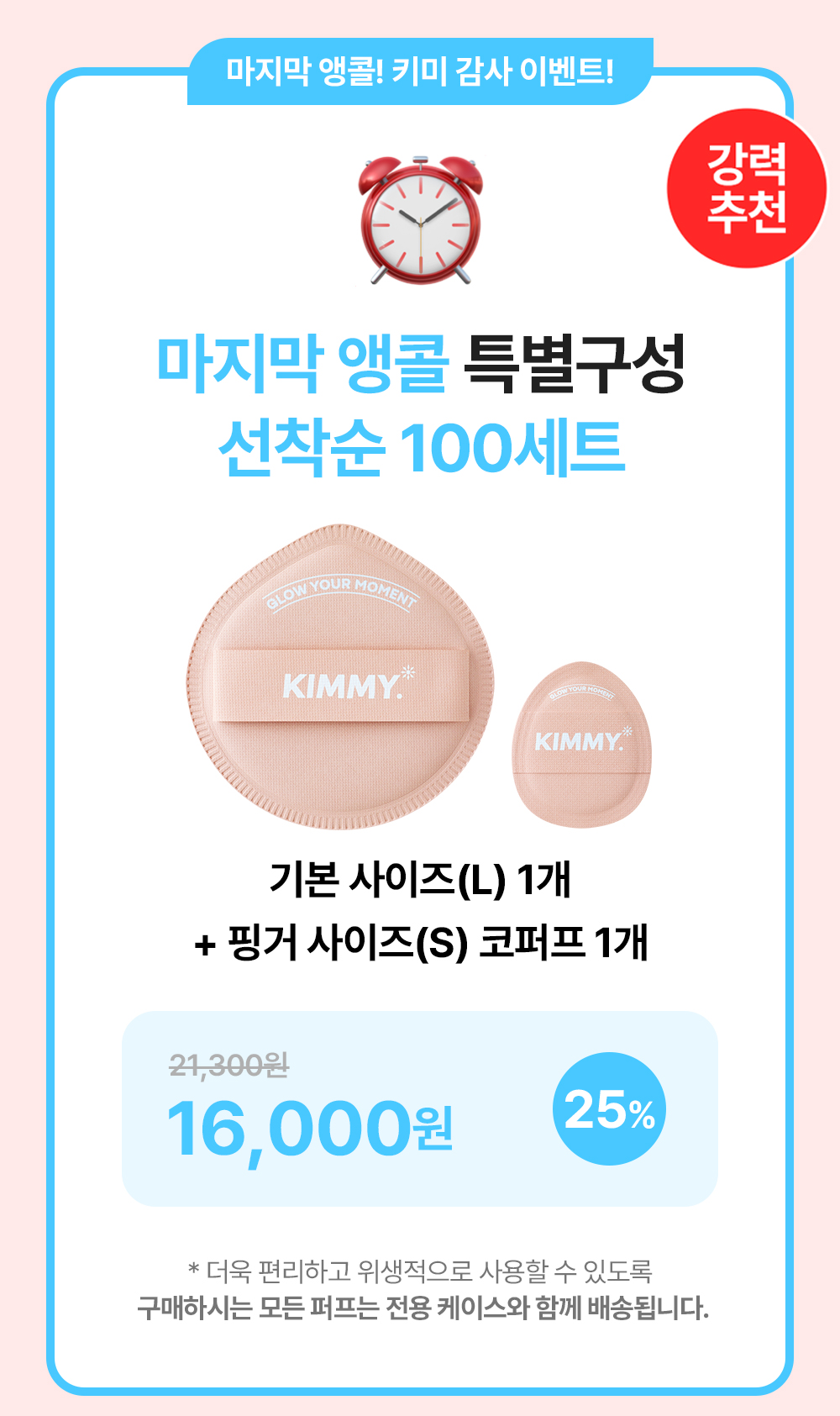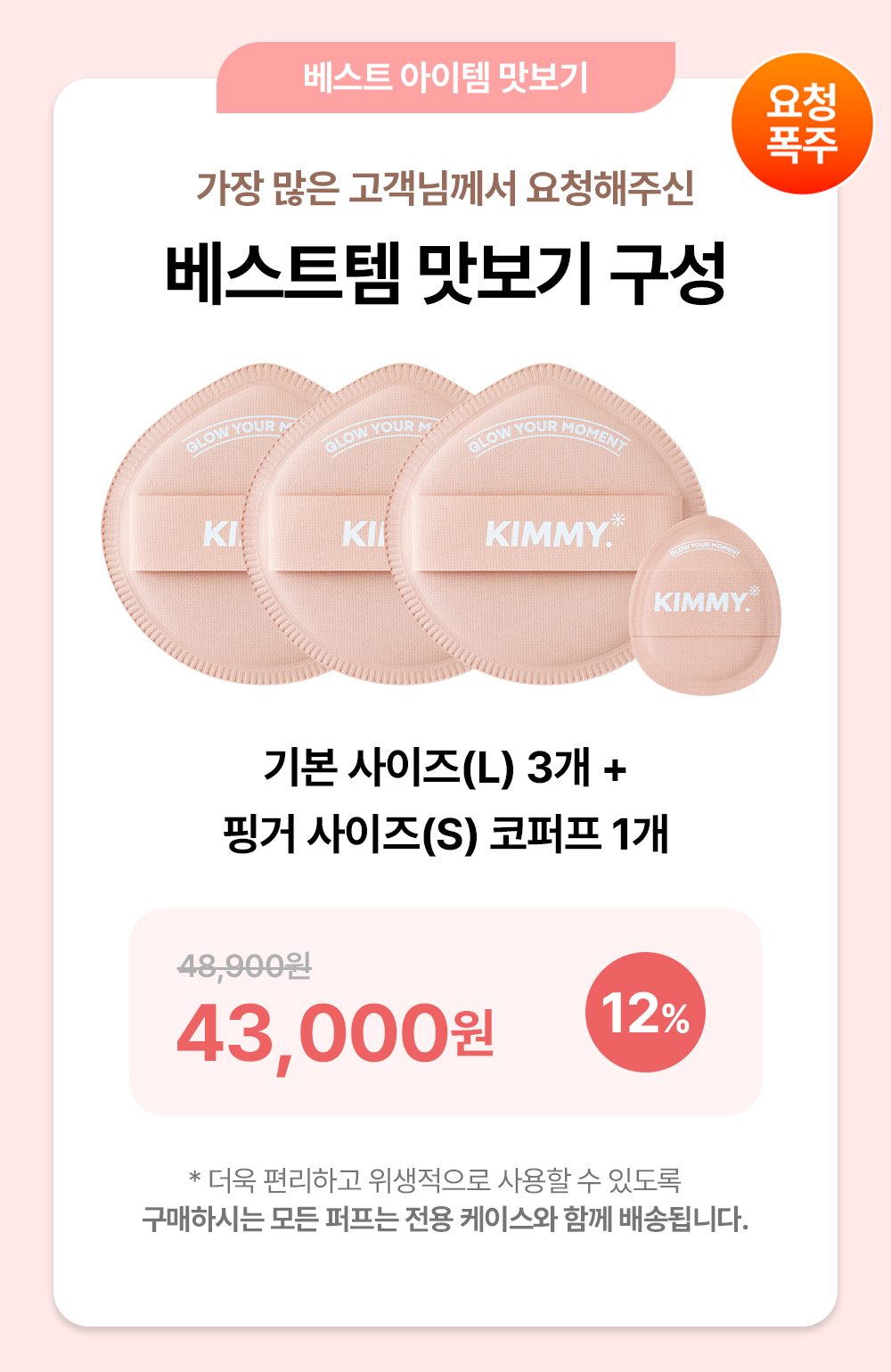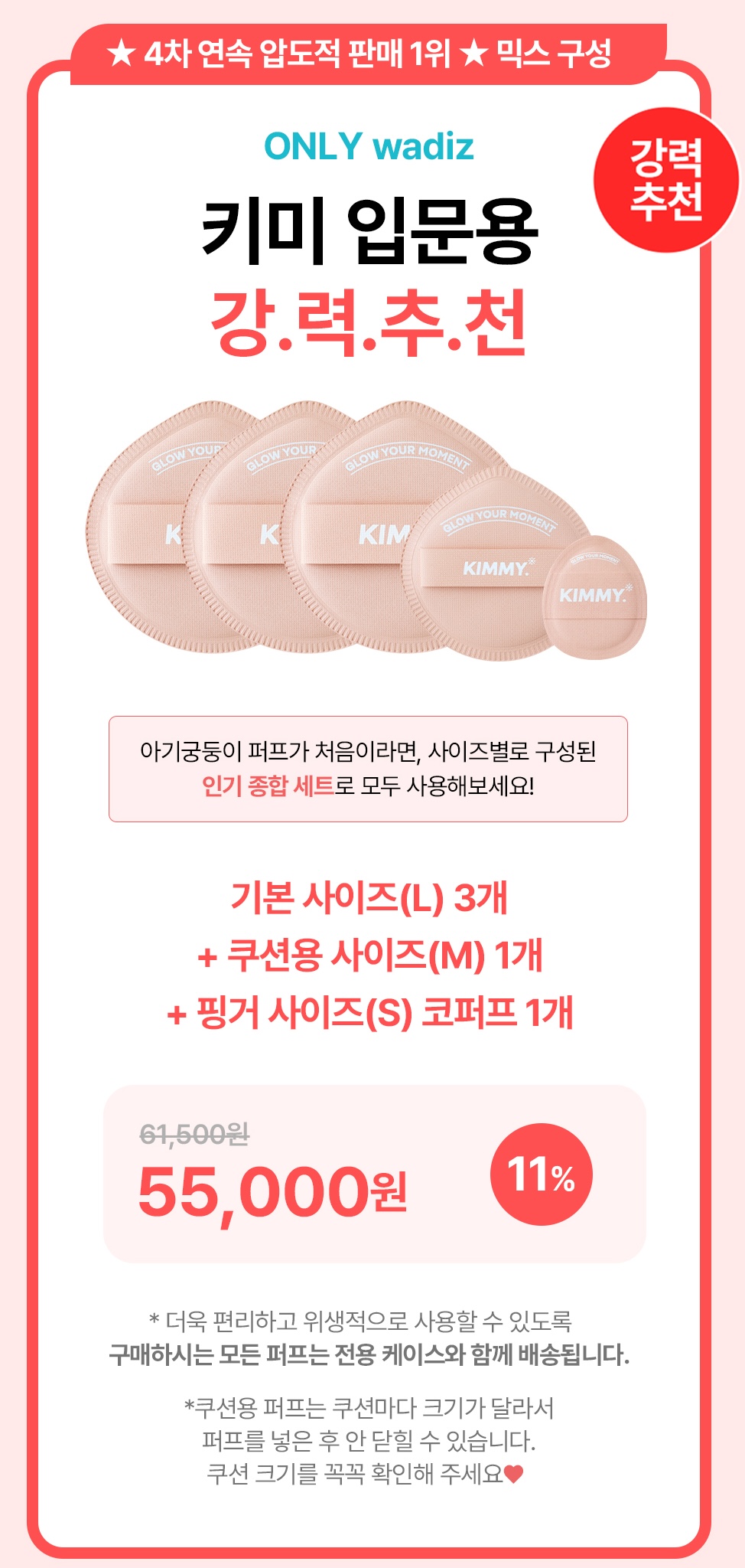 촉촉하기로 유명한 쿠션과 파데를 발랐는데도, 우와- 할만함의 광채는 저에게 나오지 않더라고요 문제가 뭘까? 찾아보다가 바로 “퍼프”에서 찾았어요. 아무리 촉촉한 쿠션으로 발라도, 퍼프가 수분감을 다 흡수해 버리는 것을 알게 되었지요! 수백개가 넘는 퍼프를 잘라보면서 피부로 수분감을 확실히 전달할 퍼프를 1년 넘게 연구했어요! 제조사를 찾는 것도 너무 힘들었지만, 저와 똑같은 고민을 하실 서포터님을 생각하면서 포기하지 않았습니다! 키미의 아기궁둥이 퍼프와 함께 피부의 생기와 촉촉한 광채 모두 뽐내 보세요^^ 키미가 돕겠습니다!