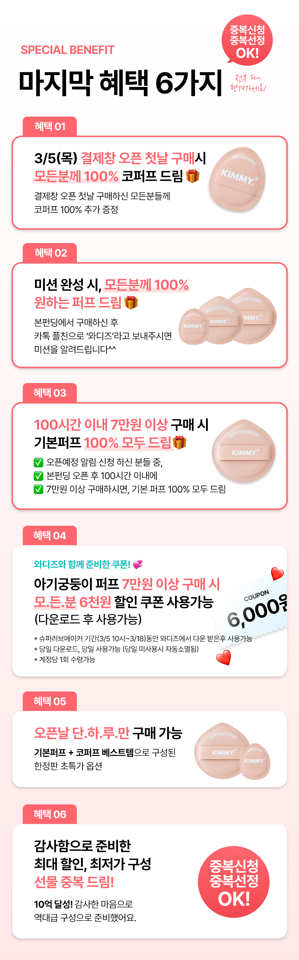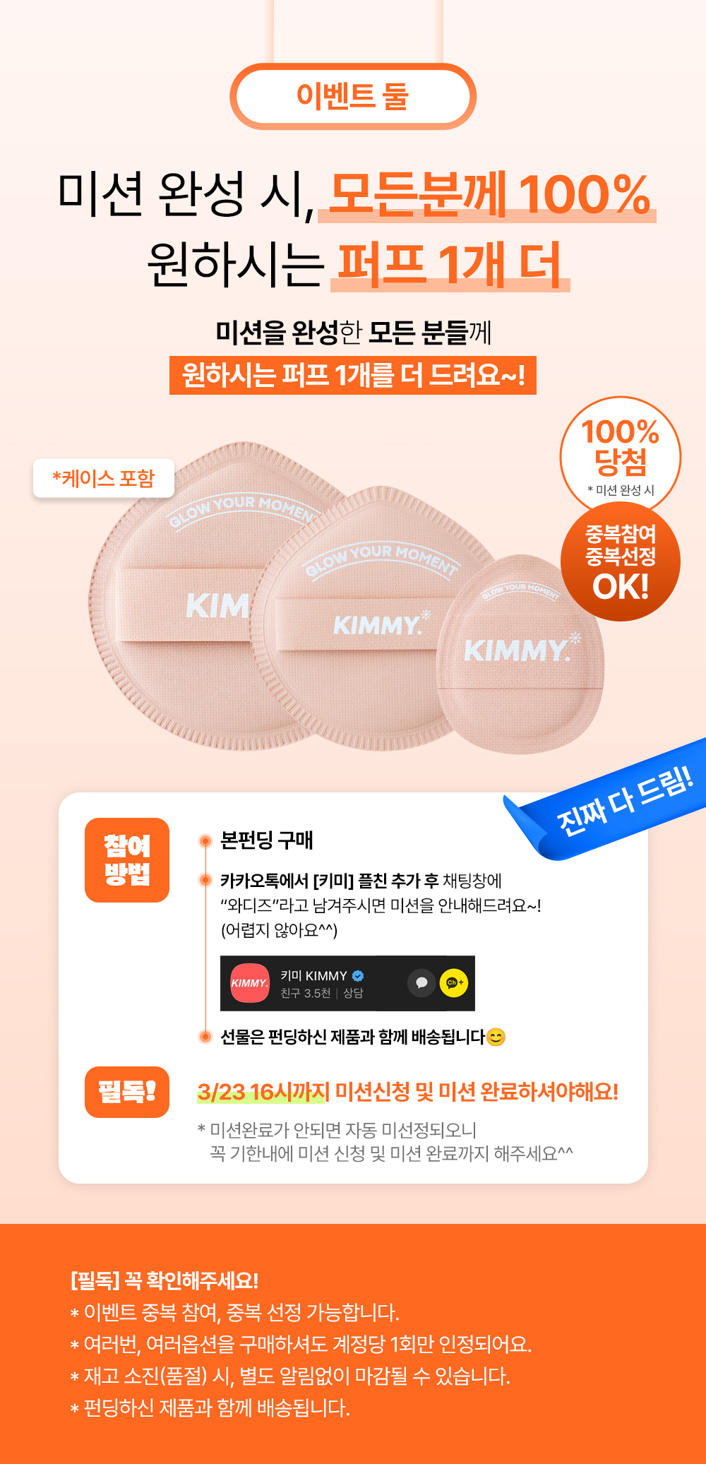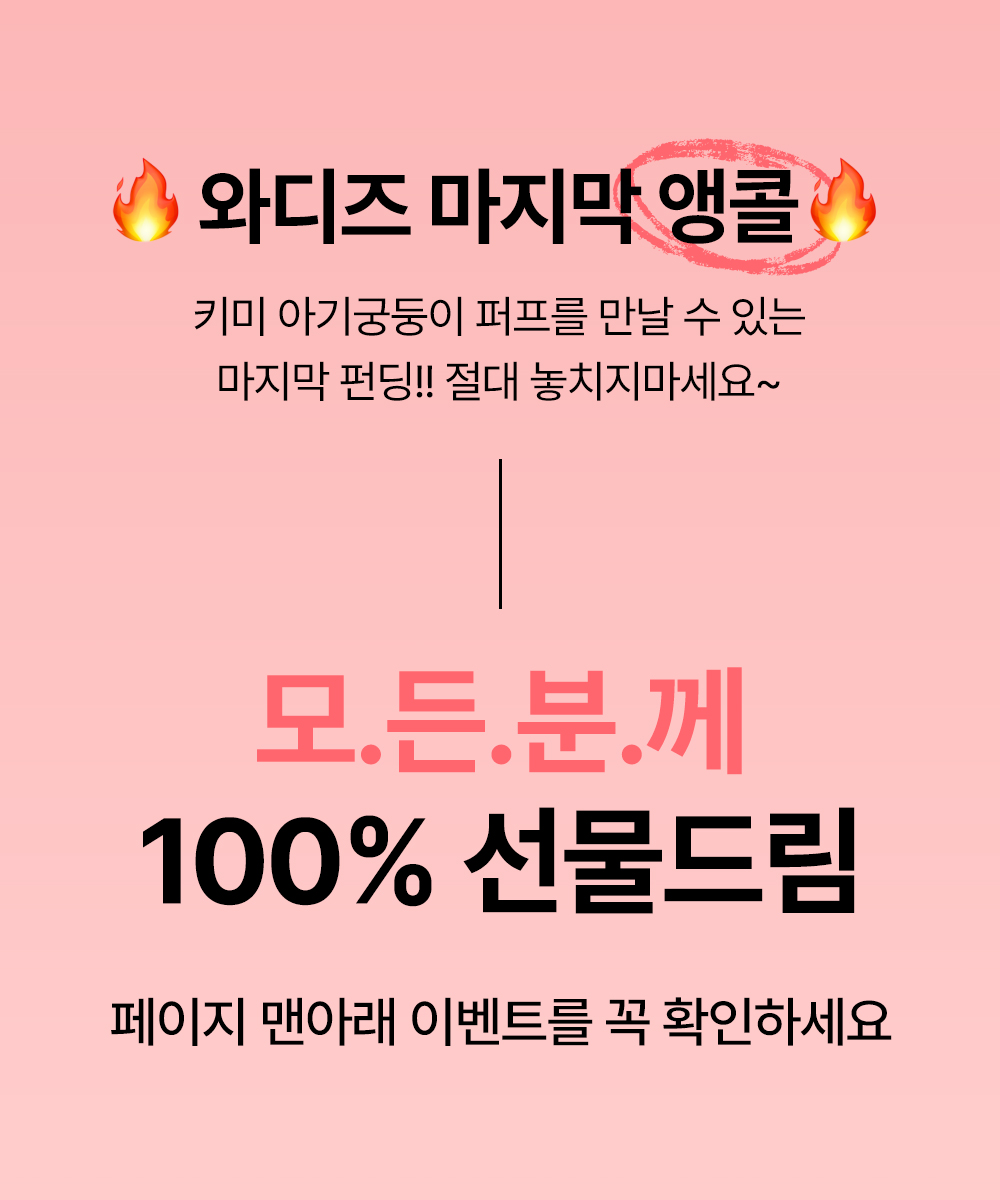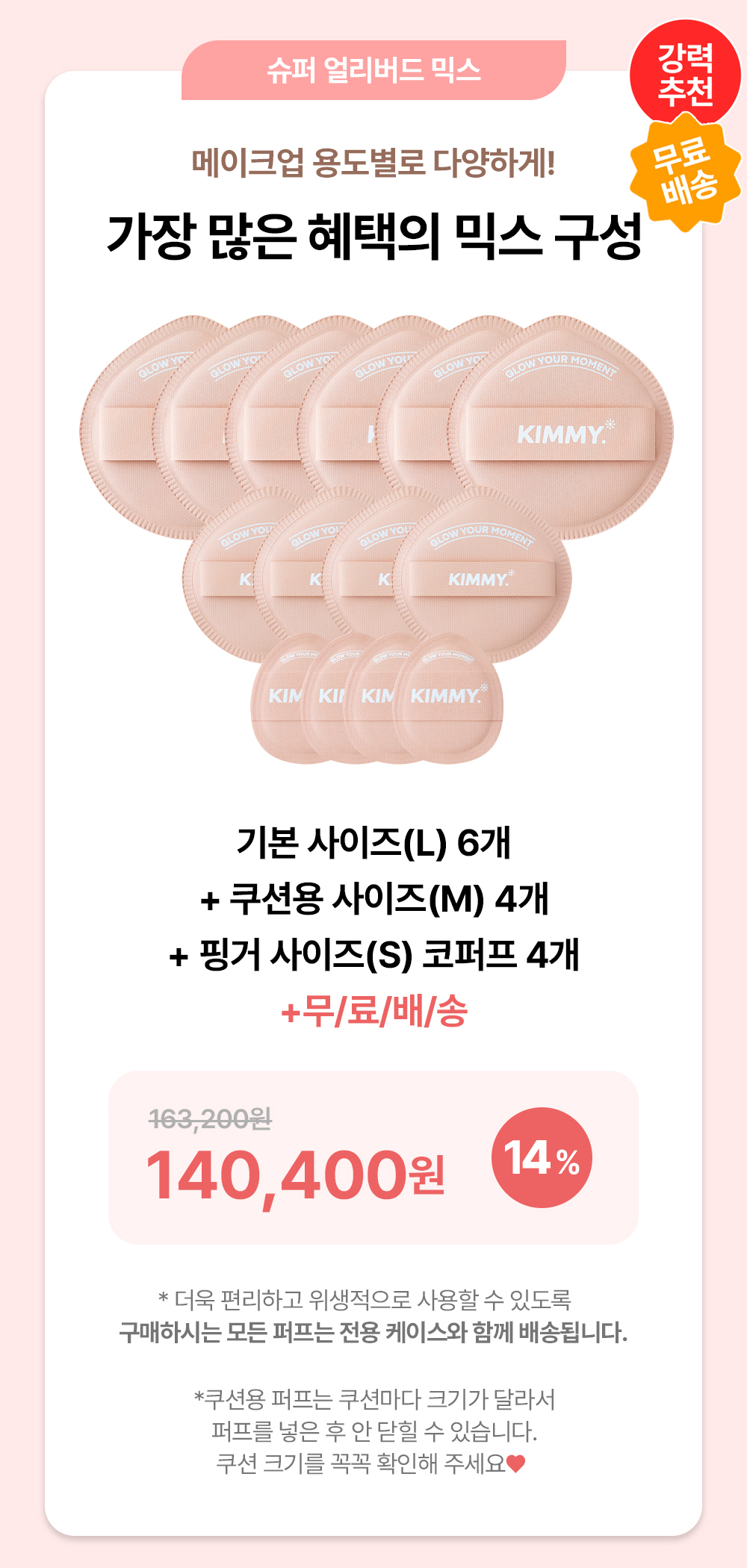 촉촉하기로 유명한 쿠션과 파데를 발랐는데도, 우와- 할만함의 광채는 저에게 나오지 않더라고요 문제가 뭘까? 찾아보다가 바로 “퍼프”에서 찾았어요. 아무리 촉촉한 쿠션으로 발라도, 퍼프가 수분감을 다 흡수해 버리는 것을 알게 되었지요! 수백개가 넘는 퍼프를 잘라보면서 피부로 수분감을 확실히 전달할 퍼프를 1년 넘게 연구했어요! 제조사를 찾는 것도 너무 힘들었지만, 저와 똑같은 고민을 하실 서포터님을 생각하면서 포기하지 않았습니다! 키미의 아기궁둥이 퍼프와 함께 피부의 생기와 촉촉한 광채 모두 뽐내 보세요^^ 키미가 돕겠습니다!