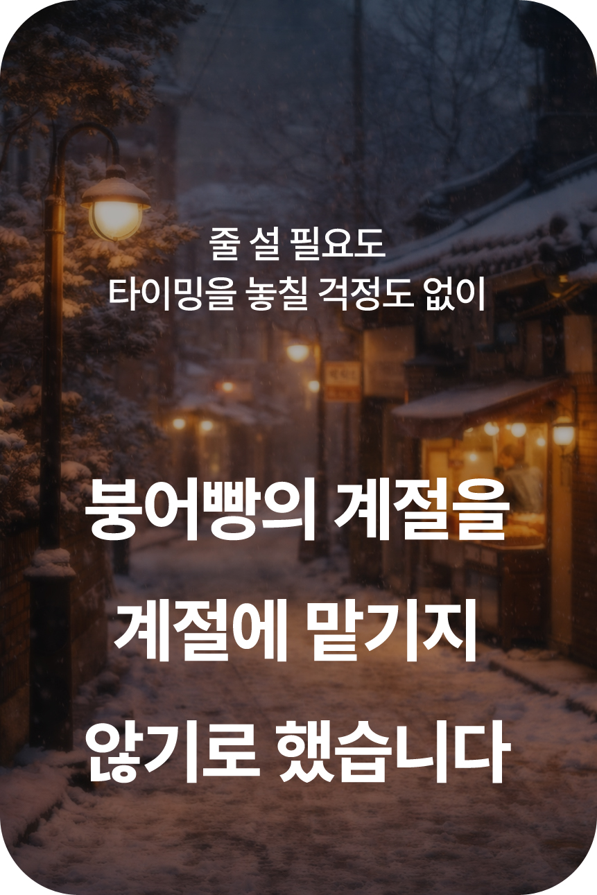 길거리 간식으로 소비되던 붕어빵을, 집에서도 같은 온도와 식감으로 즐길 수 있는 새로운 기준으로 만들고 싶었습니다.