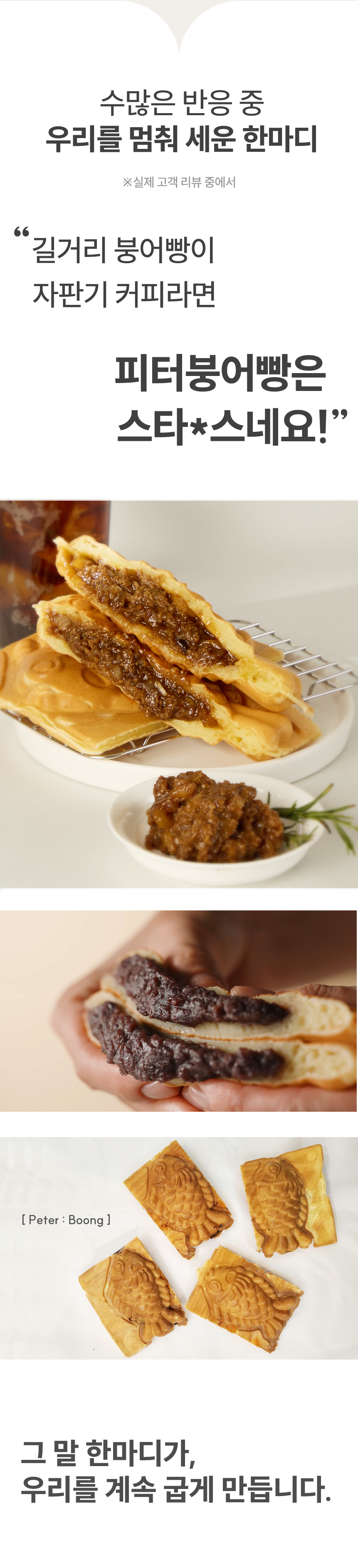 저희는 10년째 길거리에서 붕어빵을 무료로 나누며 사람들과 따뜻한 추억을 만들어 온 피터붕어빵 메이커입니다.