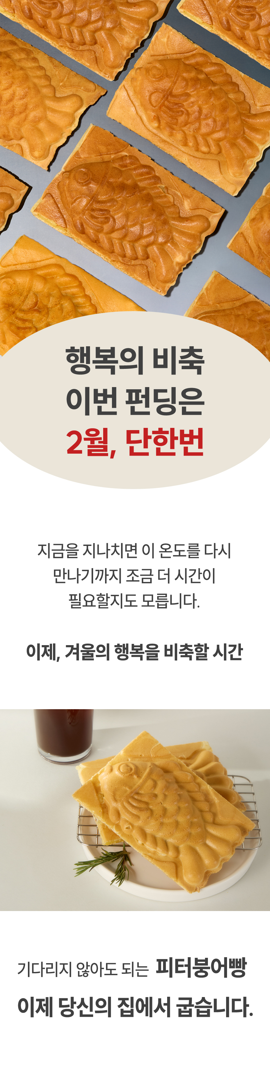 이번 프로젝트를 통해 붕어빵의 매력을 더욱 많은 분들에게 알리고, 사랑받는 브랜드로 성장하는 것이 저희의 목표입니다. 여러분의 작은 관심과 응원이 저희에게는 큰 힘이 됩니다. 피터붕어빵이 전하는 따뜻한 행복을 함께 만들어 가셨으면 좋겠습니다. 감사합니다!