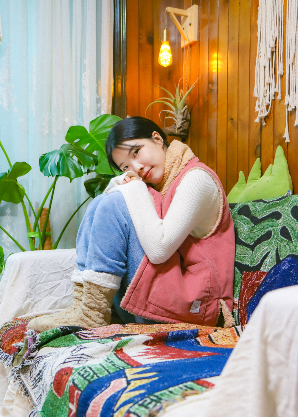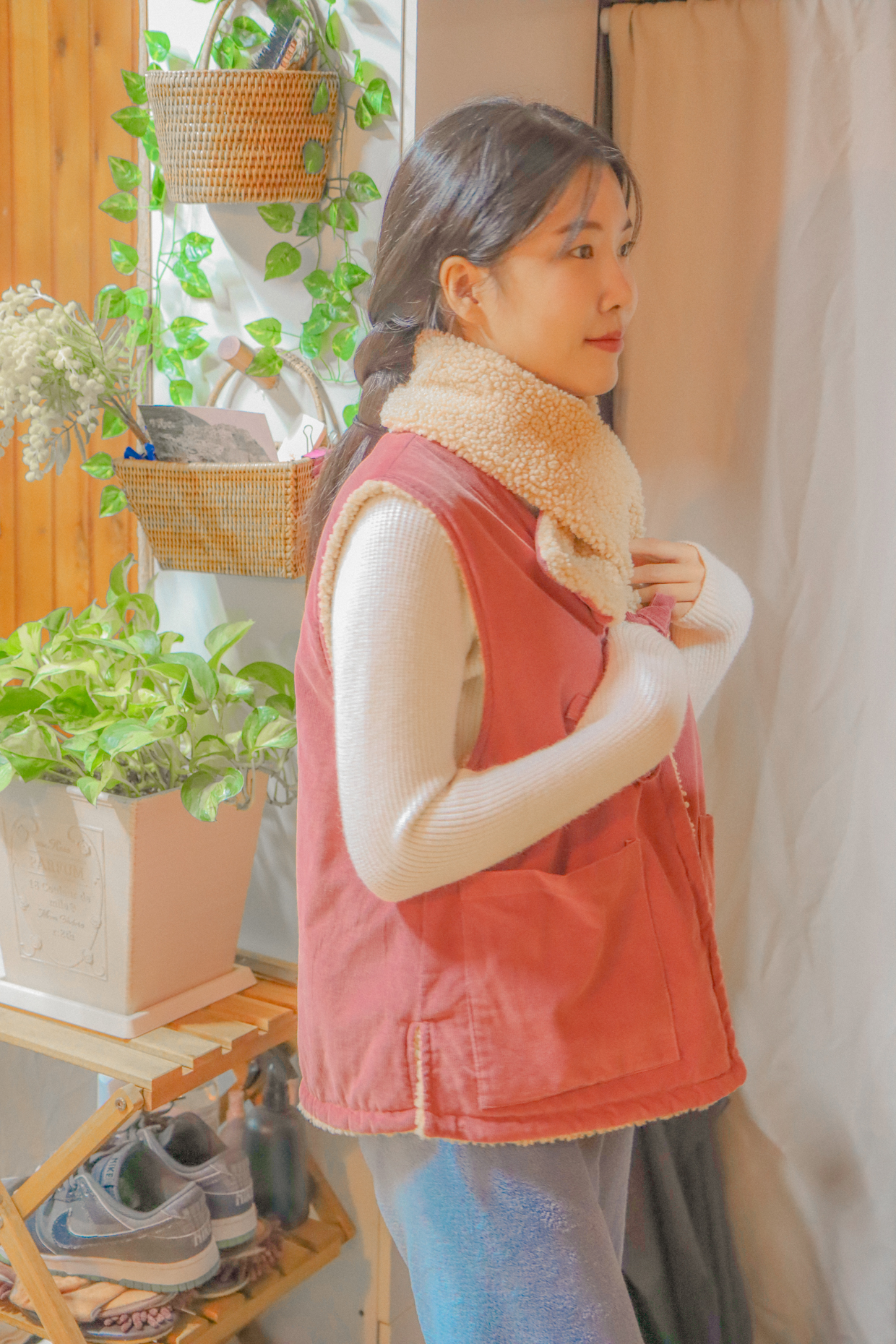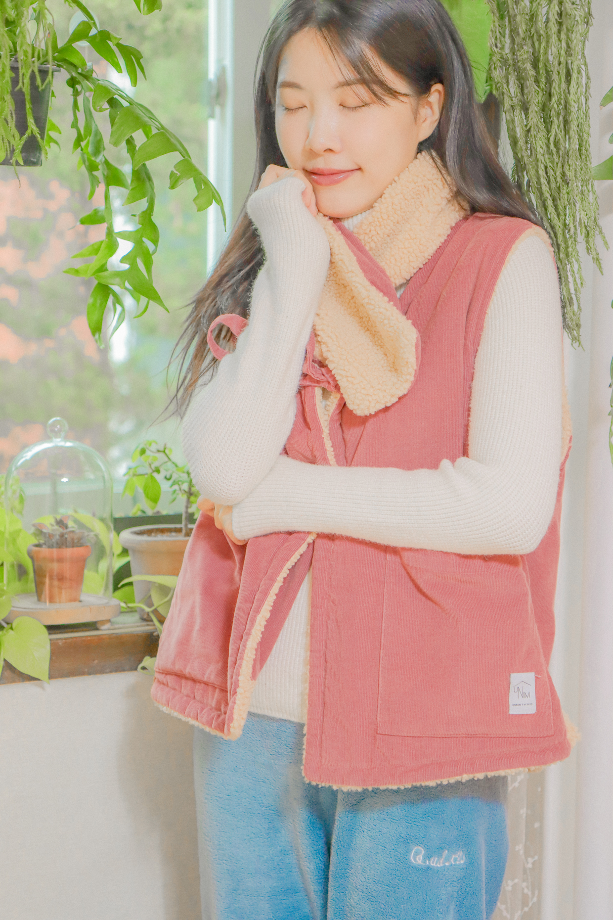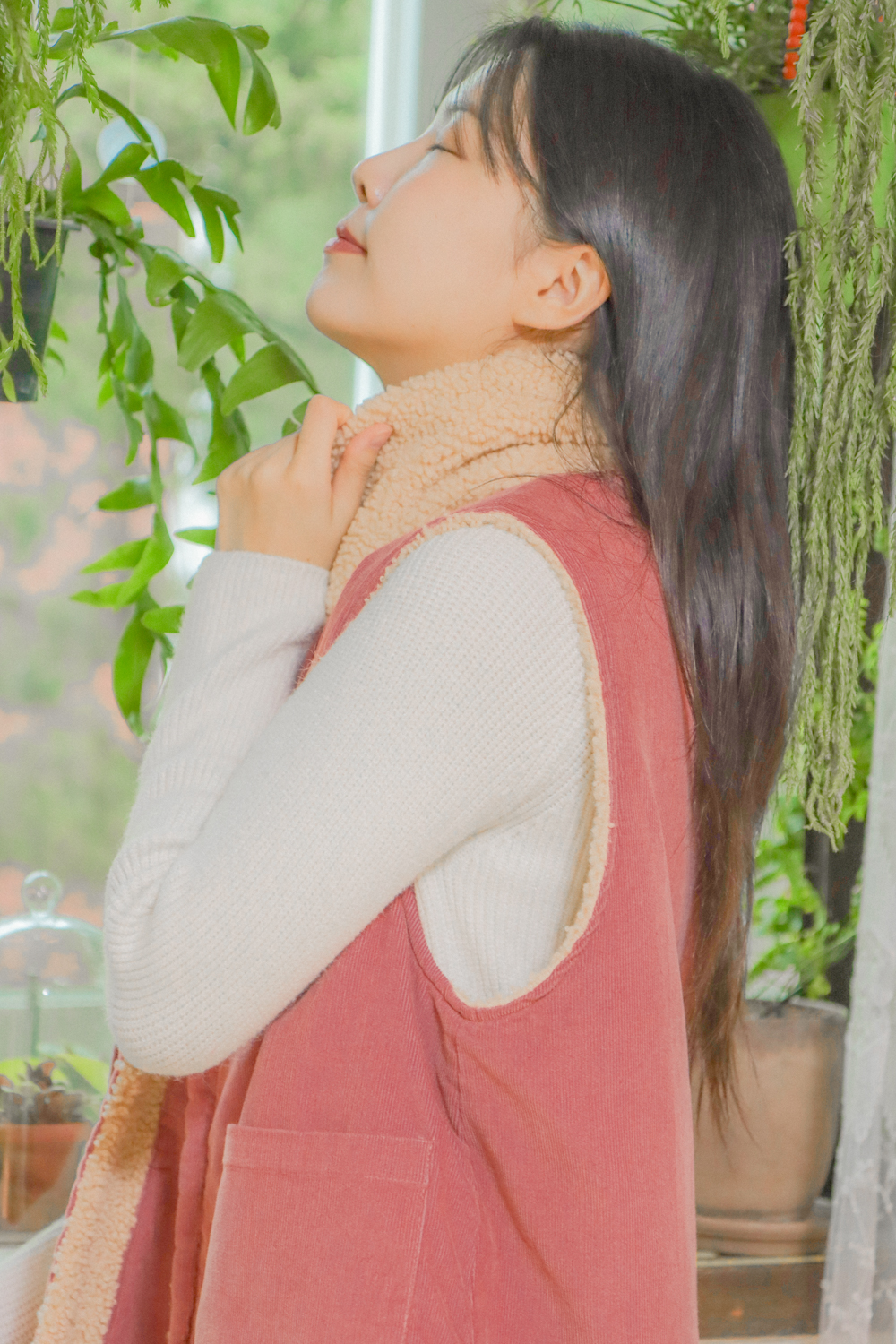 与温暖的毛绒围巾相配,更加提升温馨氛围的背心。无需额外费用,成套提供就是这样。