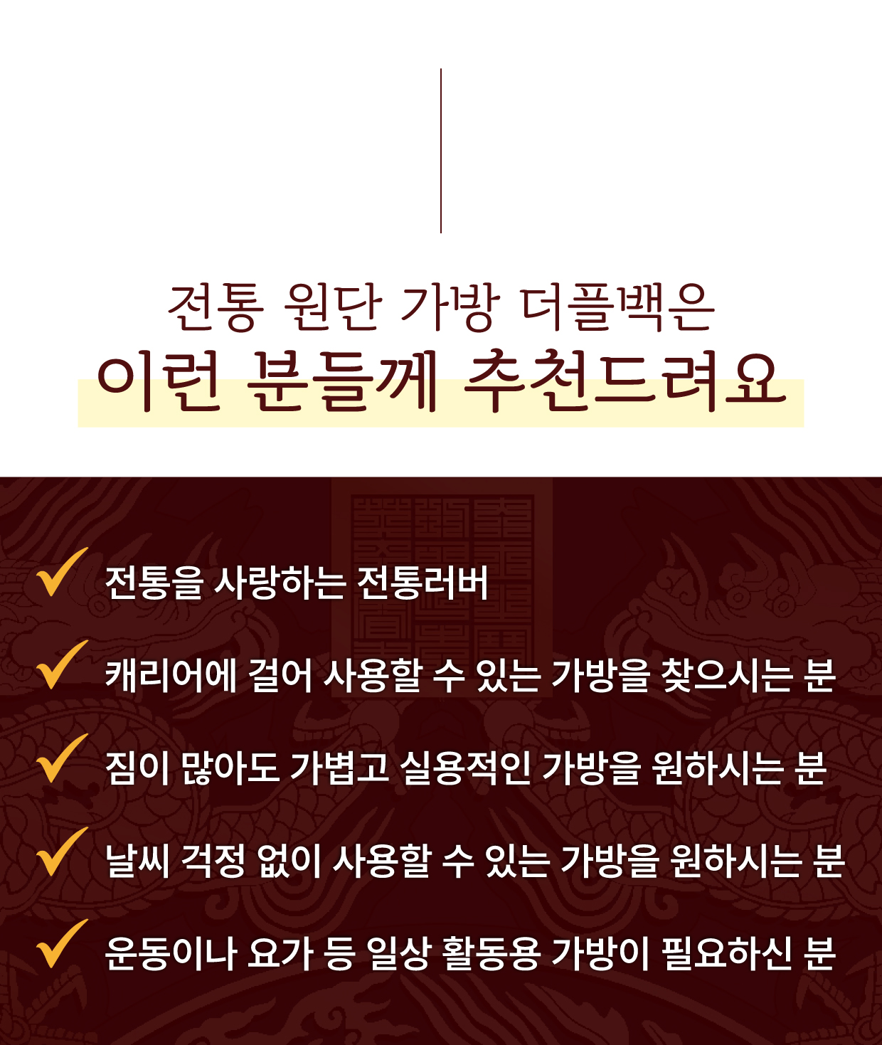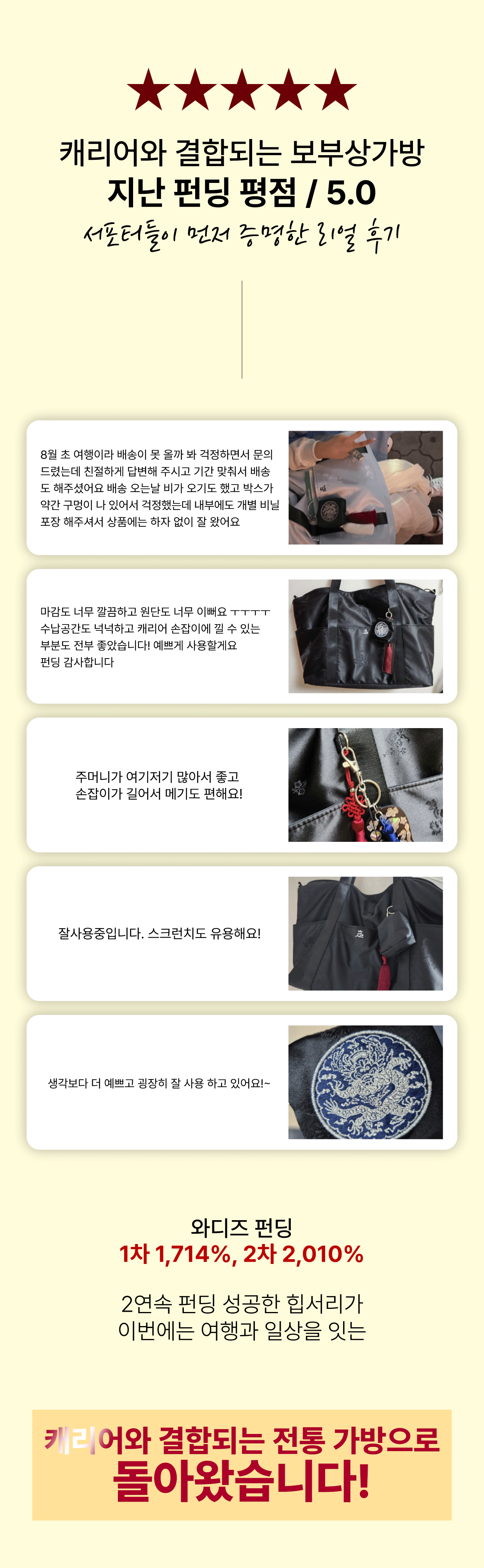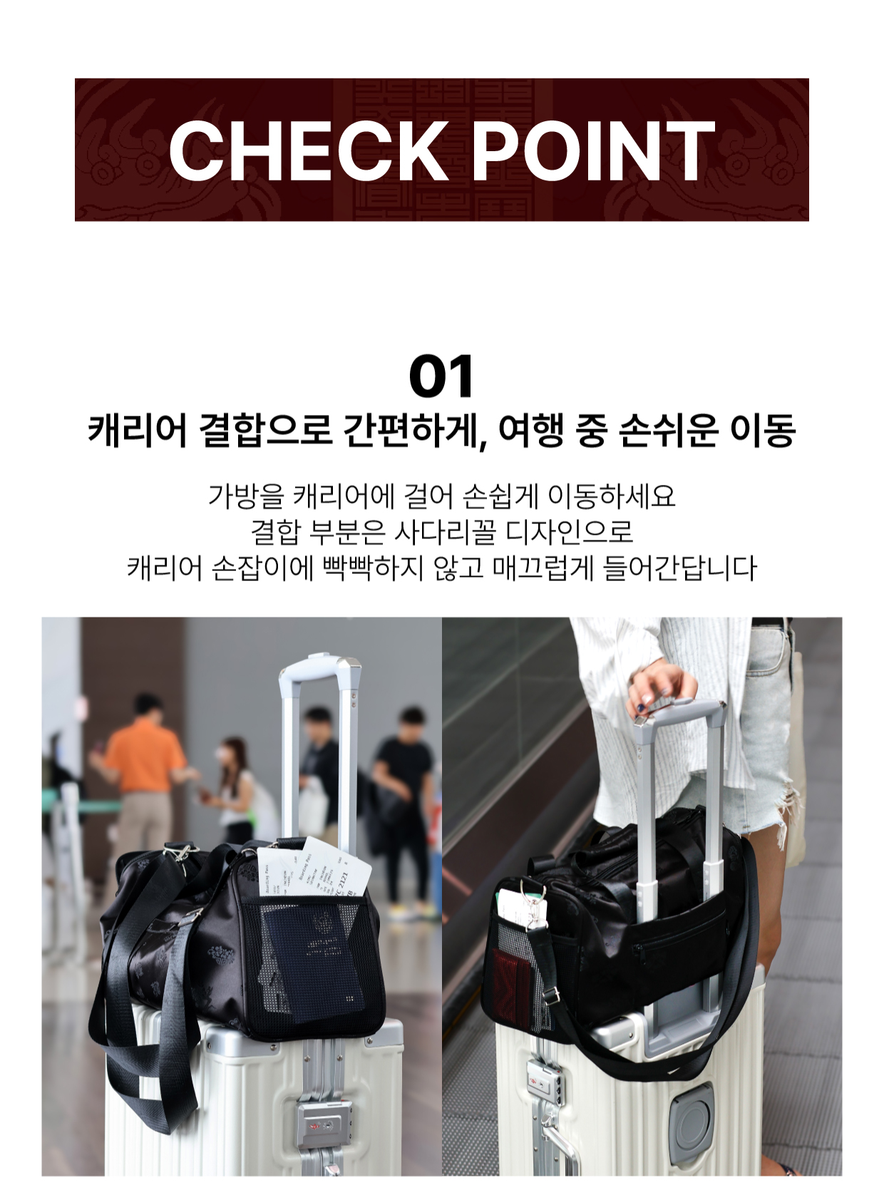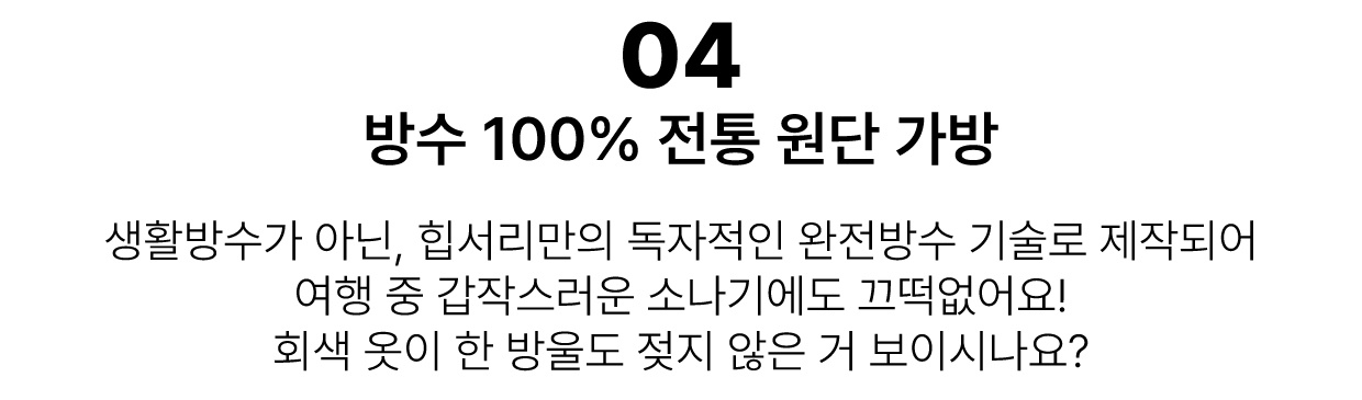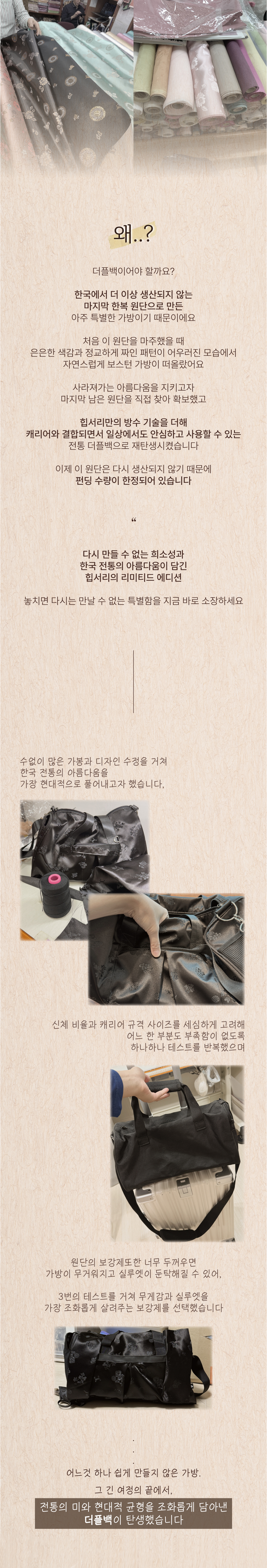 1. 🎒 传统面料旅行包 - 采用韩国最后韩服面料限量制作 2. 💧 防水功能 - Hipseri独家完全防水技术保护内部 3. 🧳 行李箱连接设计 - 可轻松连接行李箱手柄,方便旅行
