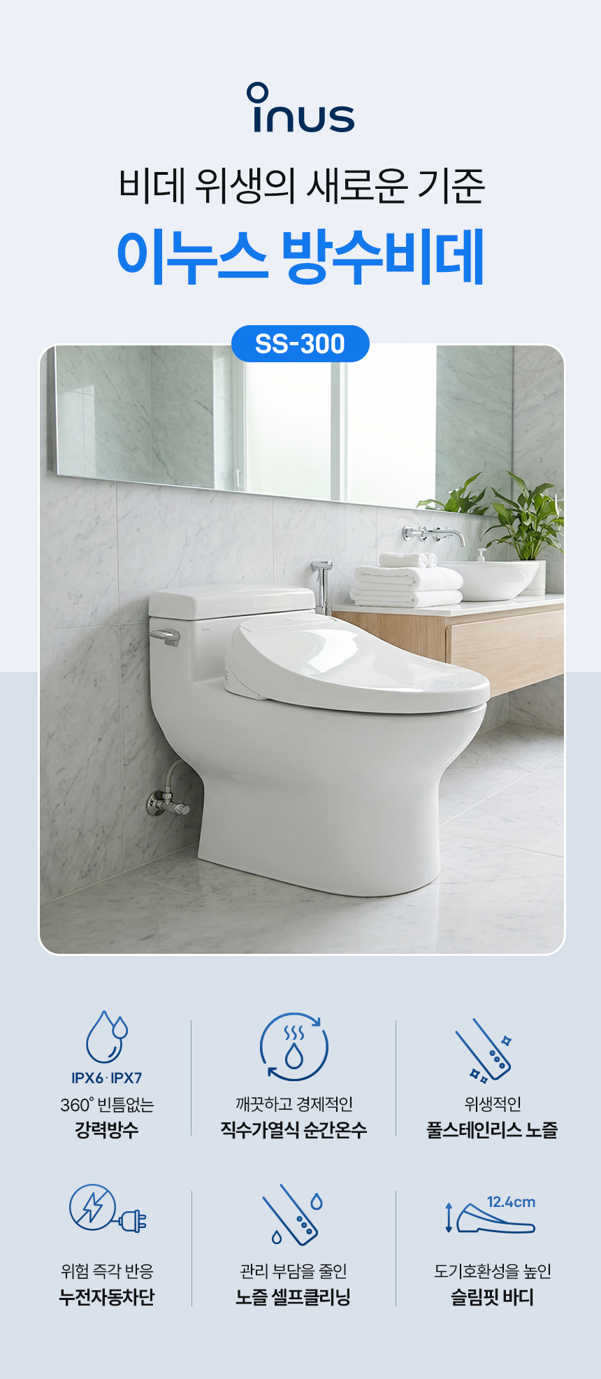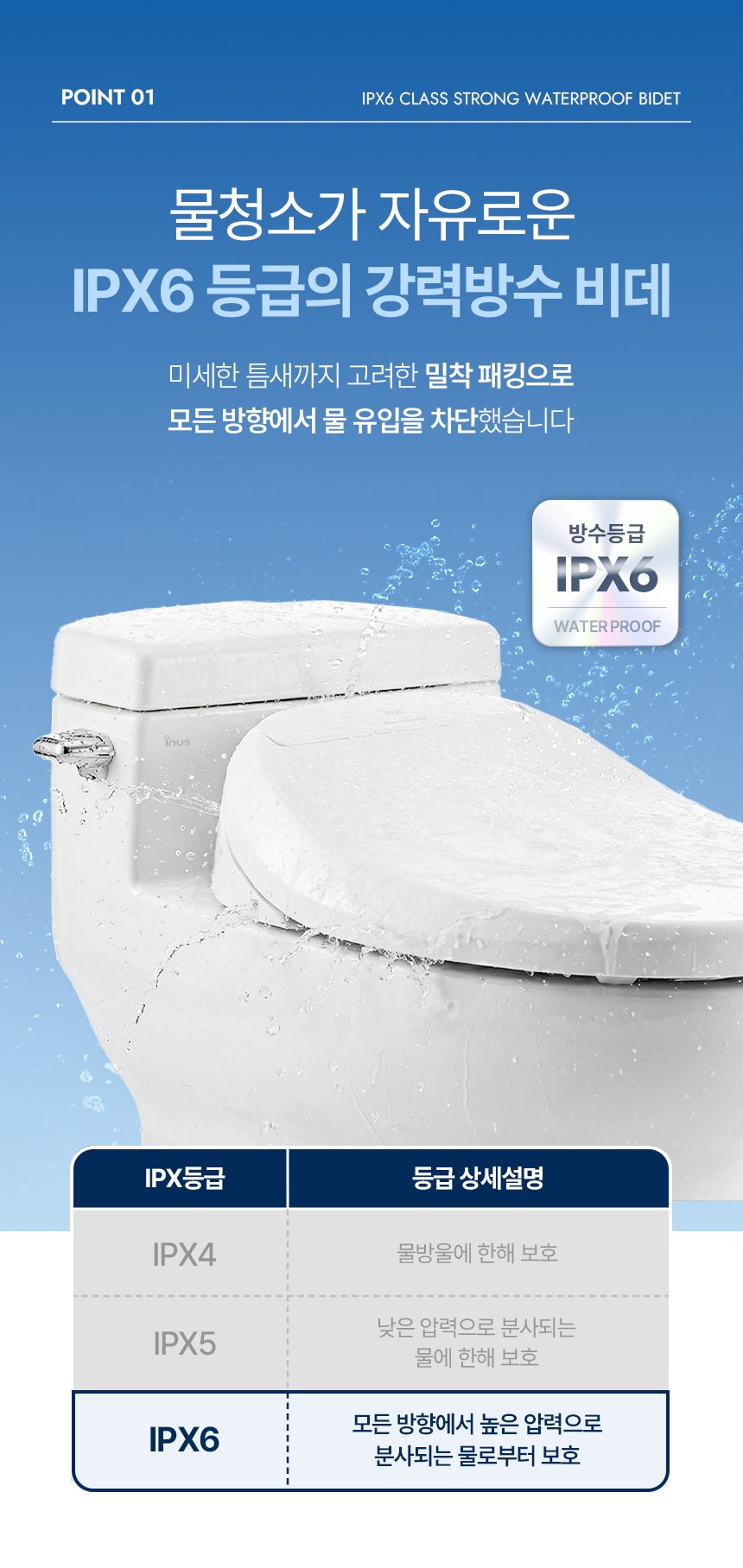 기존 비데 방수 등급은 생활방수(ipx4등급)만 가능했기 때문에 물청소를 할 수 없다는 불만이 강하여 물청소가 가능한 비데를 만들자는 생각으로 개발을 진행하게 되었습니다.