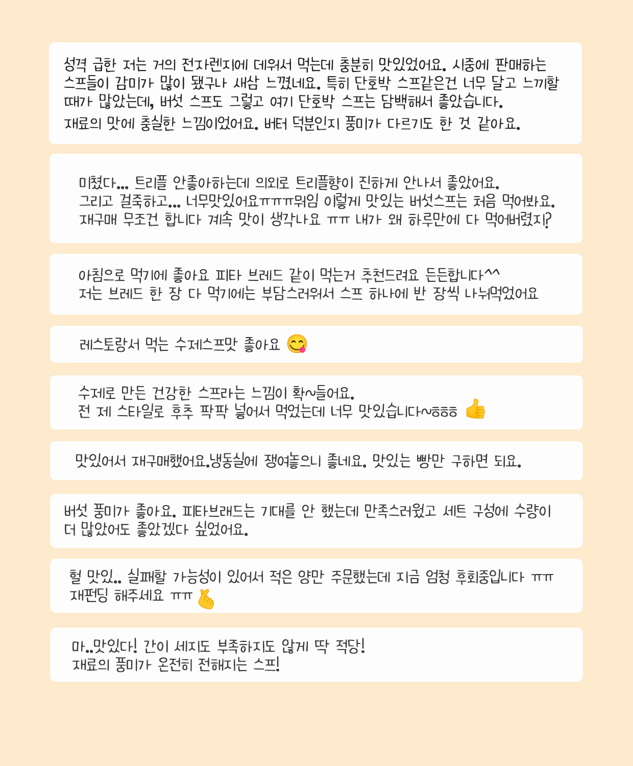 스프는 4개가 한세트로 4개단위로 선택이 가능하며, 피타브레드 구성유무에 따라 세트구성이 다르니 피타브레드와 세트구성을 원하시는 경우 pita set를 스프만으로 이루어진 구성을 원하시는 경우 soup set를 후원해주세요!