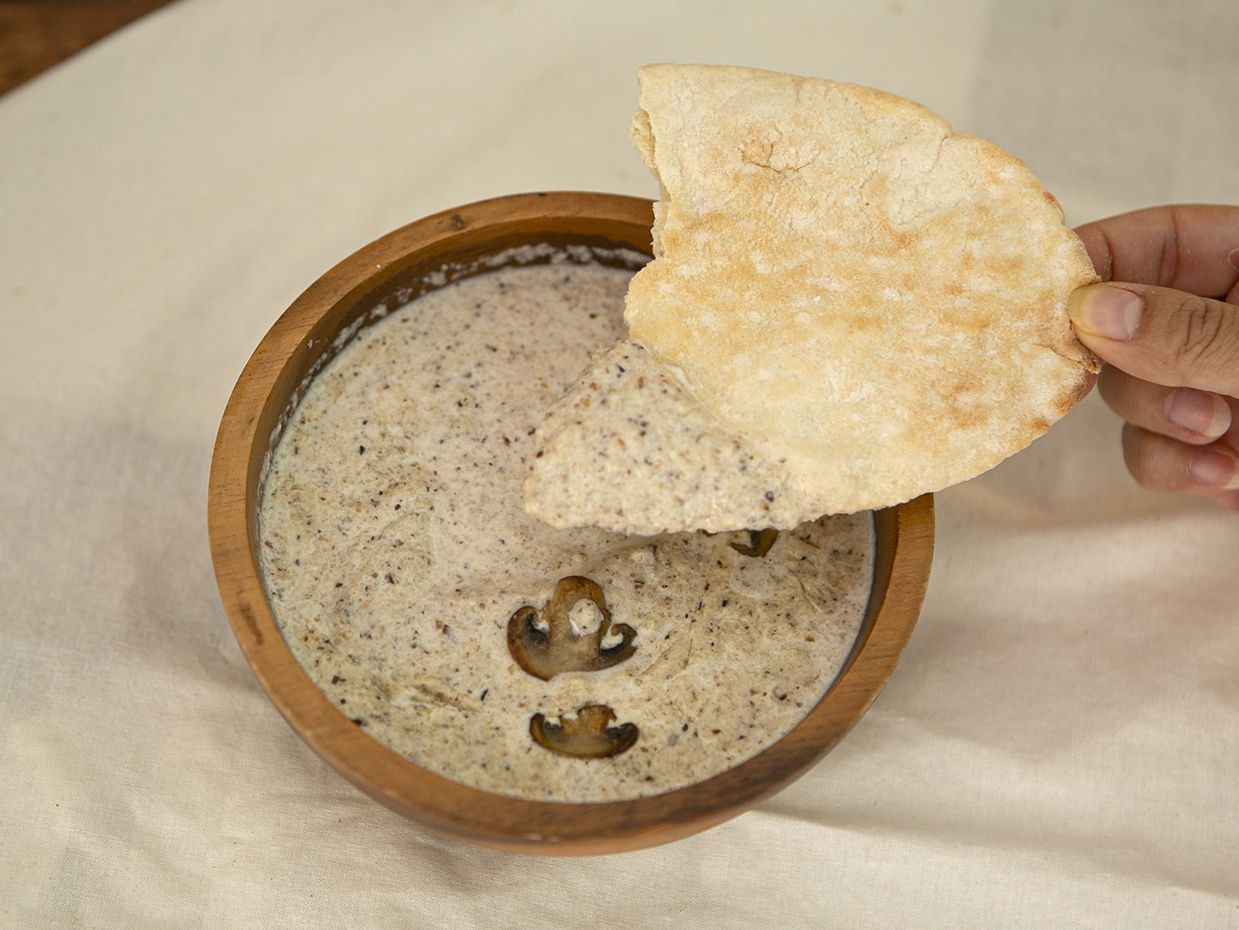 통밀과 소금으로 만들어져 투박하지만 단백한 맛이 매력적이에요, 쫀득쫀득한 식감으로 스프에 찍어드시거나 스프에 있는 소고기나 양배추등의 건더기를 안에 넣어 드시면 샌드위치처럼도 즐기실수 있어요.