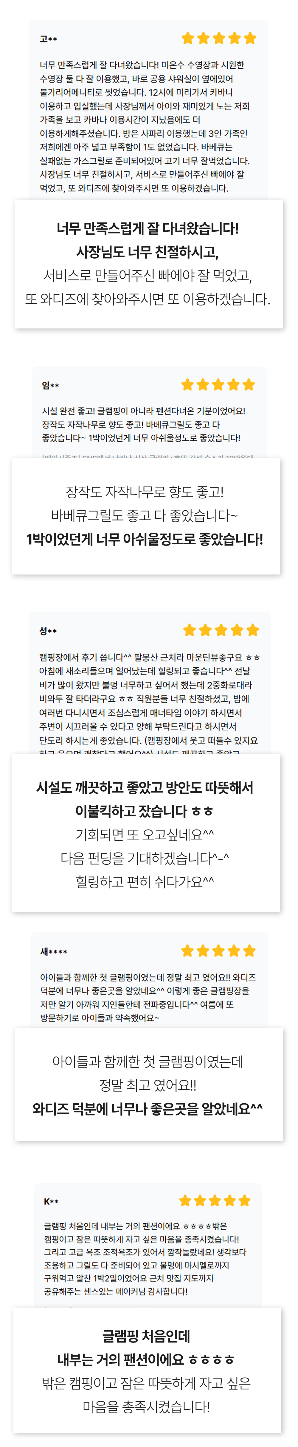 가족과 함께 숙소 바로 앞 캠핑존에서 함께 맛있는 것을 즐기며 도란도란 떠들면, 이보다 행복한 시간은 없을 겁니다.