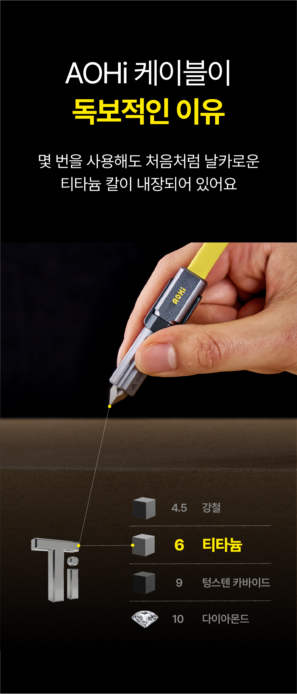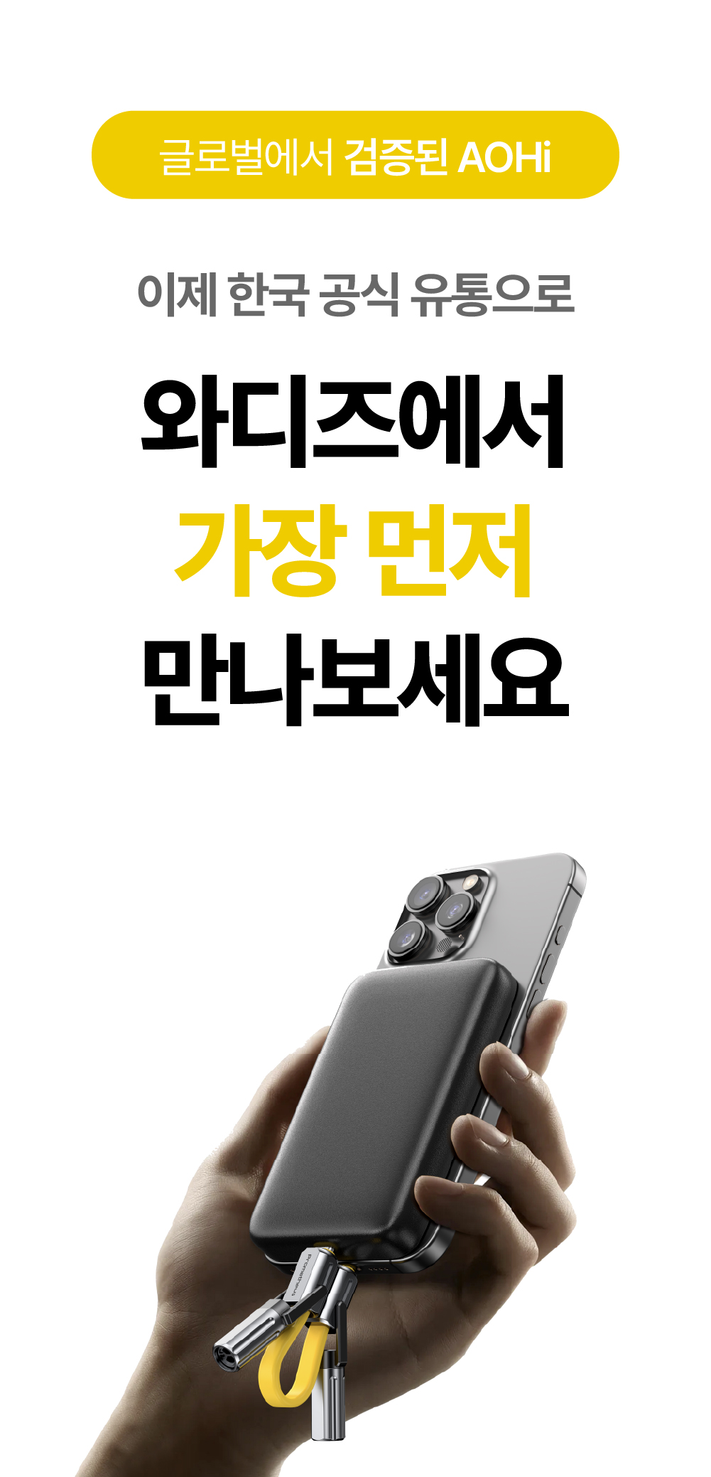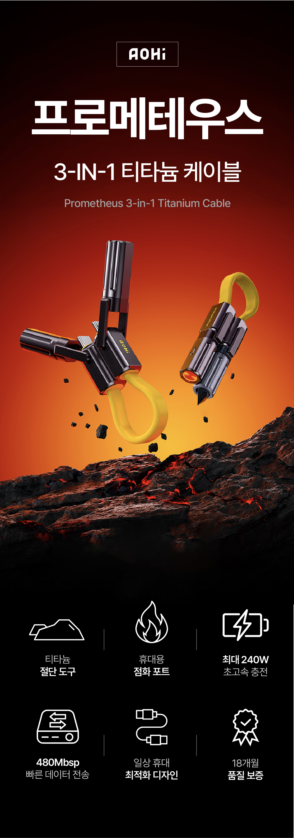 이제 AOHi는 티타늄 소재와 멀티 툴 기능을 결합한 3in1 케이블을 통해, 일상의 데스크 위부터 거친 아웃도어 환경까지 아우르는 '세상에 없던 진화된 연결'을 선보입니다. 글로벌 시장이 선택한 압도적인 기술력과 타협하지 않는 품질, 그 혁신적인 결과물을 지금 와디즈에서 직접 경험해 보시기 바랍니다.