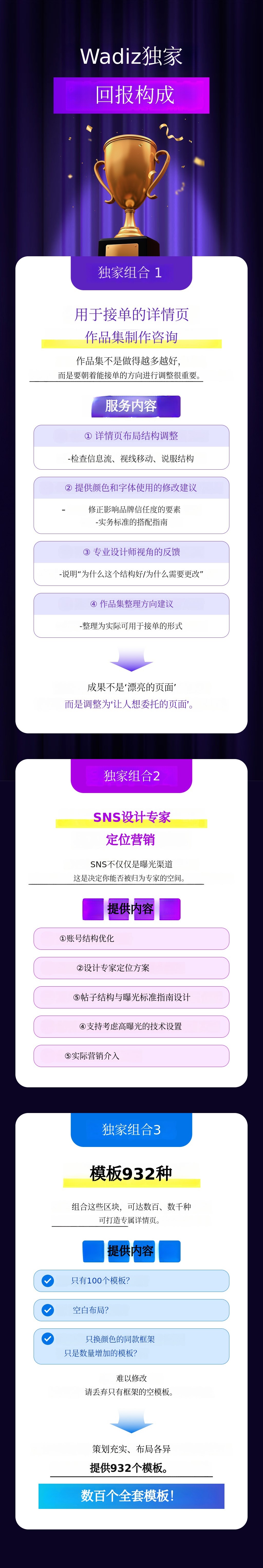 1. 📄 详细页面与作品集咨询 - 实务课程支持可持续盈利结构设计 2. 🚀 SNS广告营销支持 - 提供品牌推广与变现实战经验 3. 🔧 丰富模板与教育内容 - 包含932模板、71讲座及电子书