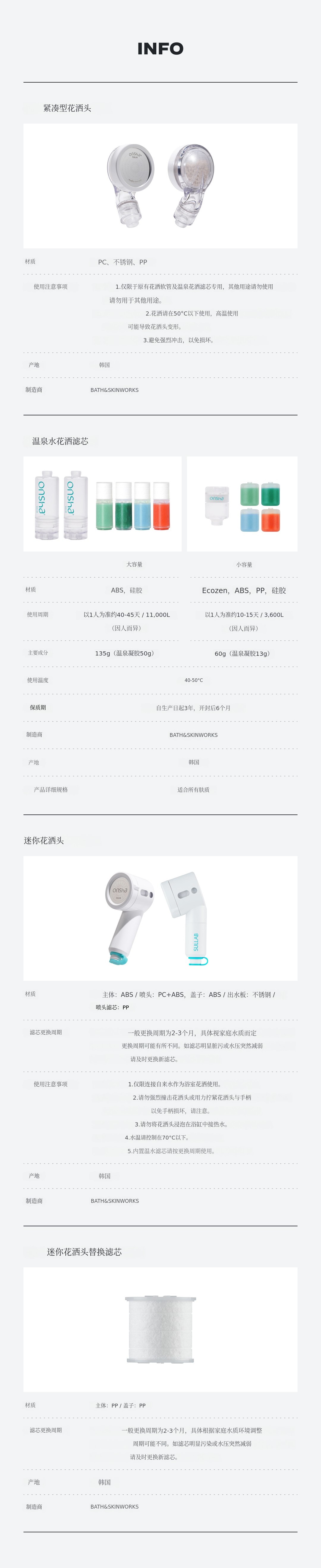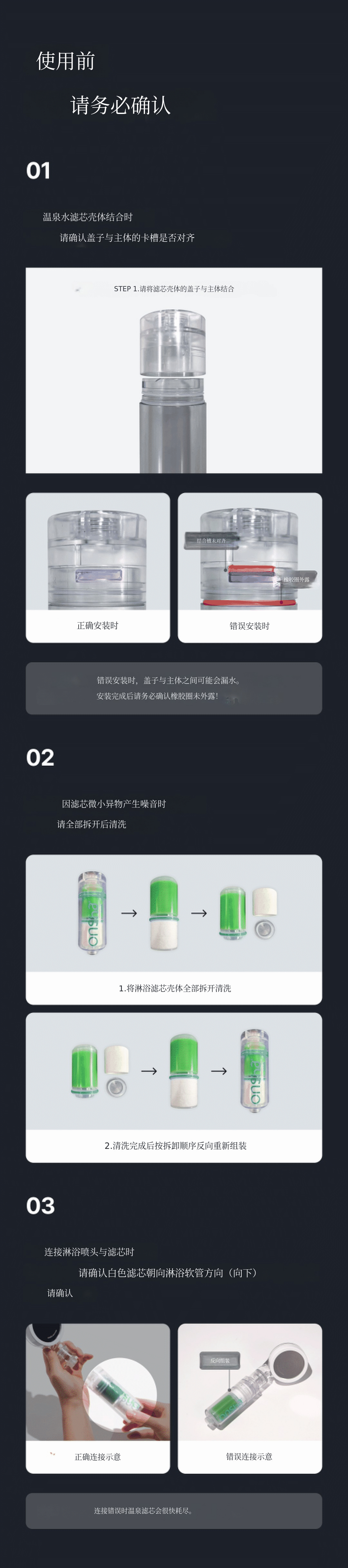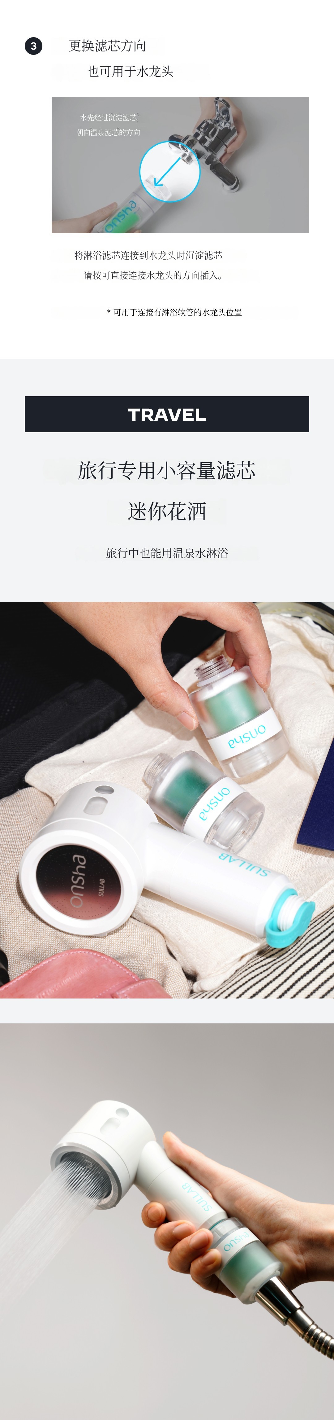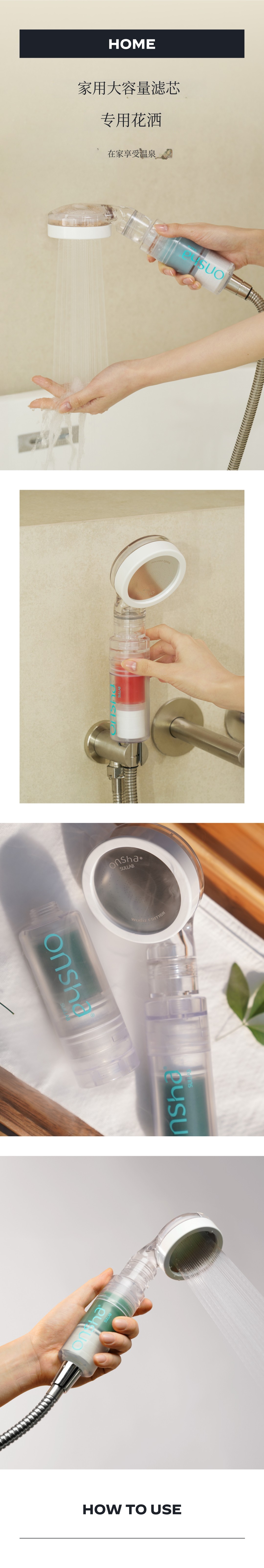 A. 只需购买温泉滤芯,即可与所有国际标准规格的花洒兼容。但如果使用带有开关选项的花洒,可能因内部压力而分离,建议使用专用花洒。