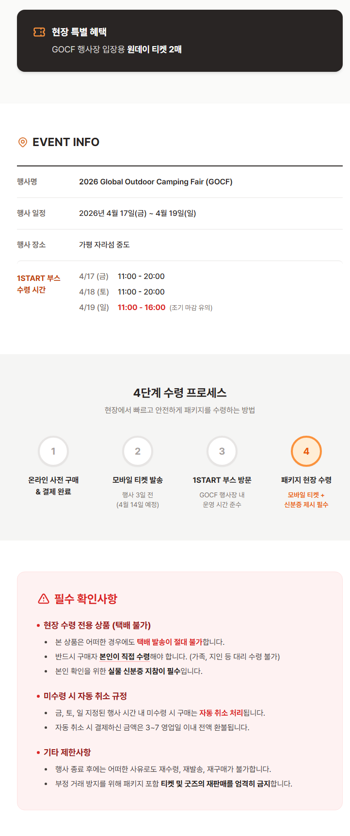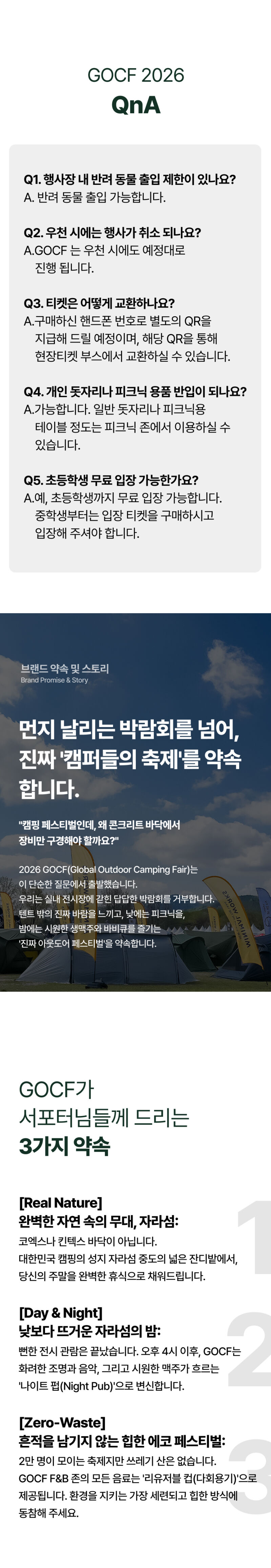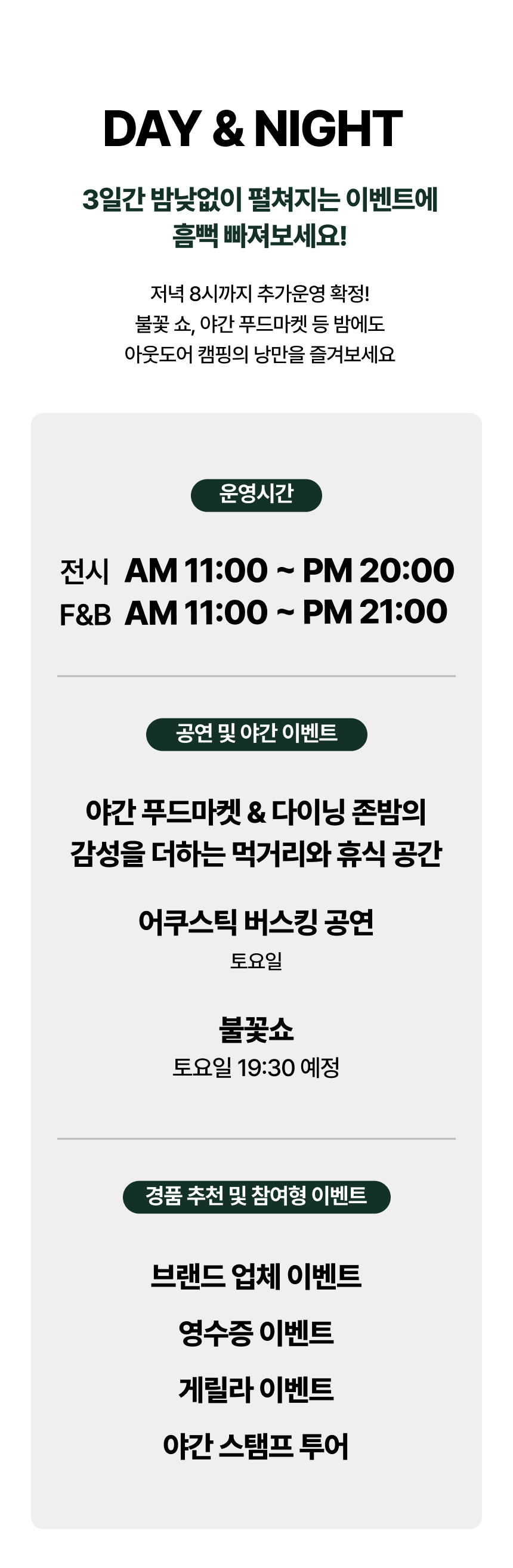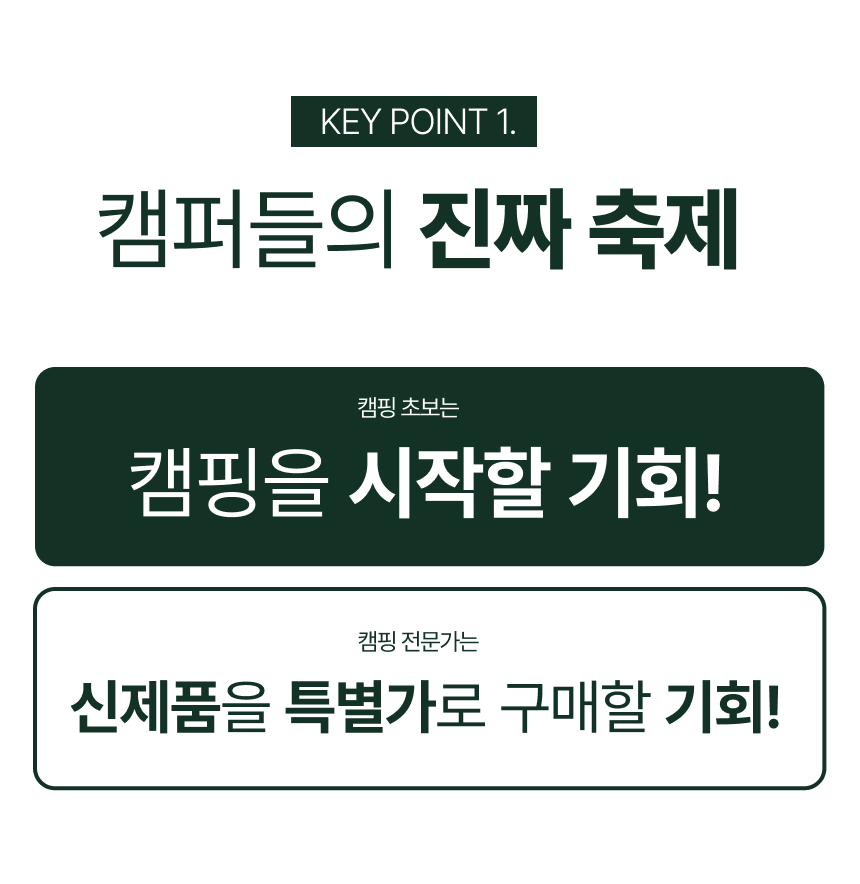 1. 🏕️ 全球户外露营展 - 在加平Jarasum举办的为期三天大型露营节 2. 🌙 昼夜活动 - 提供多样体验、表演和美食 3. 🎟️ 独家支持者福利 - 免费班车和限量票券