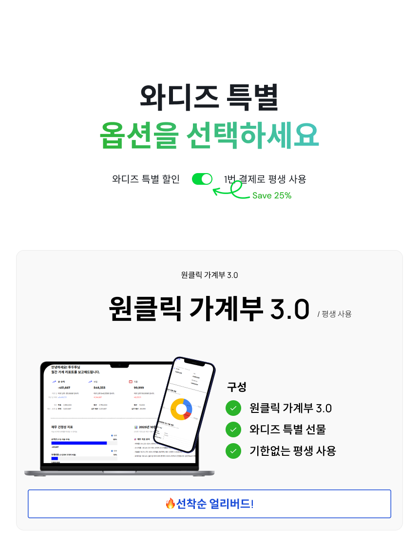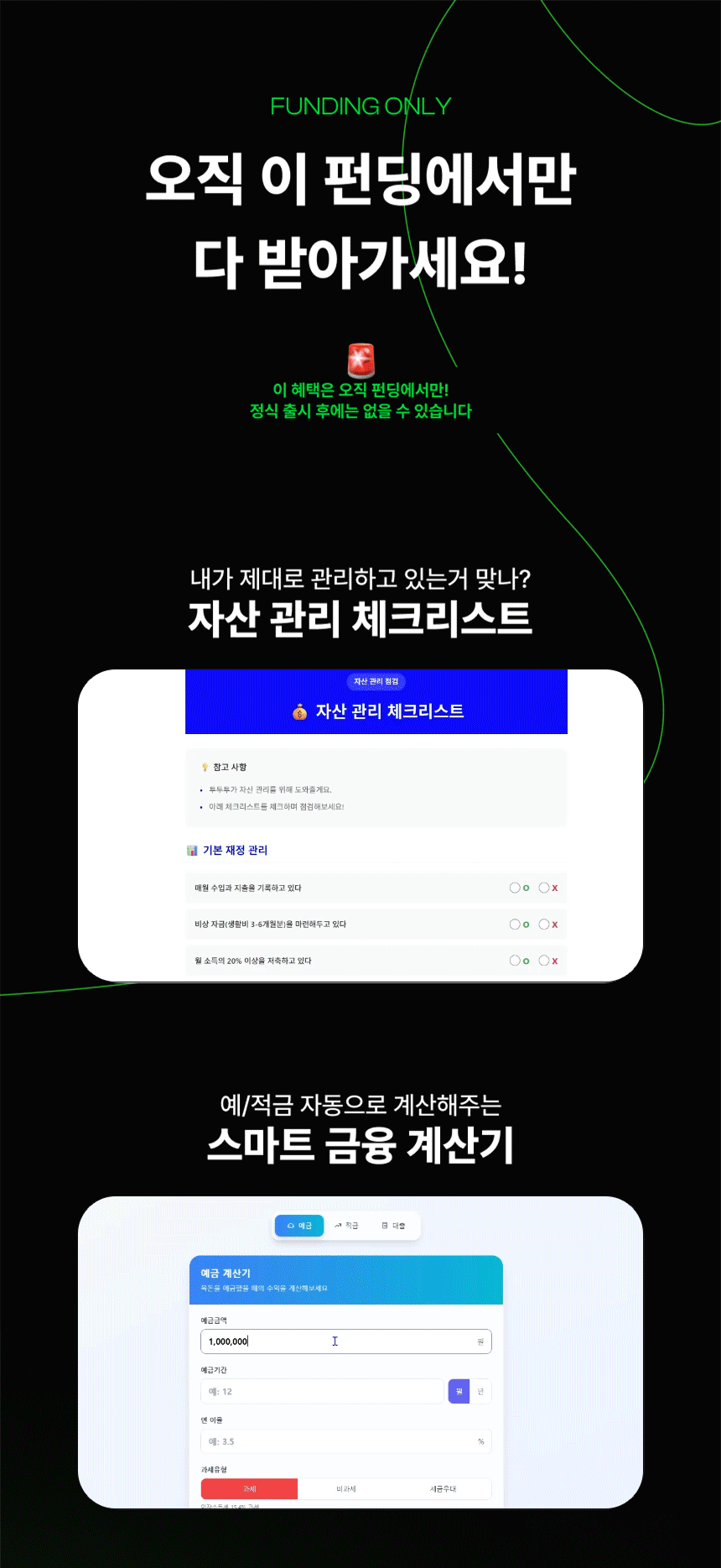1. 📊 AI驱动一键记账本 - 一键自动资产分析与个性化理财建议 2. 💡 全面财务管理方案 - 整合贷款、保险、储蓄等多项管理 3. 🎁 Wadiz独家优惠 - 促销码免费领取及理财指南赠送