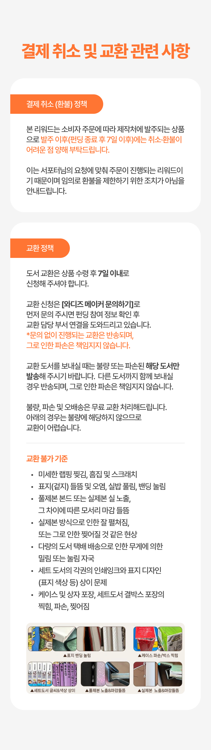 - 상품 오염 및 파손, 사용흔적이 있는 경우, 비닐포장 훼손, 전집의 전용박스를 개봉 및 훼손하신 경우 등은 교환이 불가합니다.