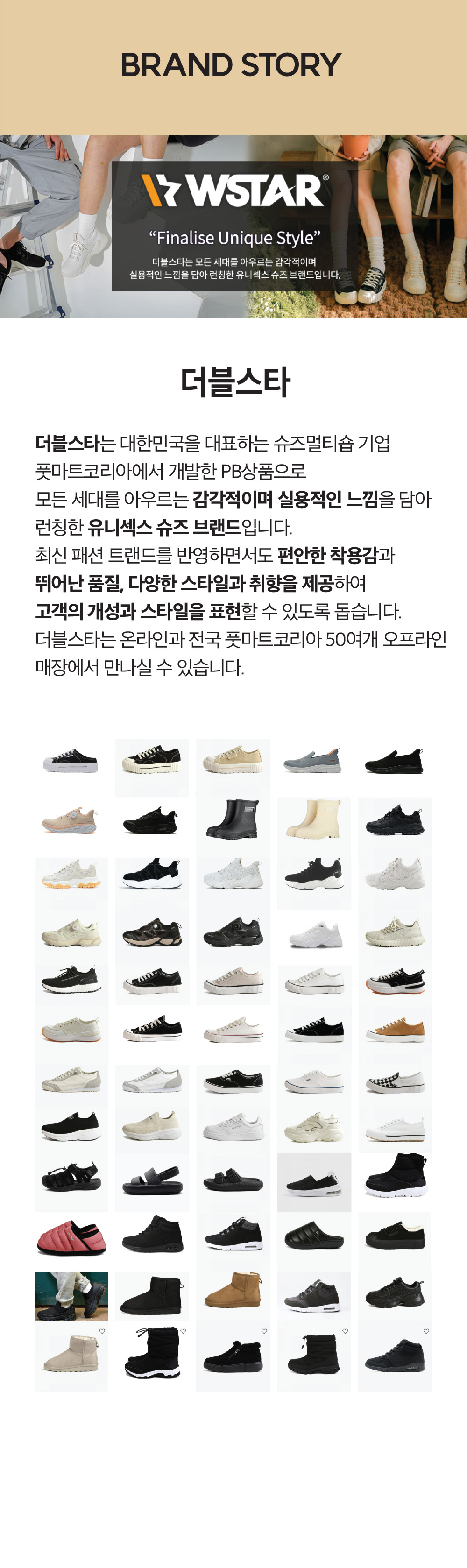 더블스타는 대한민국을 대표하는 슈즈멀티숍 기업 풋마트코리아에서 개발한 PB상품으로 모든 세대를 아우르는 감각적이며 실용적인 느낌을 담아 런칭한 유니섹스 슈즈 브랜드입니다. 최신 패션 트랜드를 반영하면서도 편안한 착용감과 뛰어남 품질, 다양한 스타일과 취향을 제공하여 고객의 개성과 스타일을 표현할 수 있도록 돕습니다. 더블스타는 온라인과 전국 풋마트코리아 50여개 오프라인 매장에서 만나실 수 있습니다.